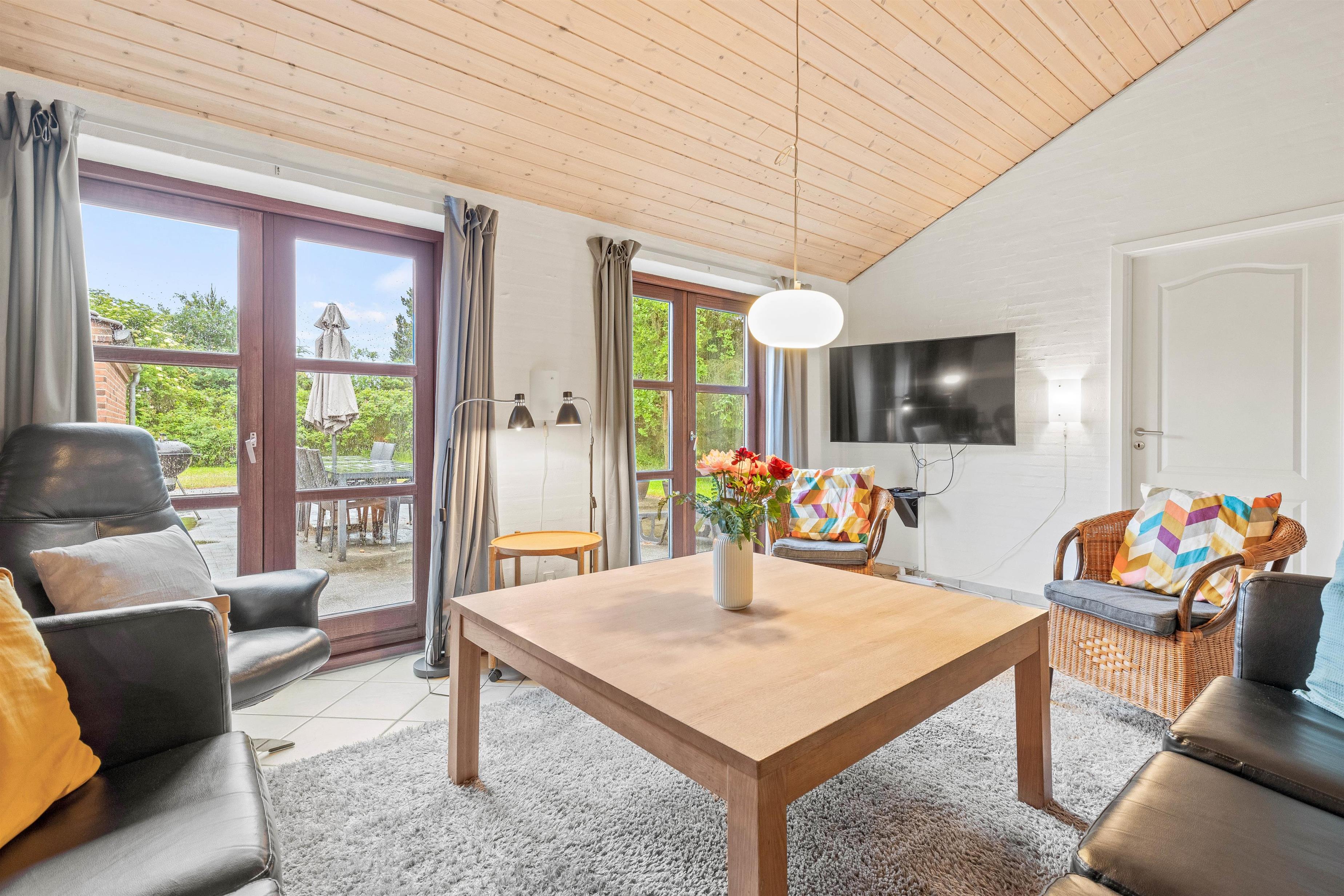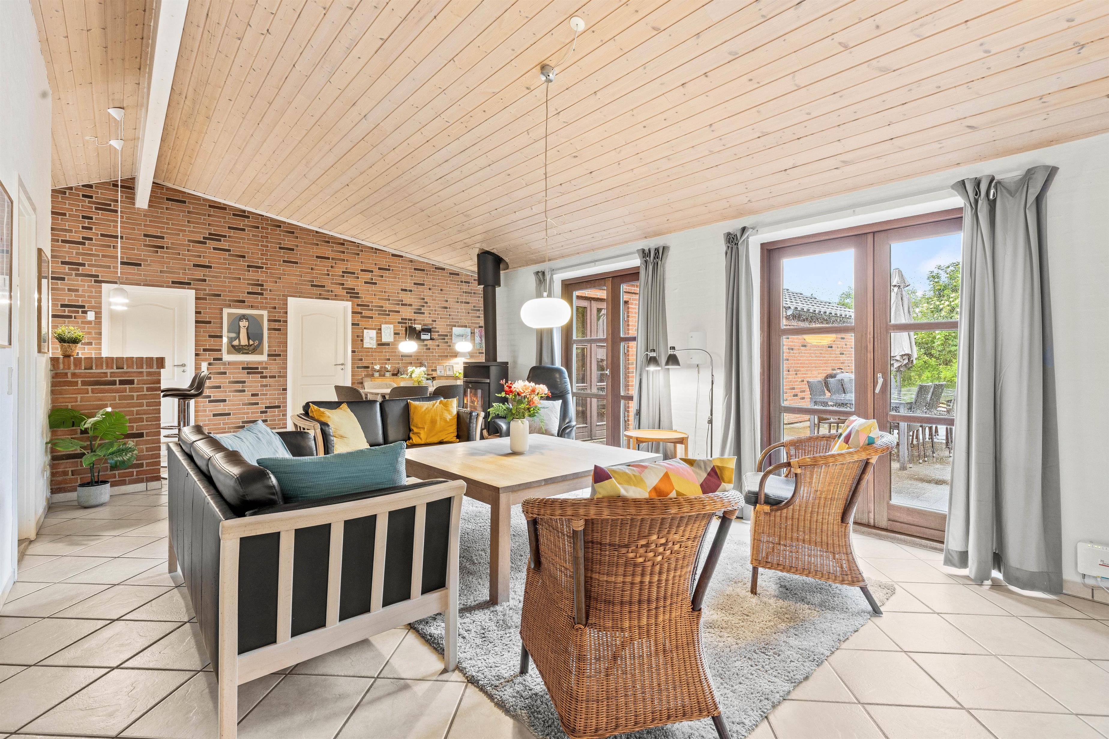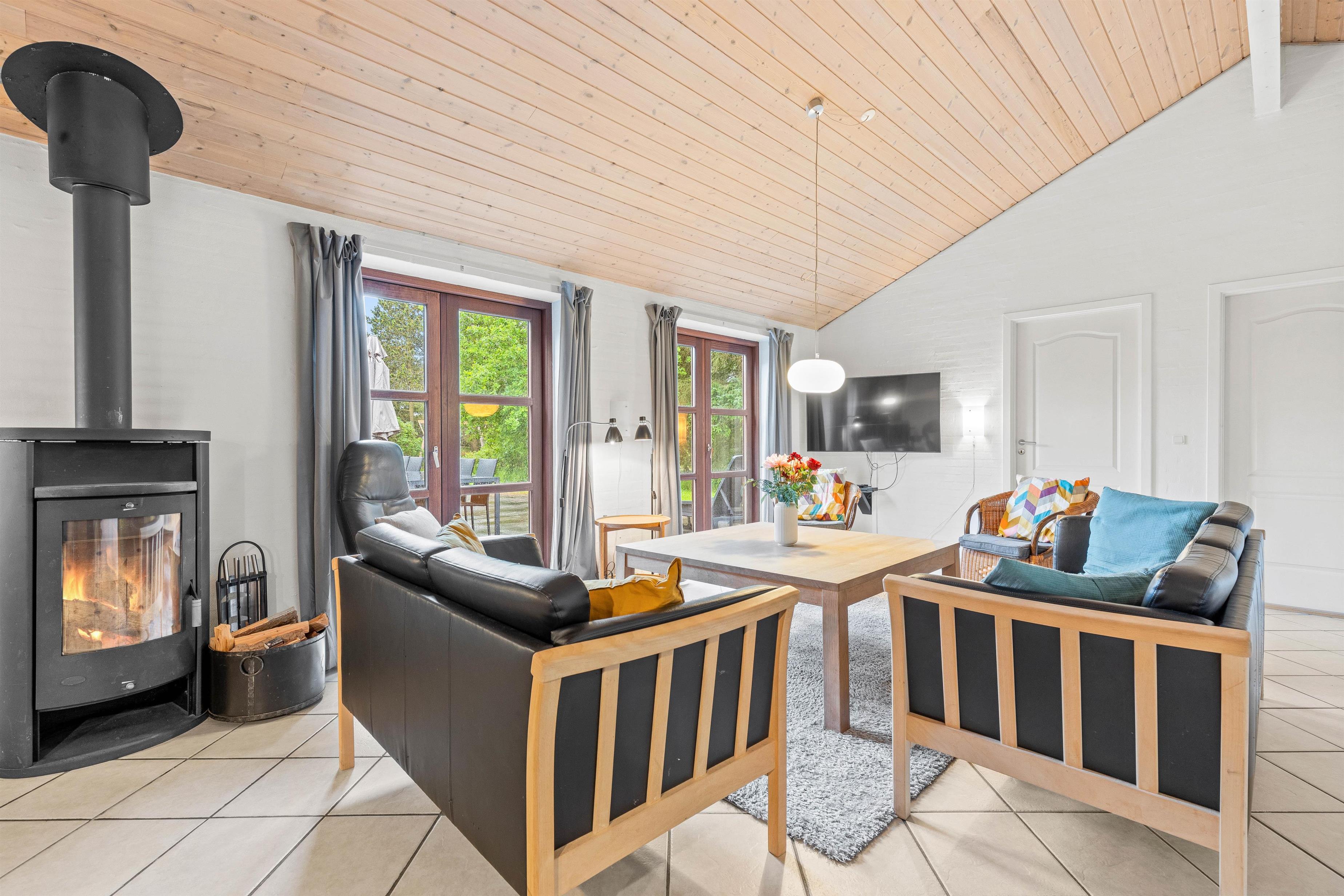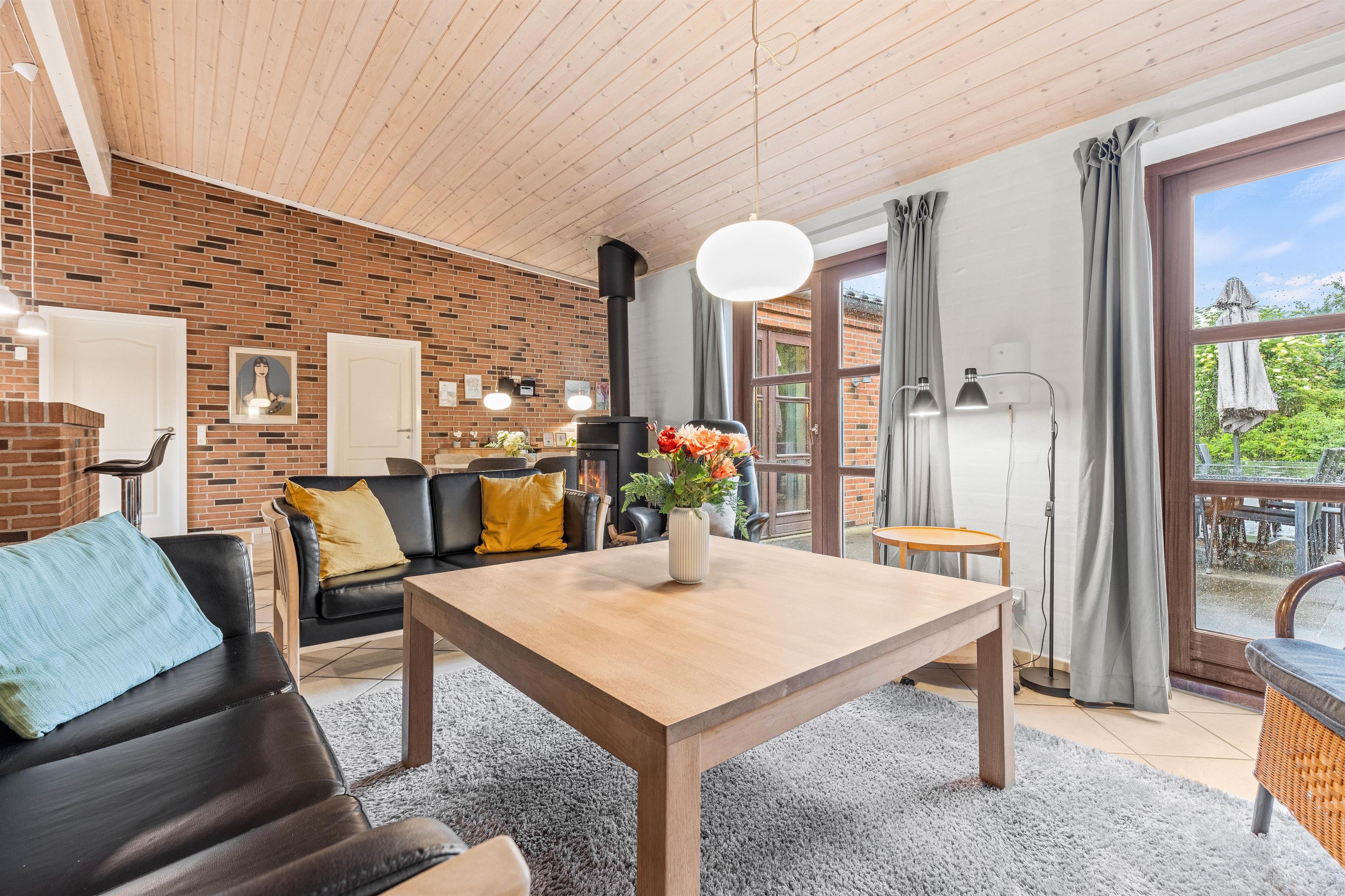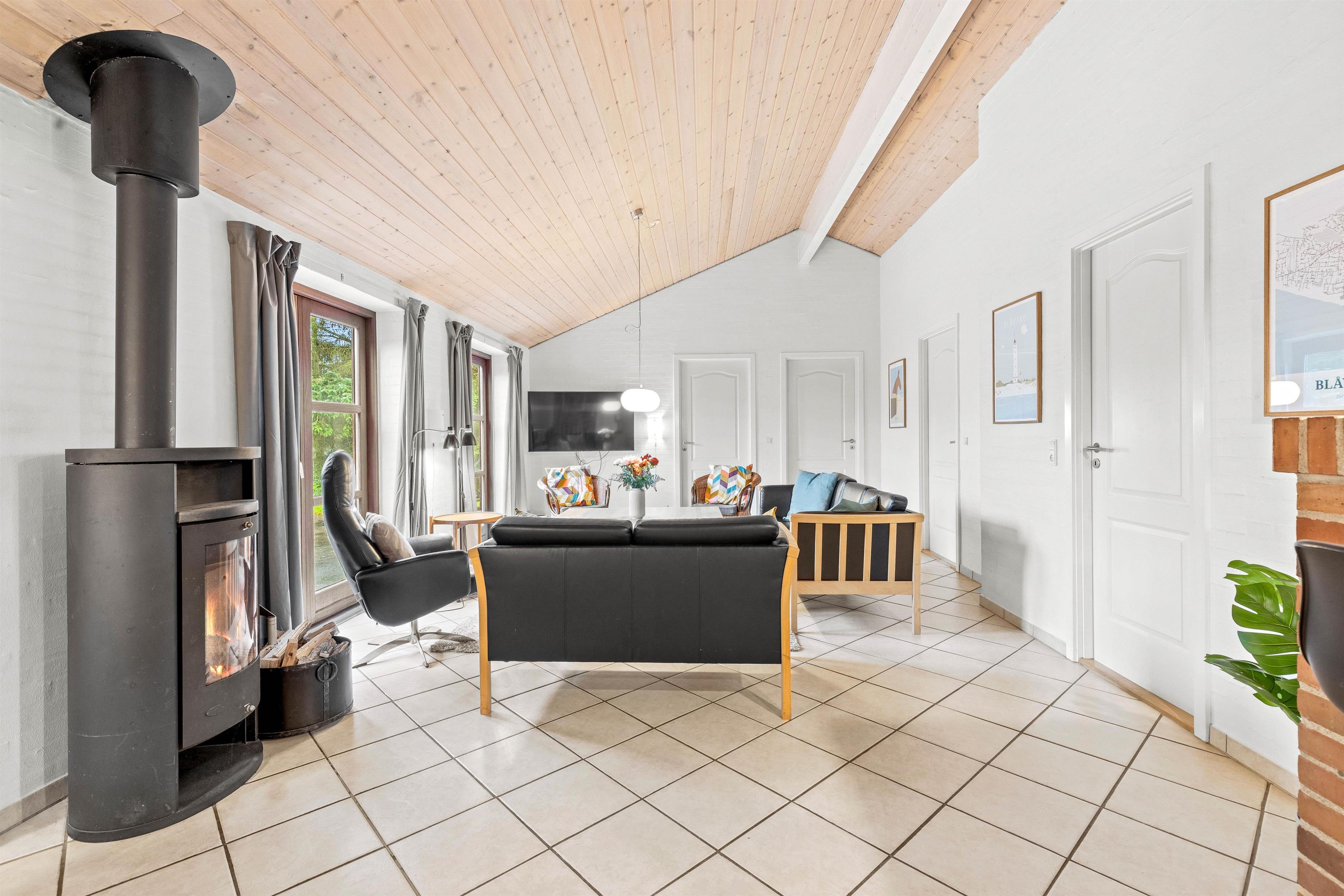 Lys og hjemlig indretning med brændeovn, stor terrasse og græsplæne