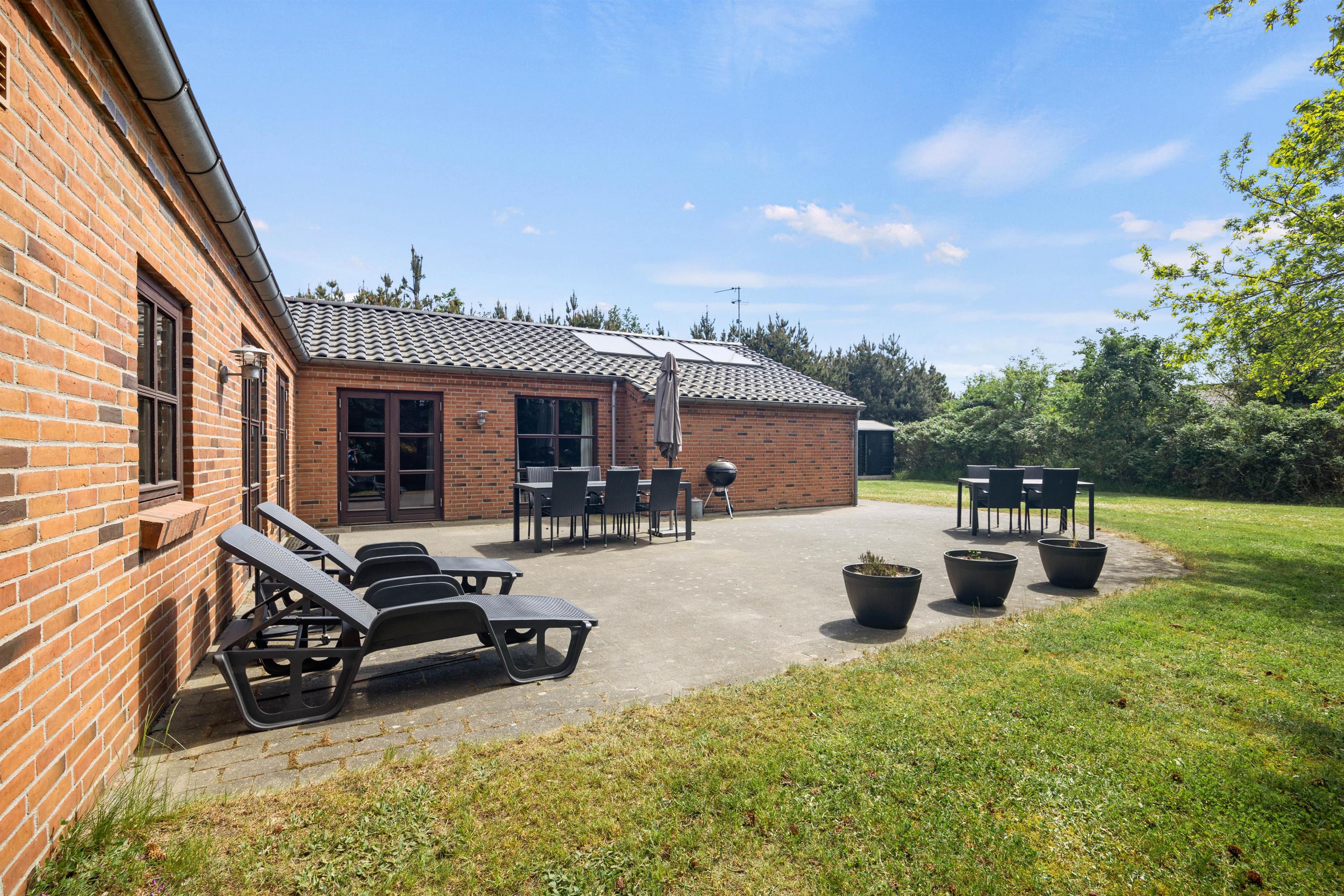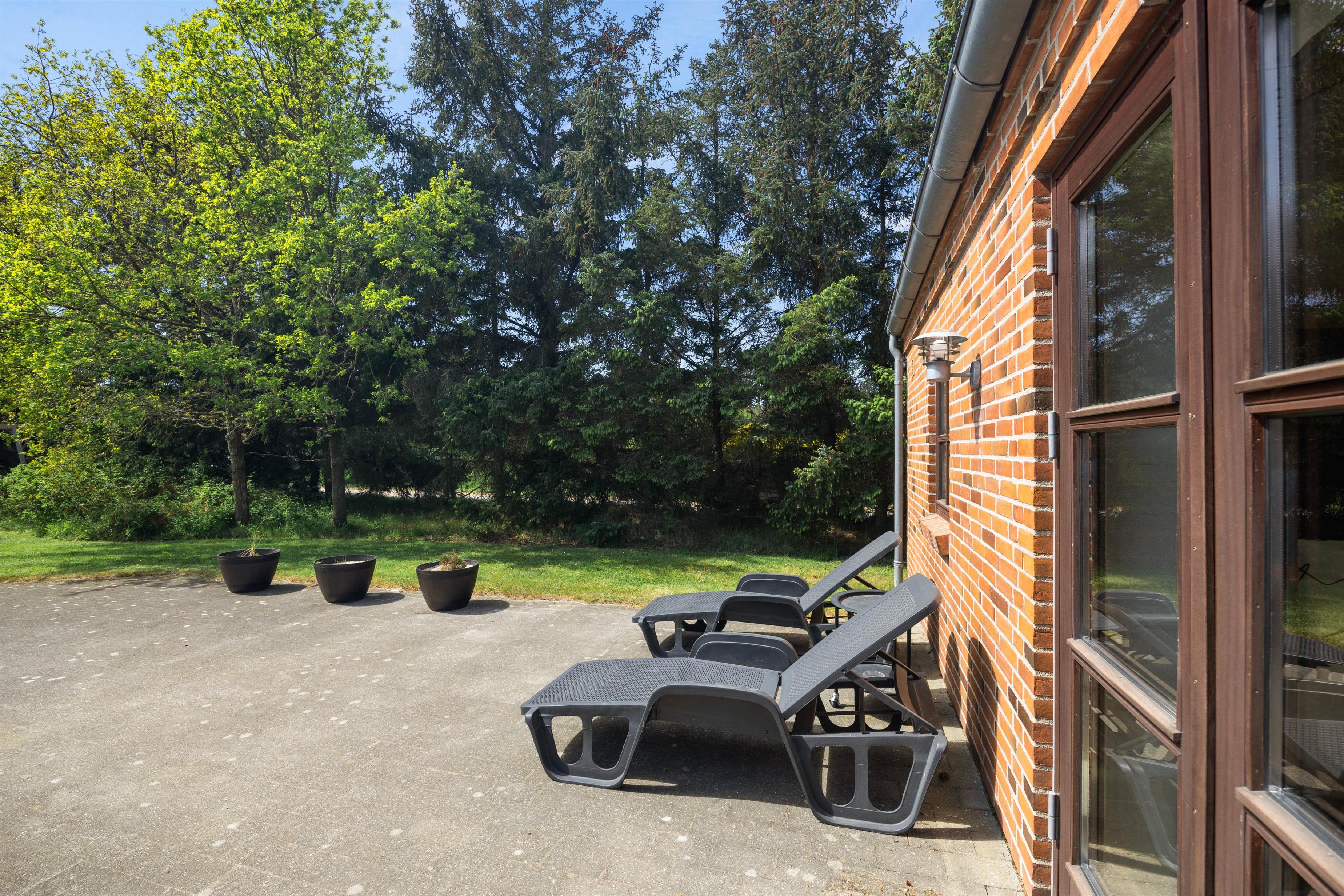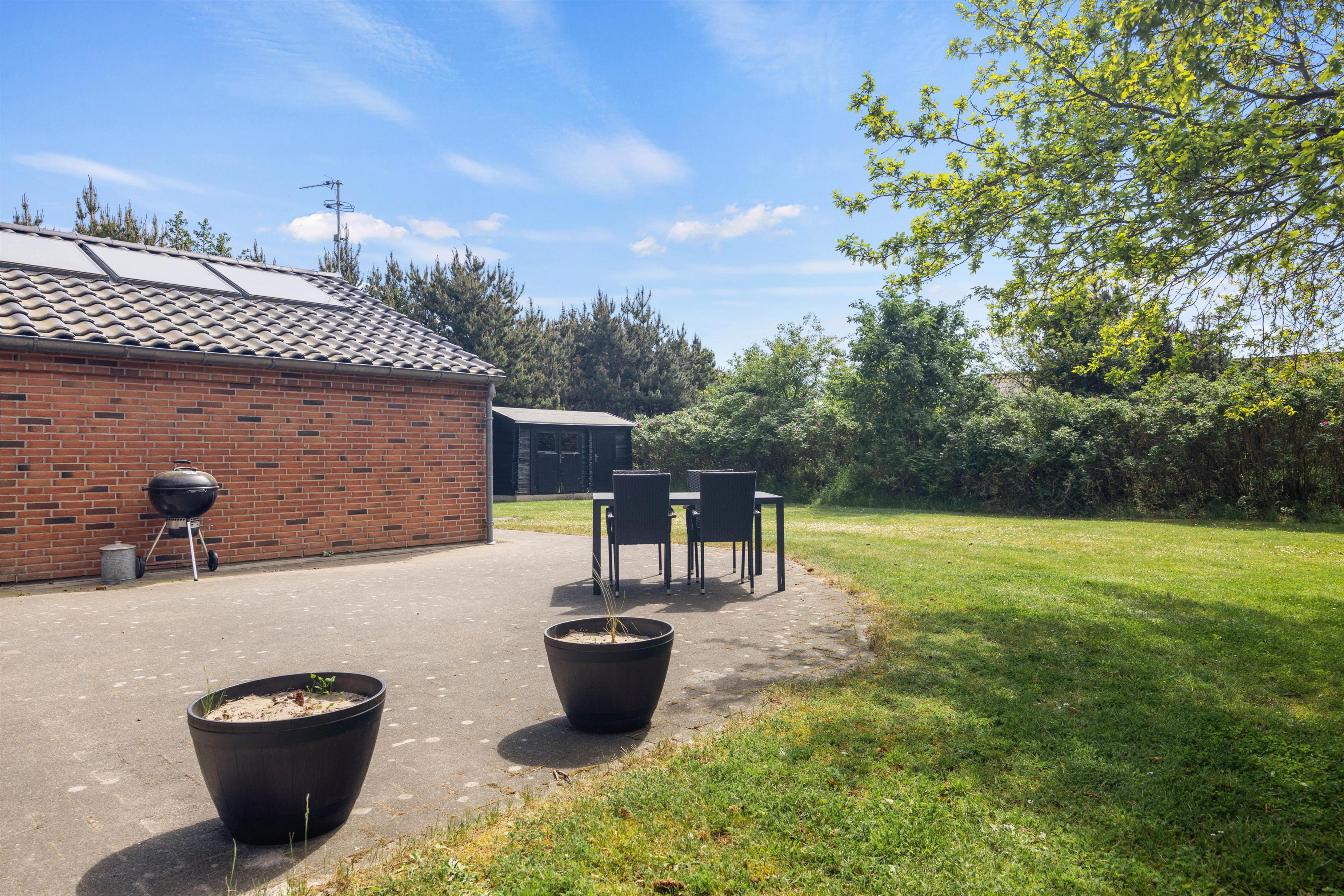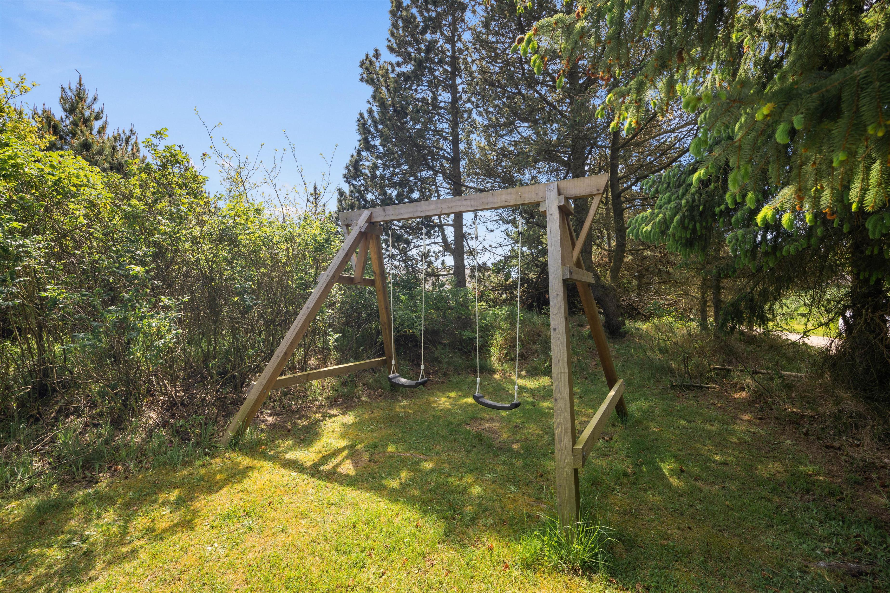 De dejlige solskinsdage kan nydes på den store flisebelagte terrasse. Børnene vil elske at lege og spille bold på den velholdte græsplæne, mens I slapper af i liggestolene, og til glæde for de yngste familiemedlemmer er der et gyngestativ på grunden.