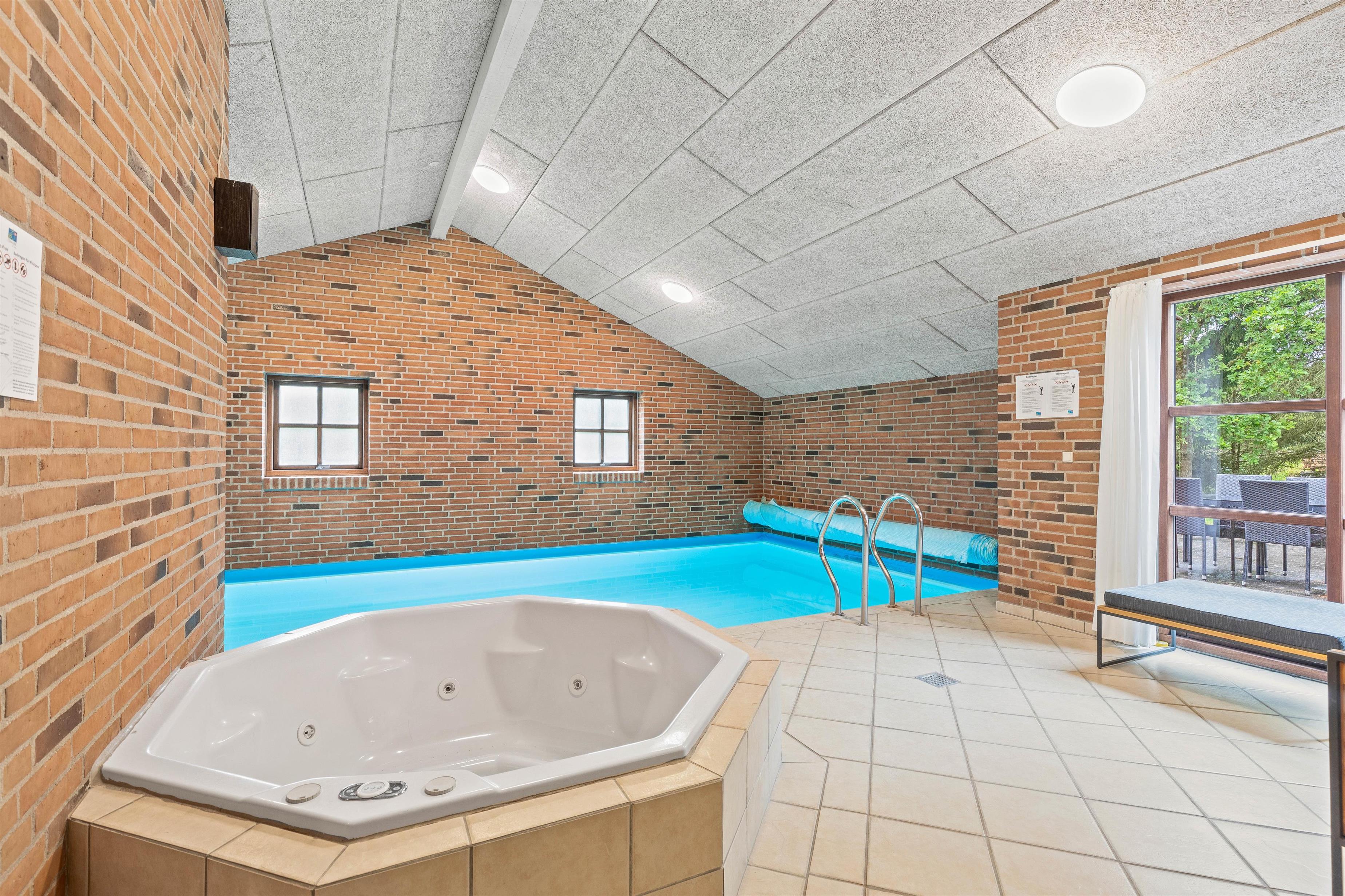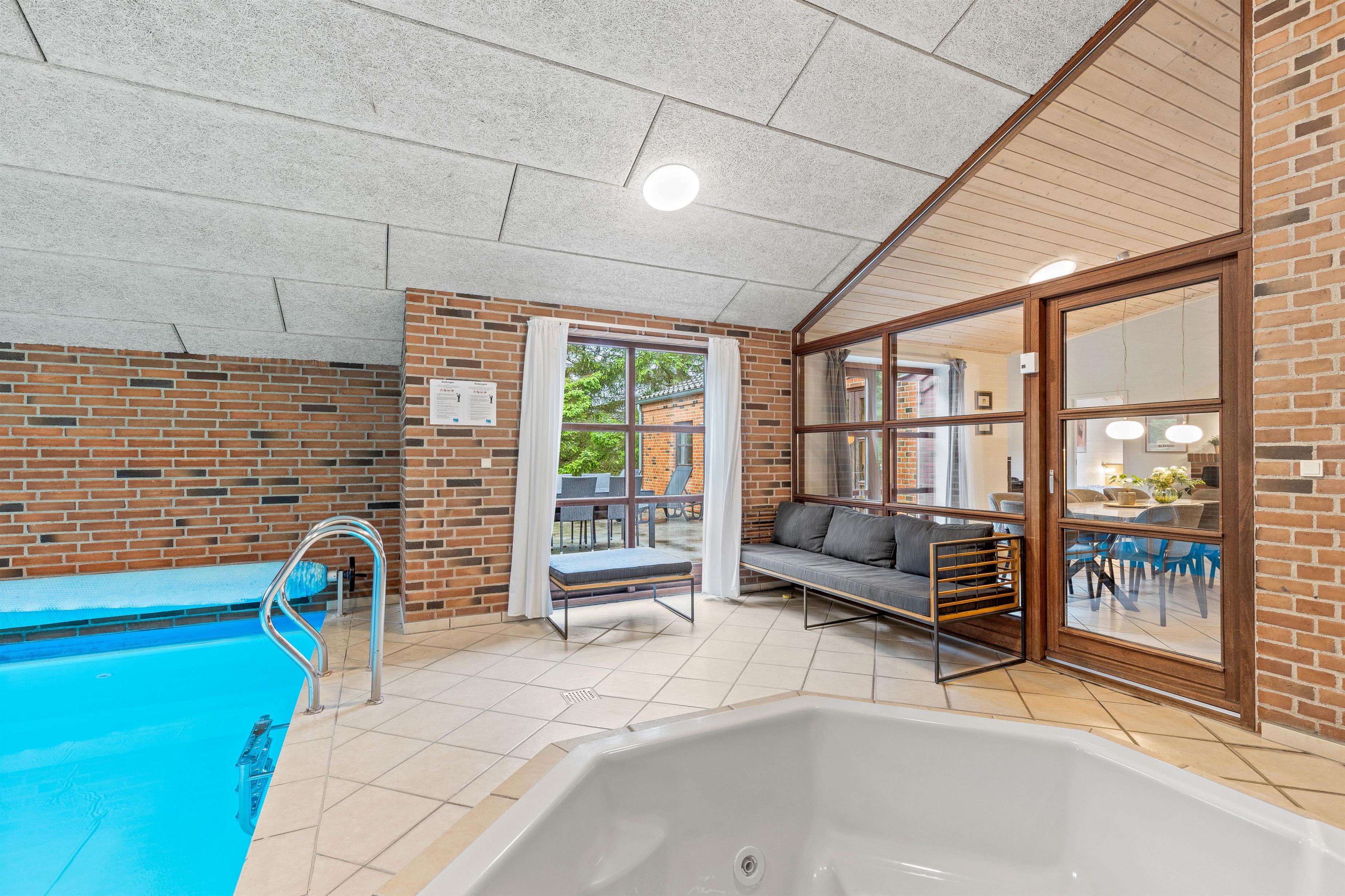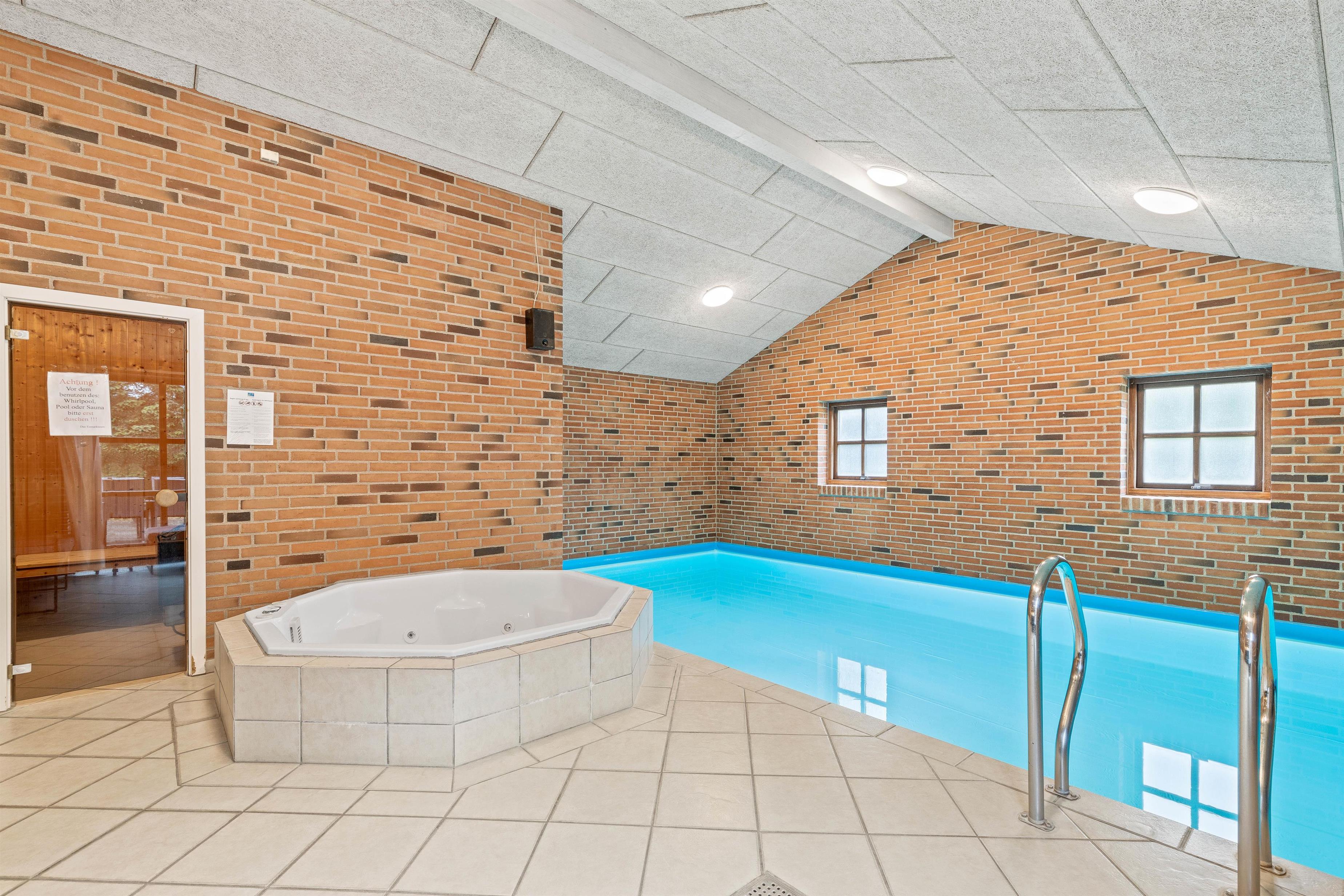 Et klart højdepunkt er sommerhusets store poolafdeling. Her kombineres underholdning og afslapning med en hele 28 kvadratmeter stor swimmingpool og et 4 personers-spabad. Mens vandhundene plasker i poolen, kan de resterende altså læne sig tilbage og se til fra det varme boblebad.