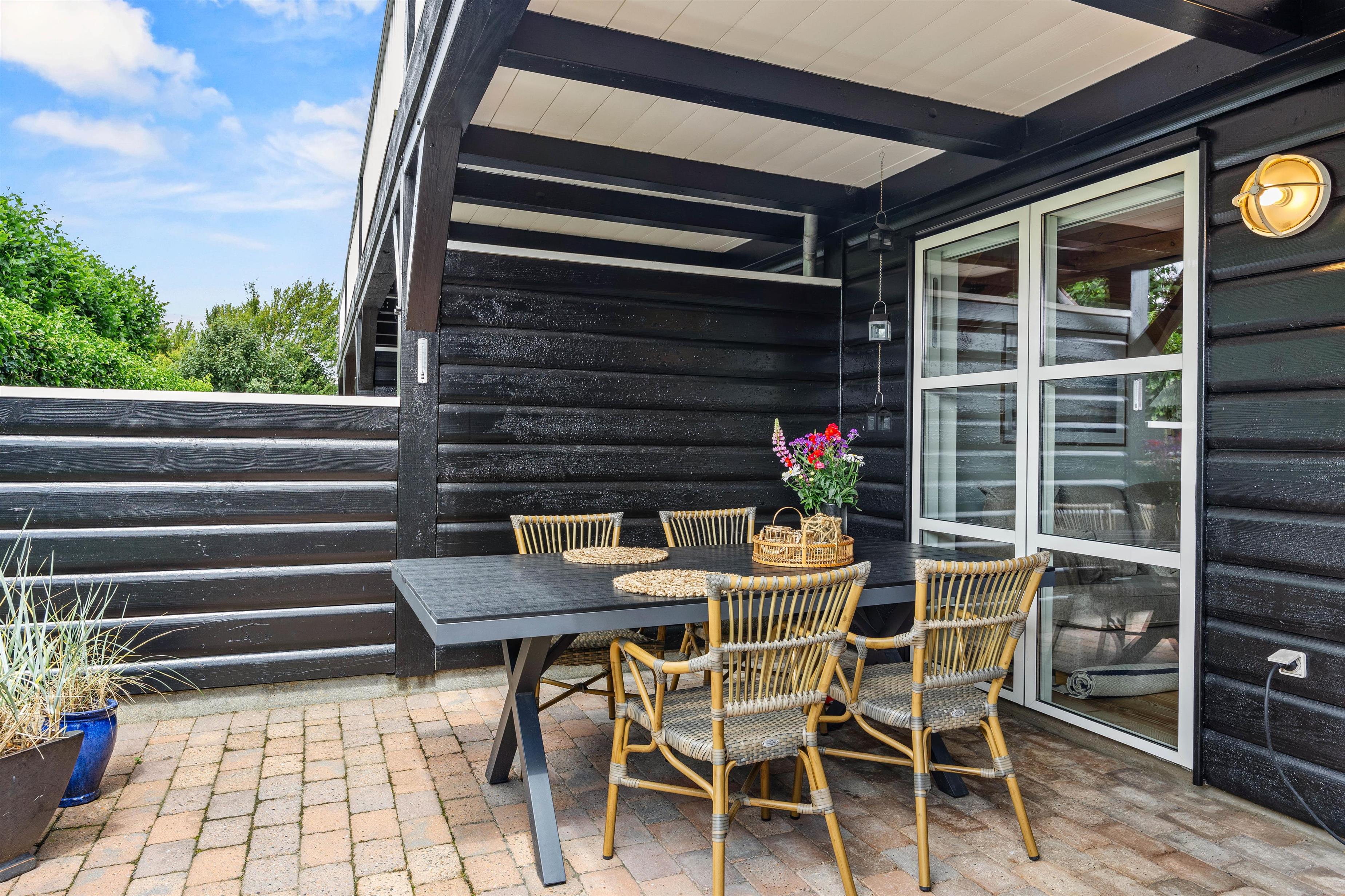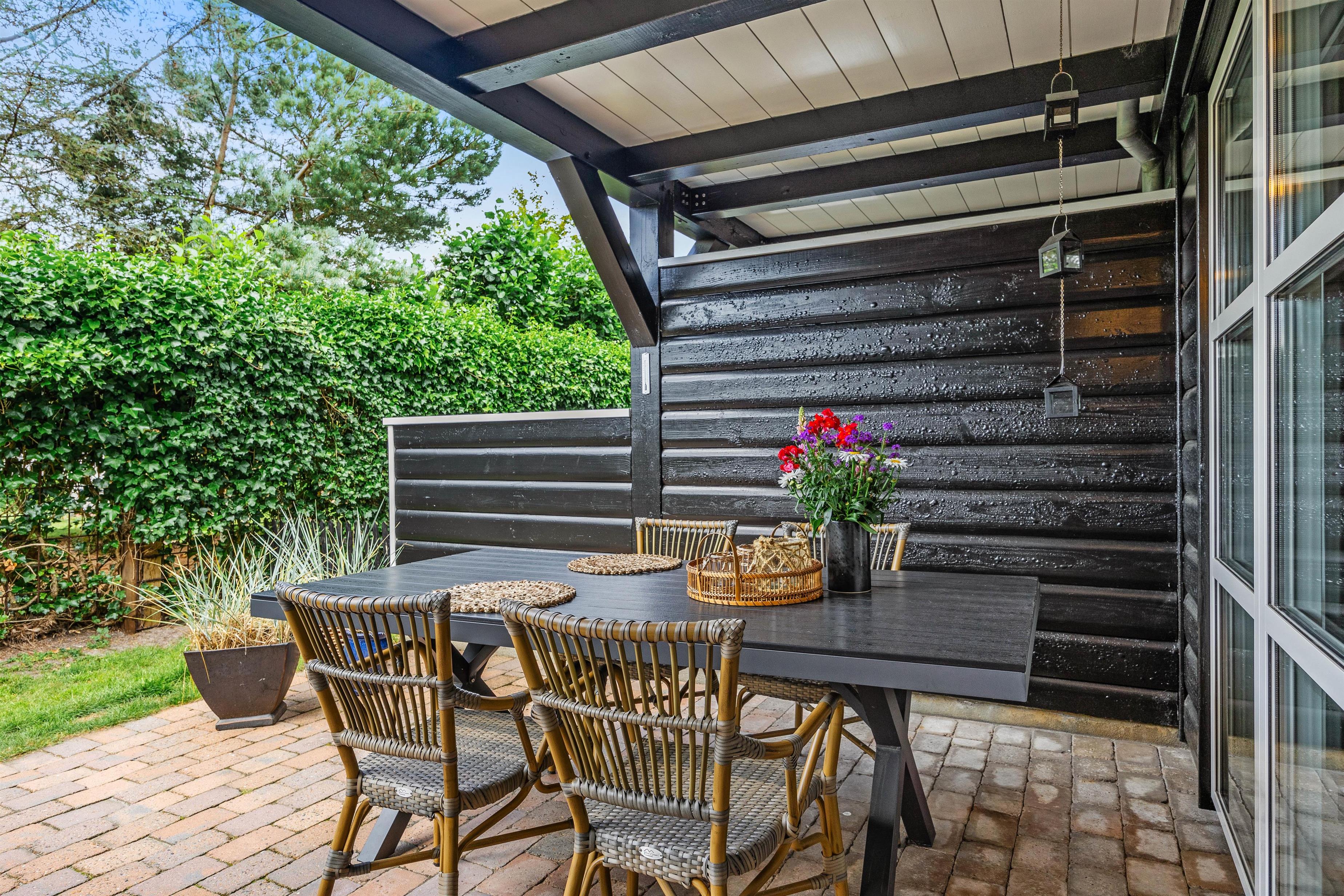 Også i stueetagen er der mulighed for at komme udenfor. Fra stuen kommer I ud på en overdækket, ugenert og veludstyret terrasse. Her finder I havemøbler og en el-grill, hvor aftensmaden kan tilberedes og de sene aftentimer kan nydes.