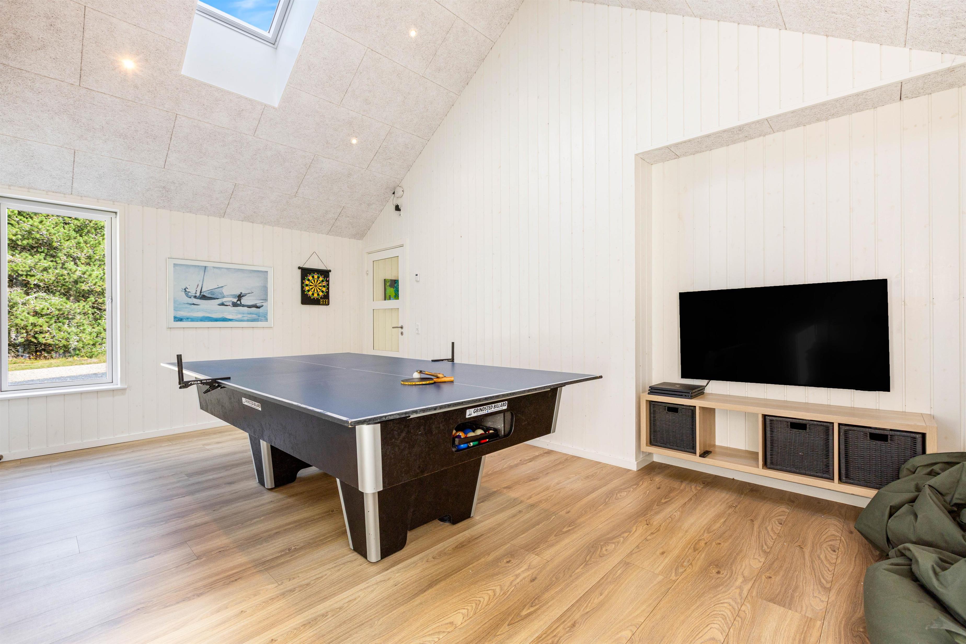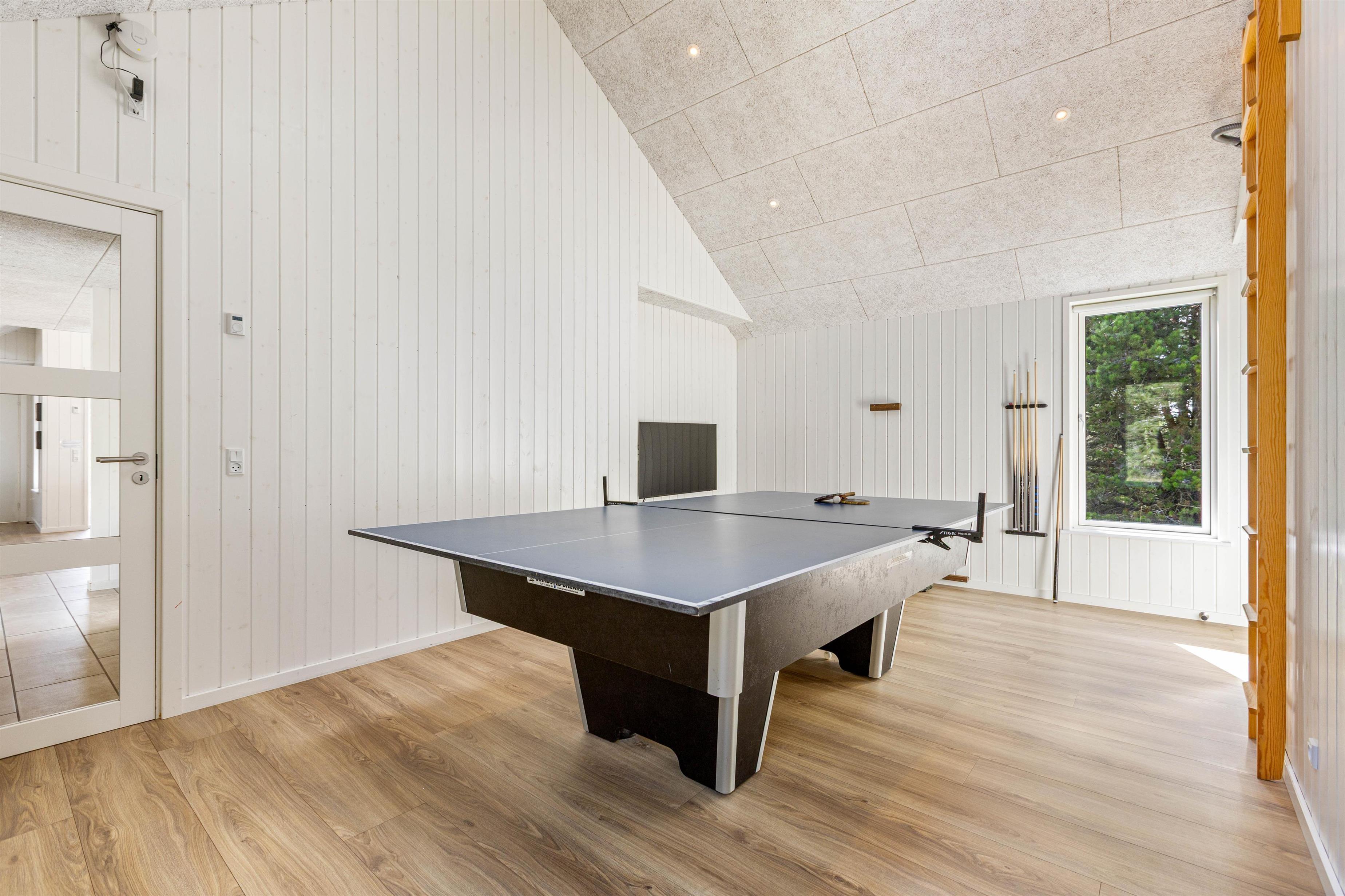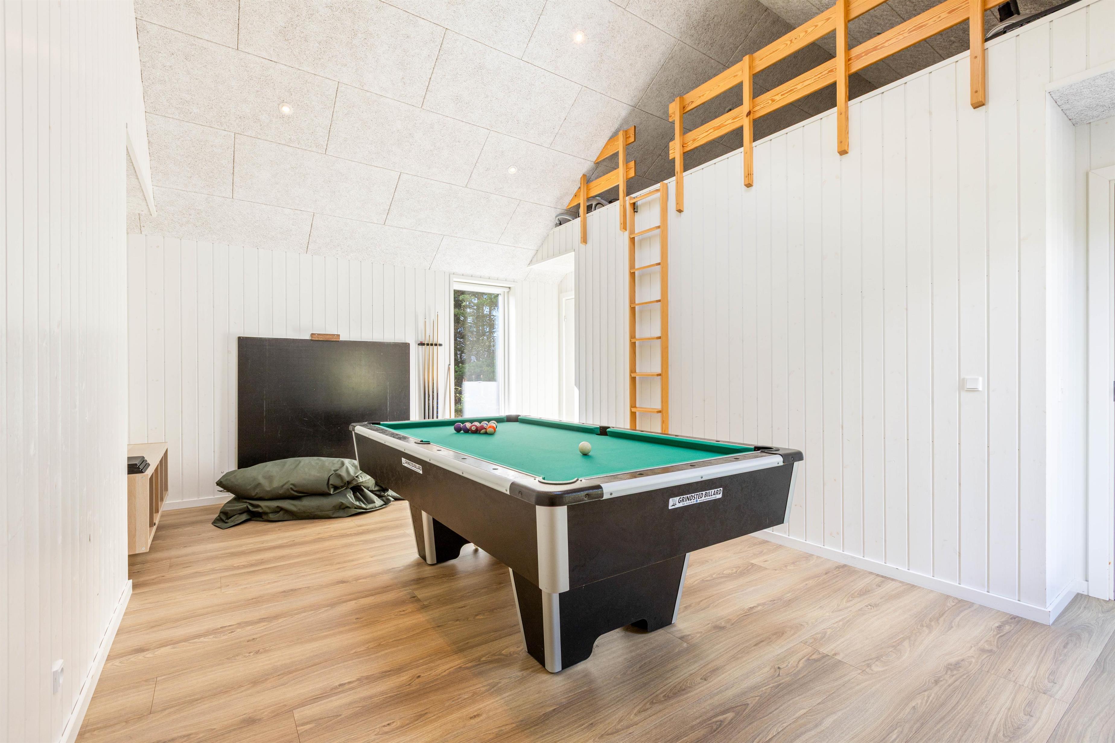 Der er højt til loftet, og de store vinduer sørger for godt lysindfald, hvilket alt i alt gør omgivelserne åbne og imødekommende. Den klassiske brændeovn sørger for dejlig varme og hyggelig feriestemning året rundt. I aktivitetsrummet kan familien samles om sjov og spil med blandt andet bordtennis og billard, og der er også PlayStation 4.