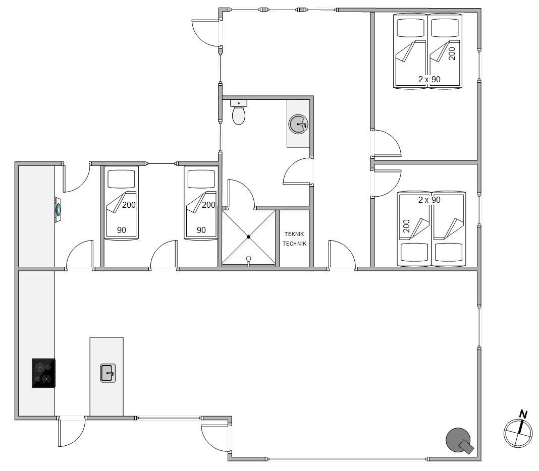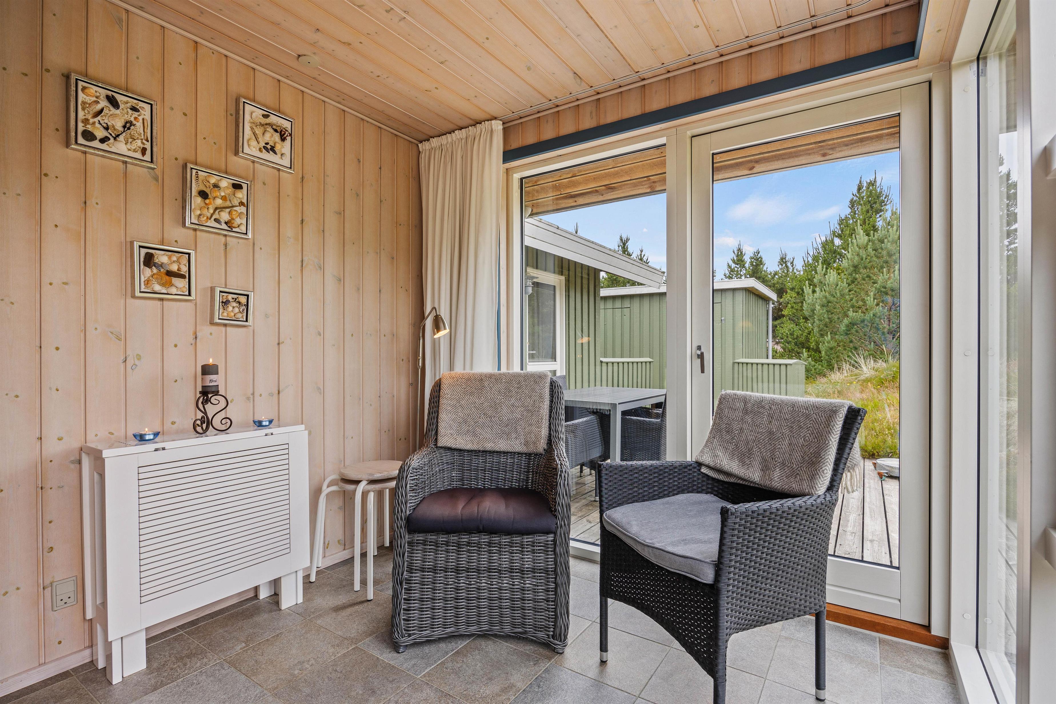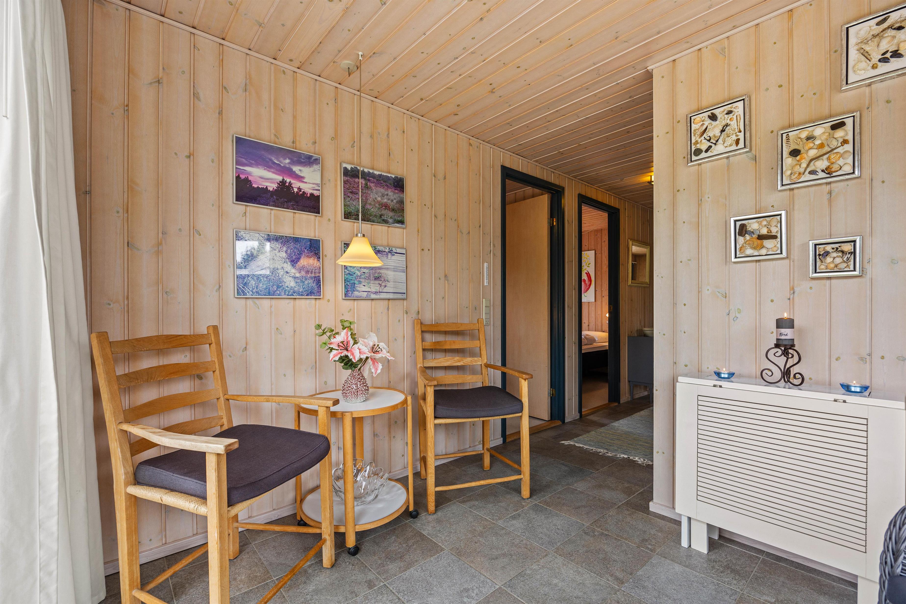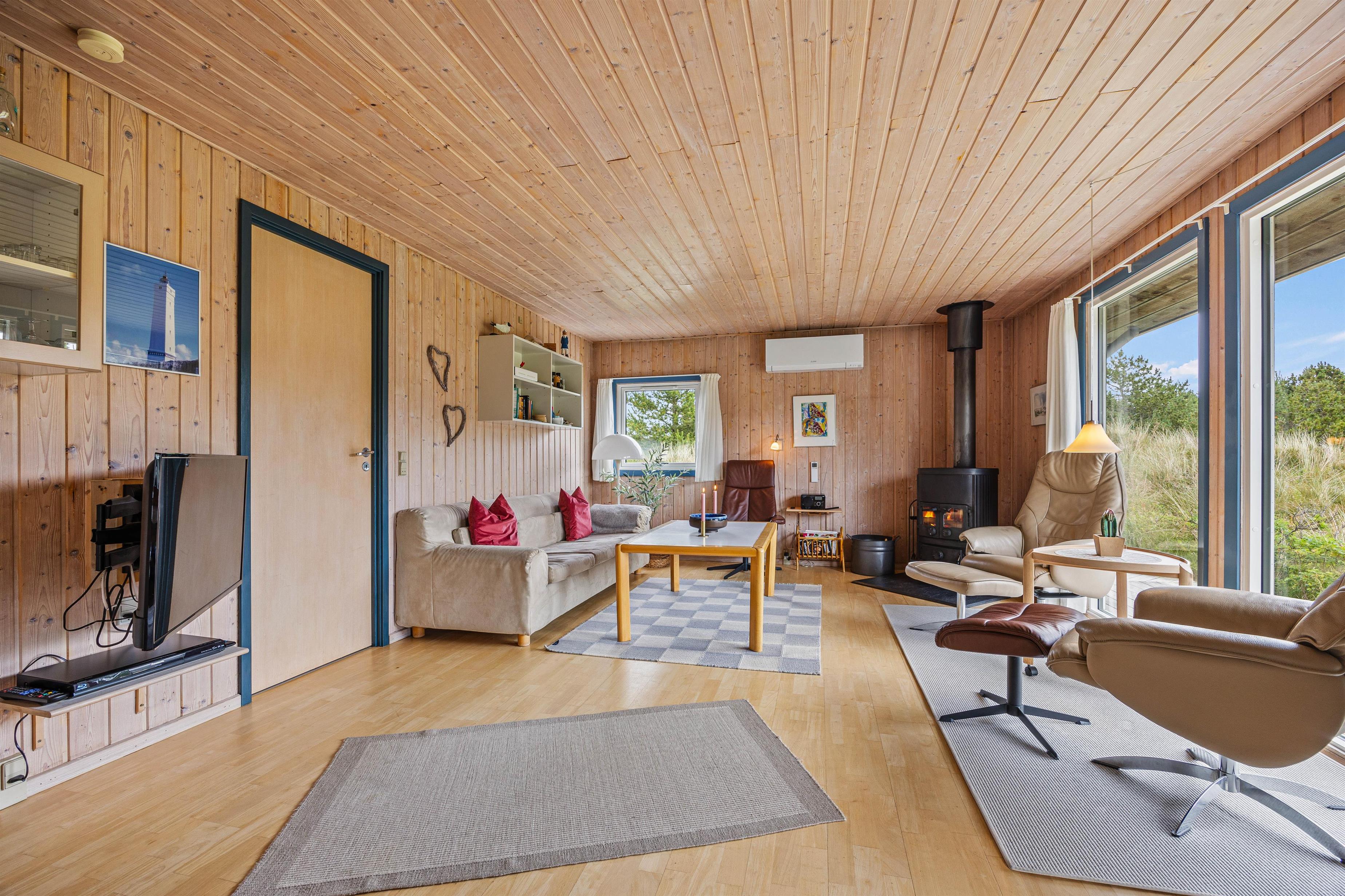 I stuen står den klassiske brændeovn, som sørger for, at der altid er dejlig varmt og ikke mindst hyggeligt. Derudover gemmer sommerhuset på en udestue med gulvvarme, hvor naturen bliver inviteret helt indenfor gennem de mange vinduer, og således giver jer mulighed for at nyde udsigten i al slags vejr. Der er ingen tvivl om, at udestuen i særlig grad kommer til sin ret, når regnen trommer på ruden, og I sidder i varmen med en nybrygget kop kaffe.