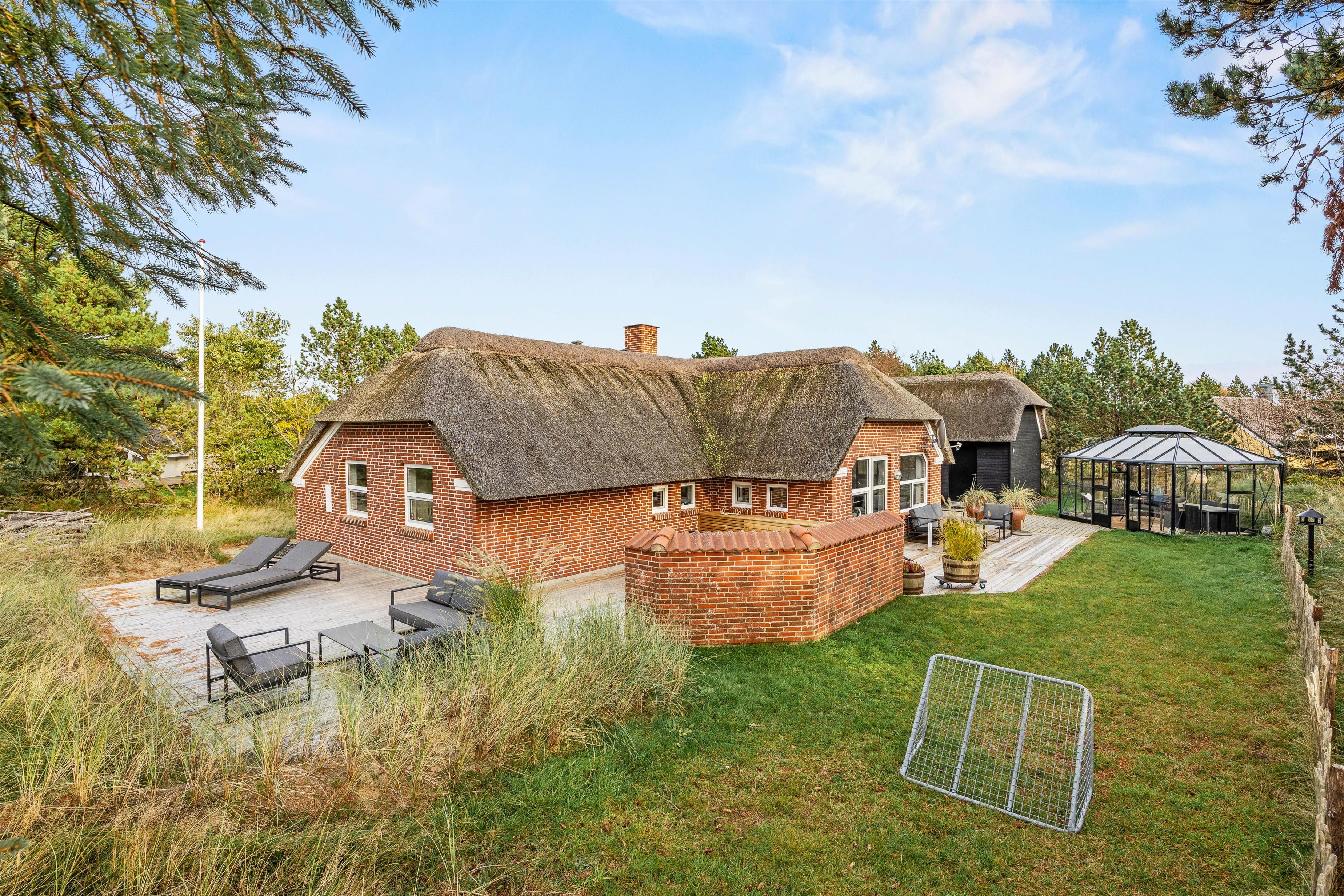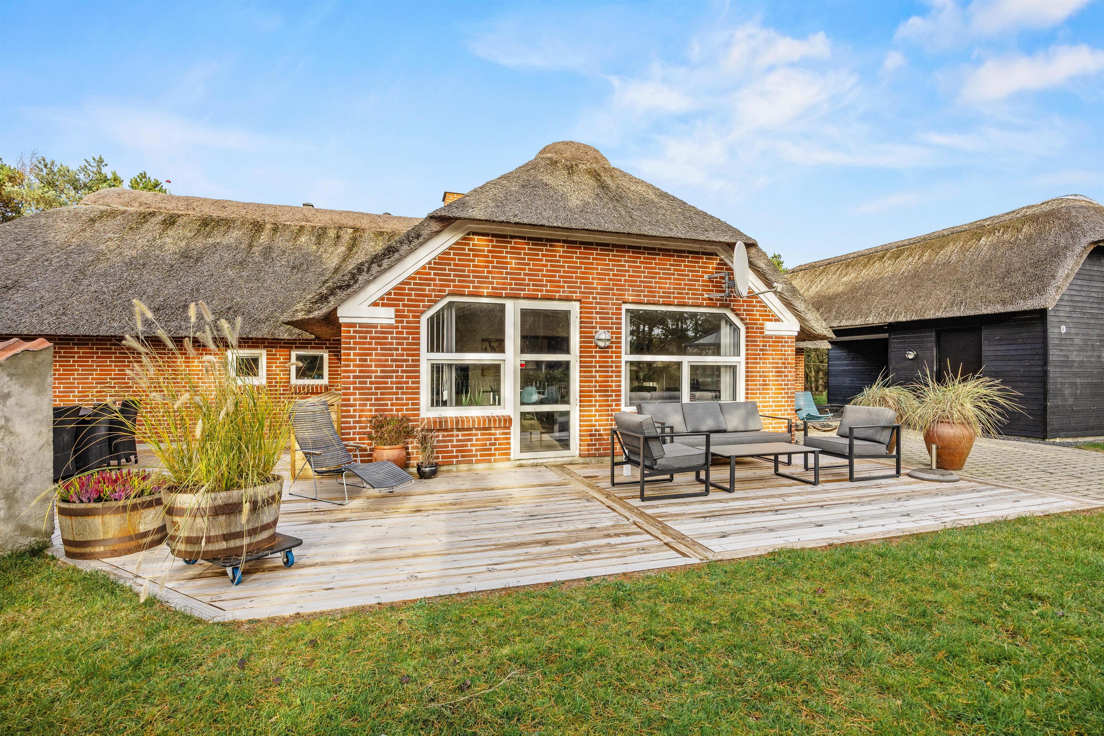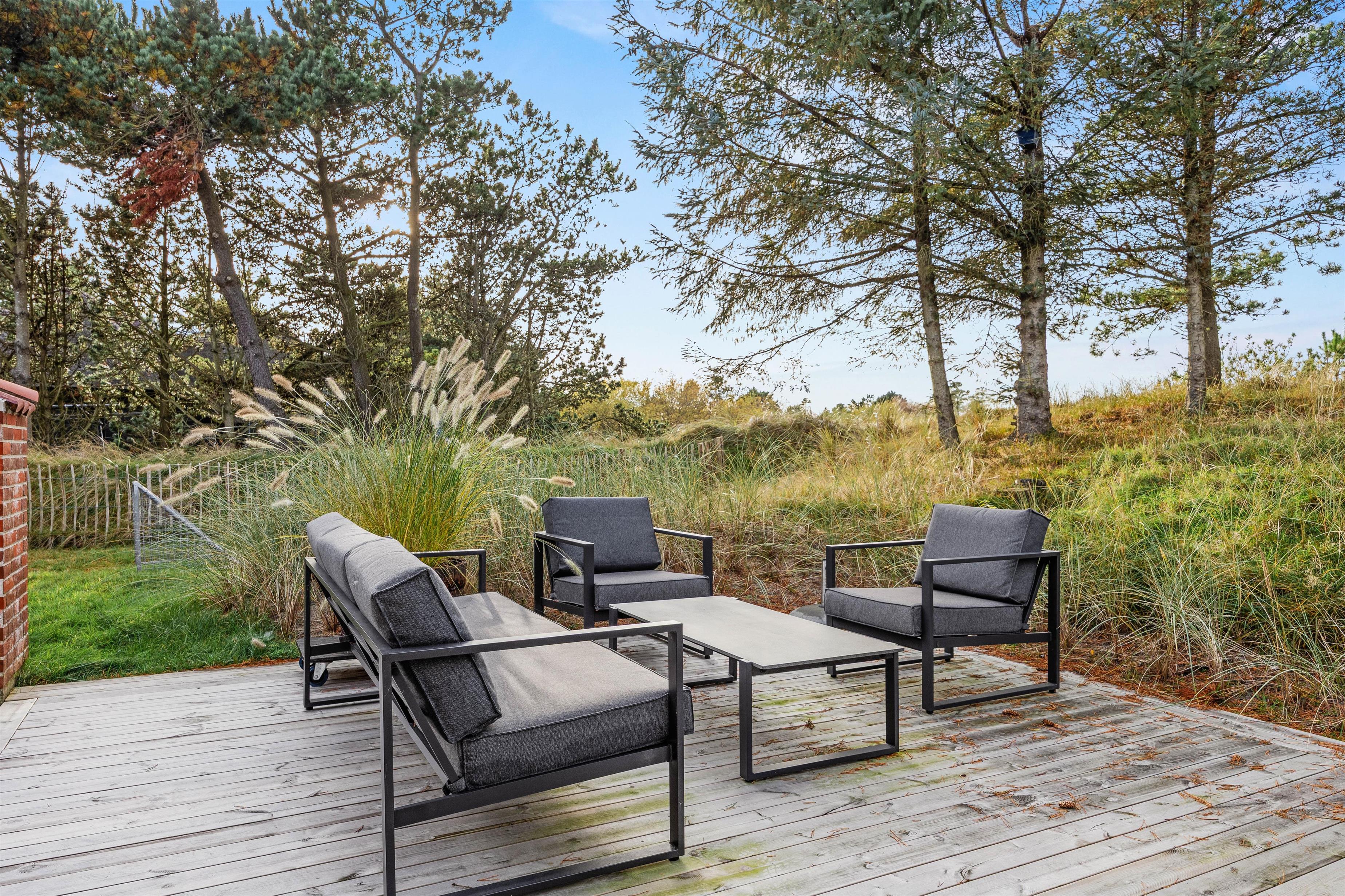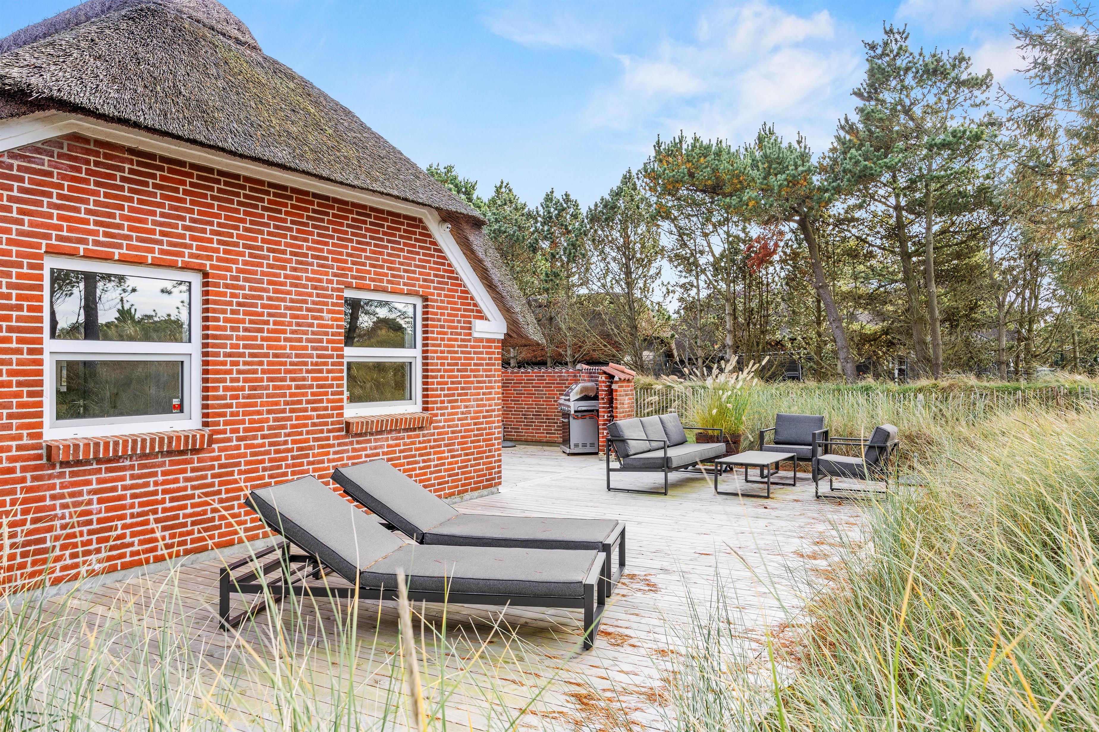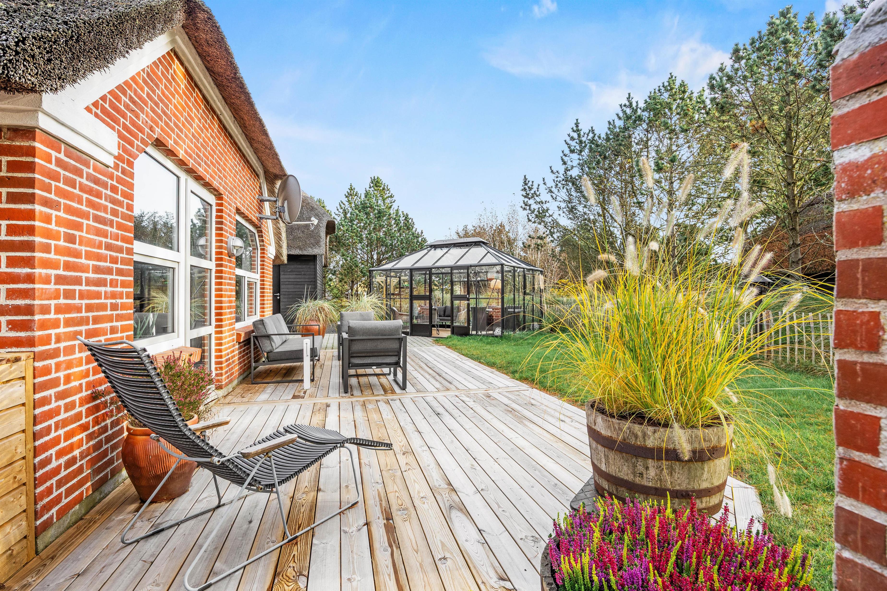 Udenfor på den store grund venter jer mange gode timers afslapning og hygge på de skønne terrasser, som går hele vejen rundt om huset. Her kan I lave lækker mad på gasgrillen og slappe af i havemøblerne, og på dage med regn kan I rykke indenfor i orangeriet og dermed også forlænge udendørssæsonen – hvad er hyggeligere end at læse en god bog på ferien, mens regnen trommer på taget, og man sidder i læ for vinden, eller bare få gode, dybe samtaler med venner eller familie.
