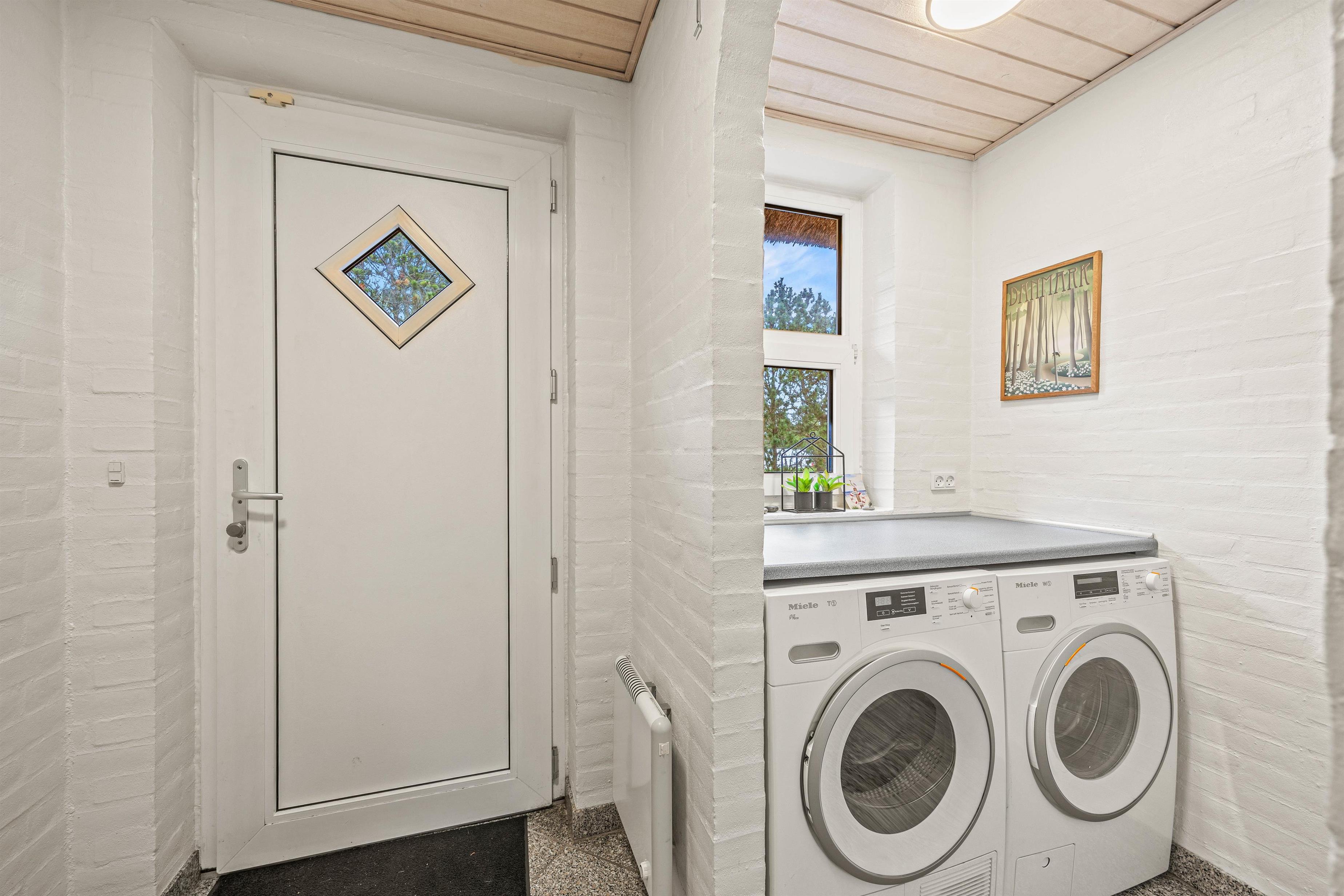 Køkkenet er udstyret med en opvaskemaskine, en separat 70-liters fryser og en mikroovn, og I finder også en vaskemaskine og tørretumbler i huset, så I kan få vasket feriegarderoben, ligesom en varmepumpe sørger for et godt indeklima i huset året rundt.