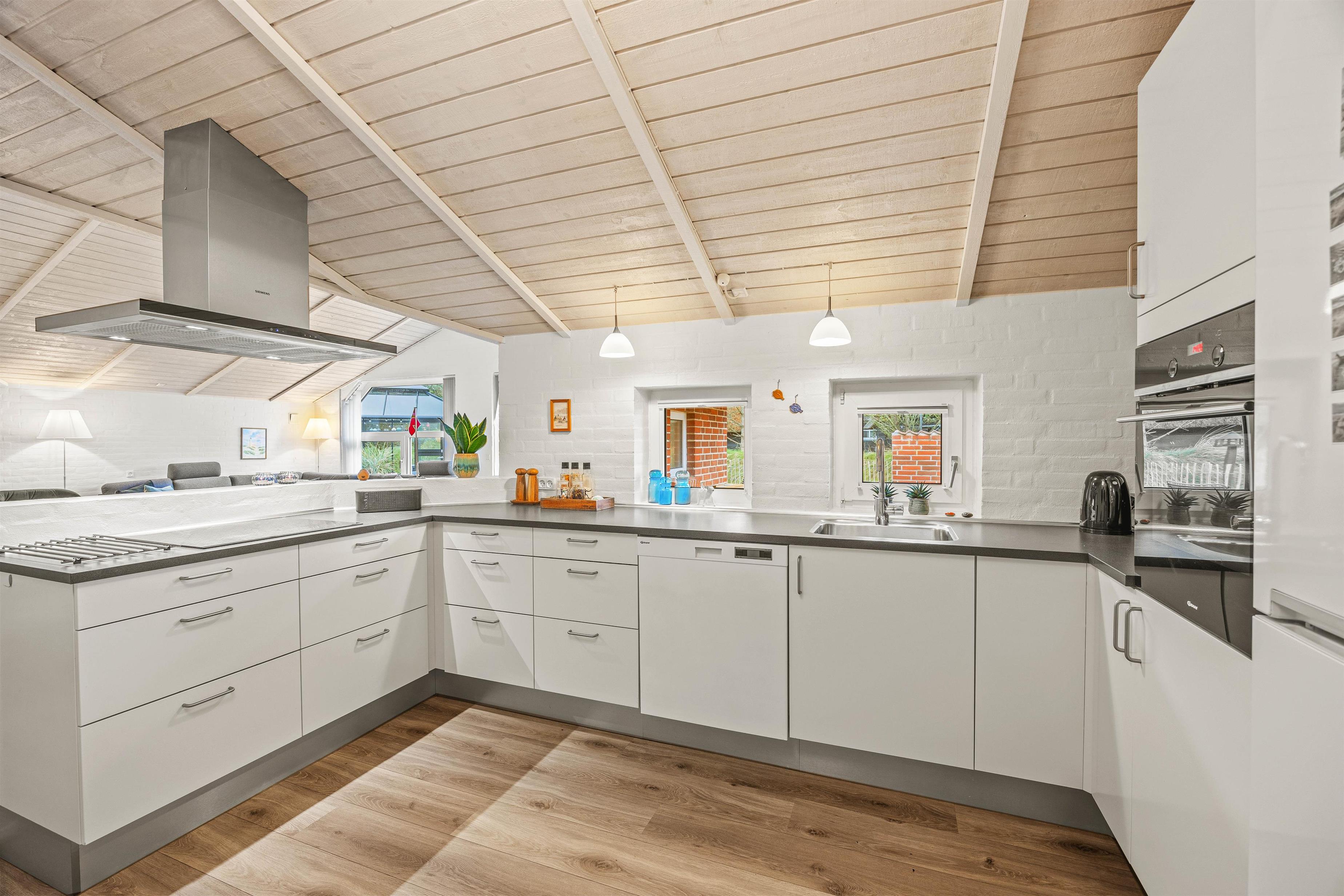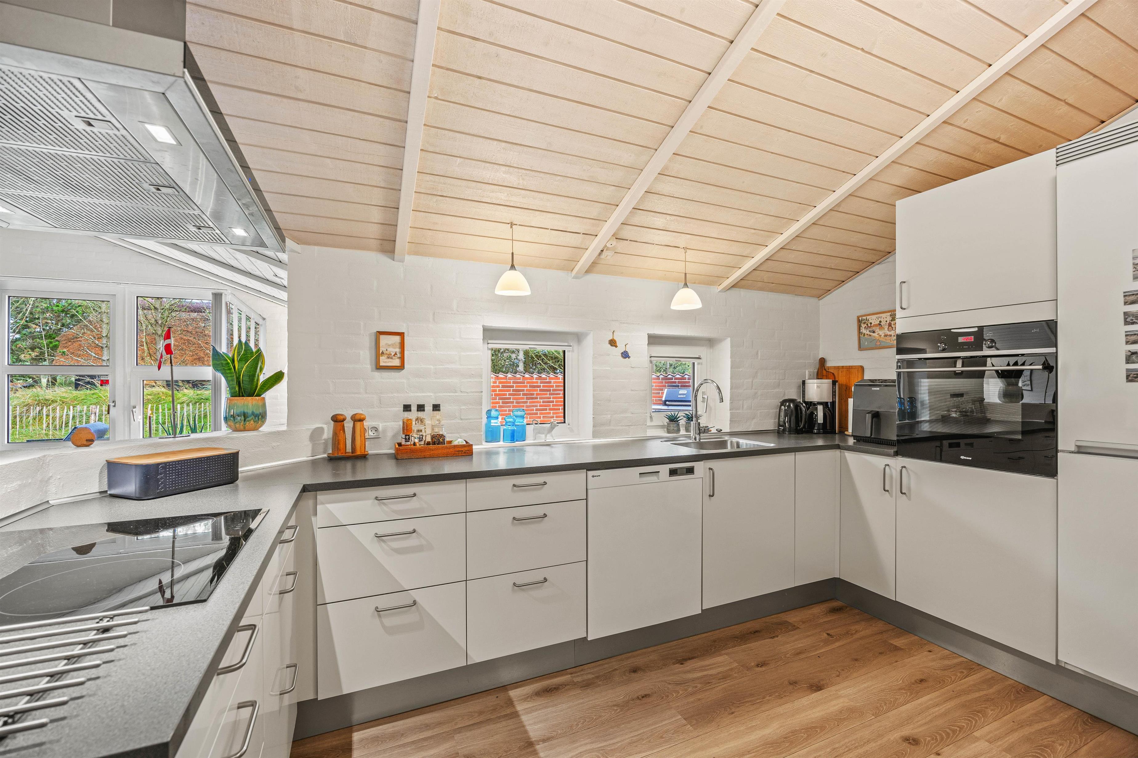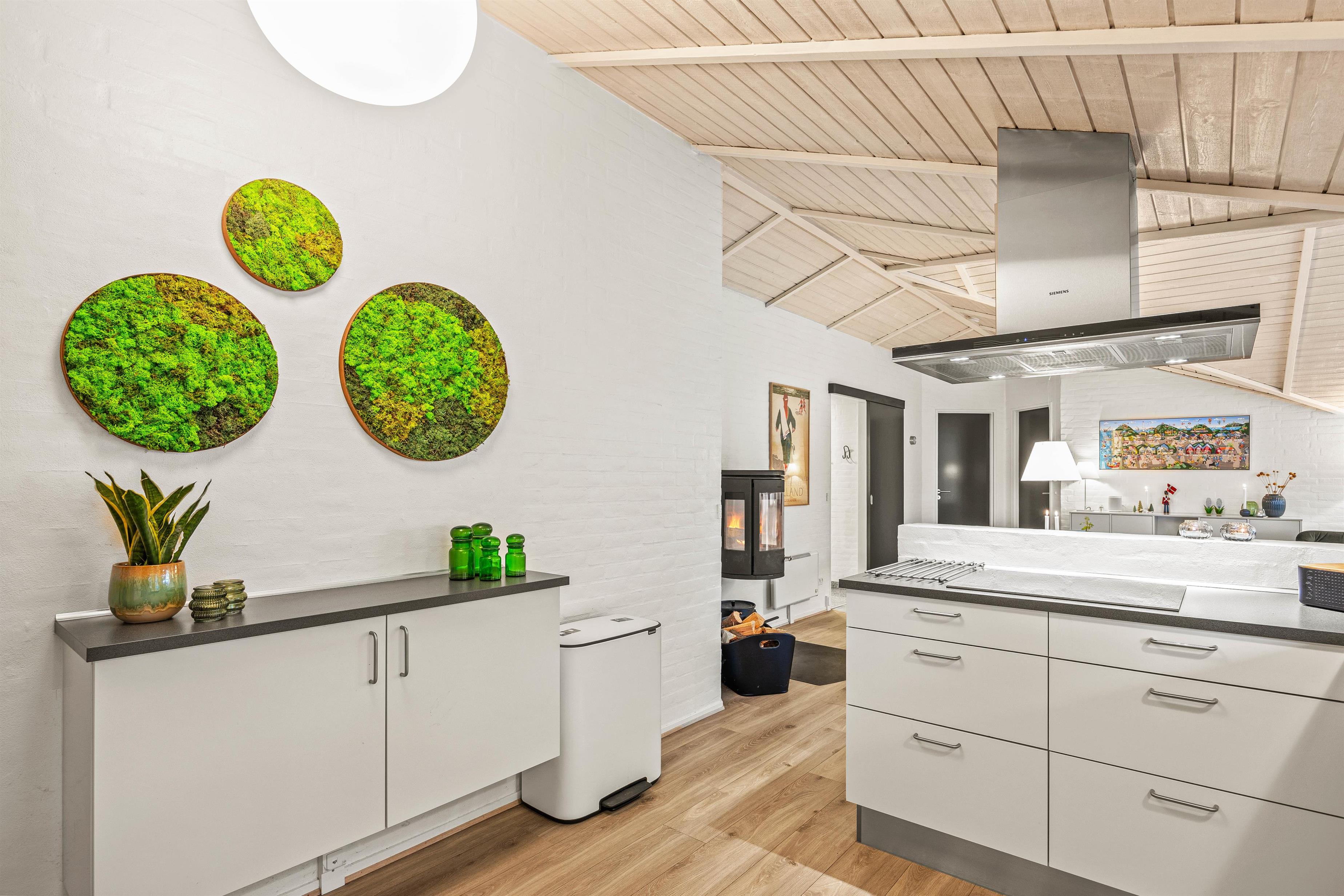 Så snart I træder ind i det store, hyggeligt indrettede køkken/alrum, indfinder feriefølelsen sig i kroppen. I det fine, lyse køkken kan I lave lækker mad til hinanden, som I kan hygge jer over ved spisebordet nær brændeovnen, og nyde den velgørende varme og gode stemning, den spreder, sammen med Sonos-højttaleren, som I kan streame musik på.