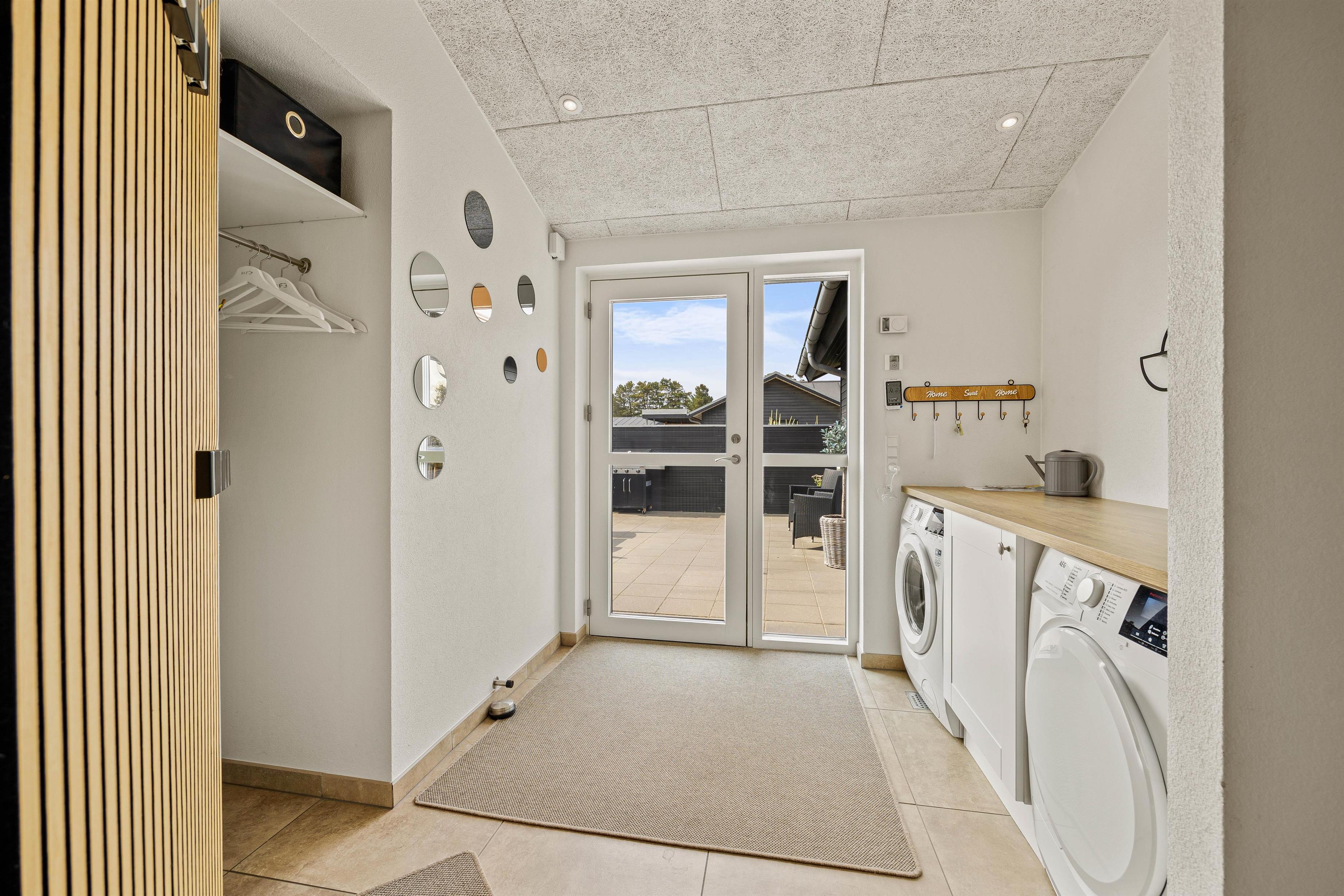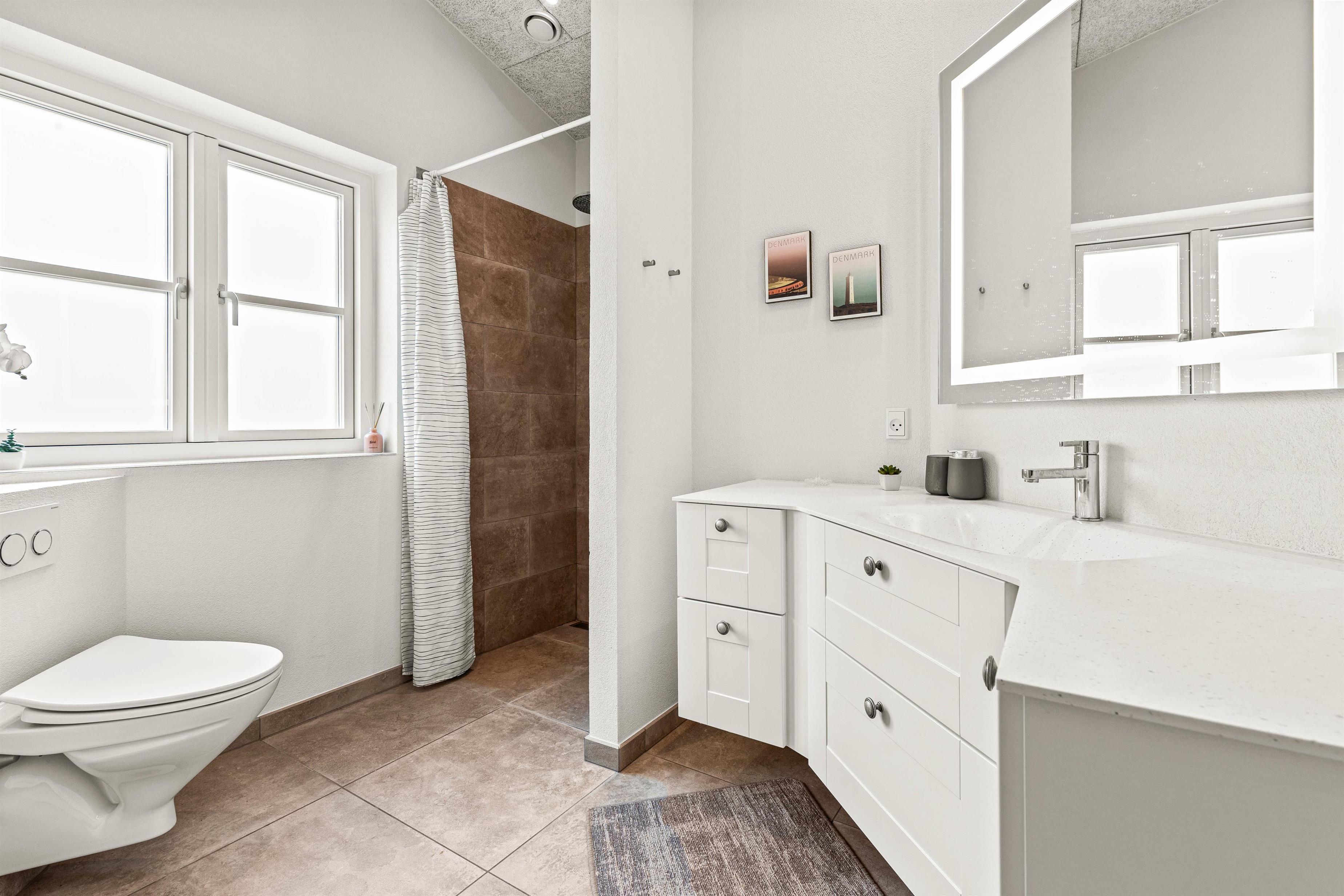 Huset er praktisk indrettet med 2 gode badeværelser, og på det ene af badeværelserne er der adgang til husets sauna. Her kan I rigtig få lov til at slappe af og lade batterierne op efter en skøn feriedag i den friske luft.