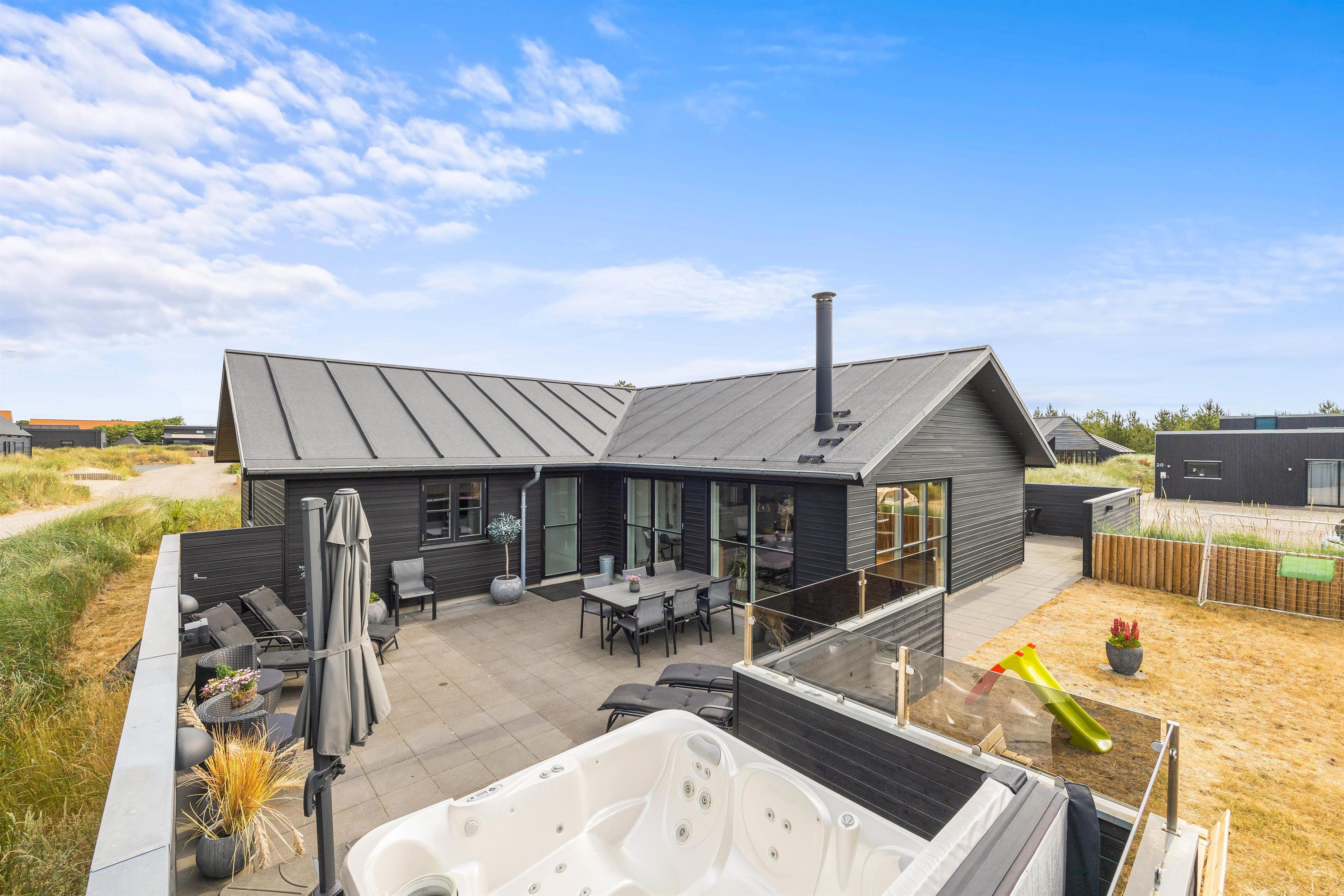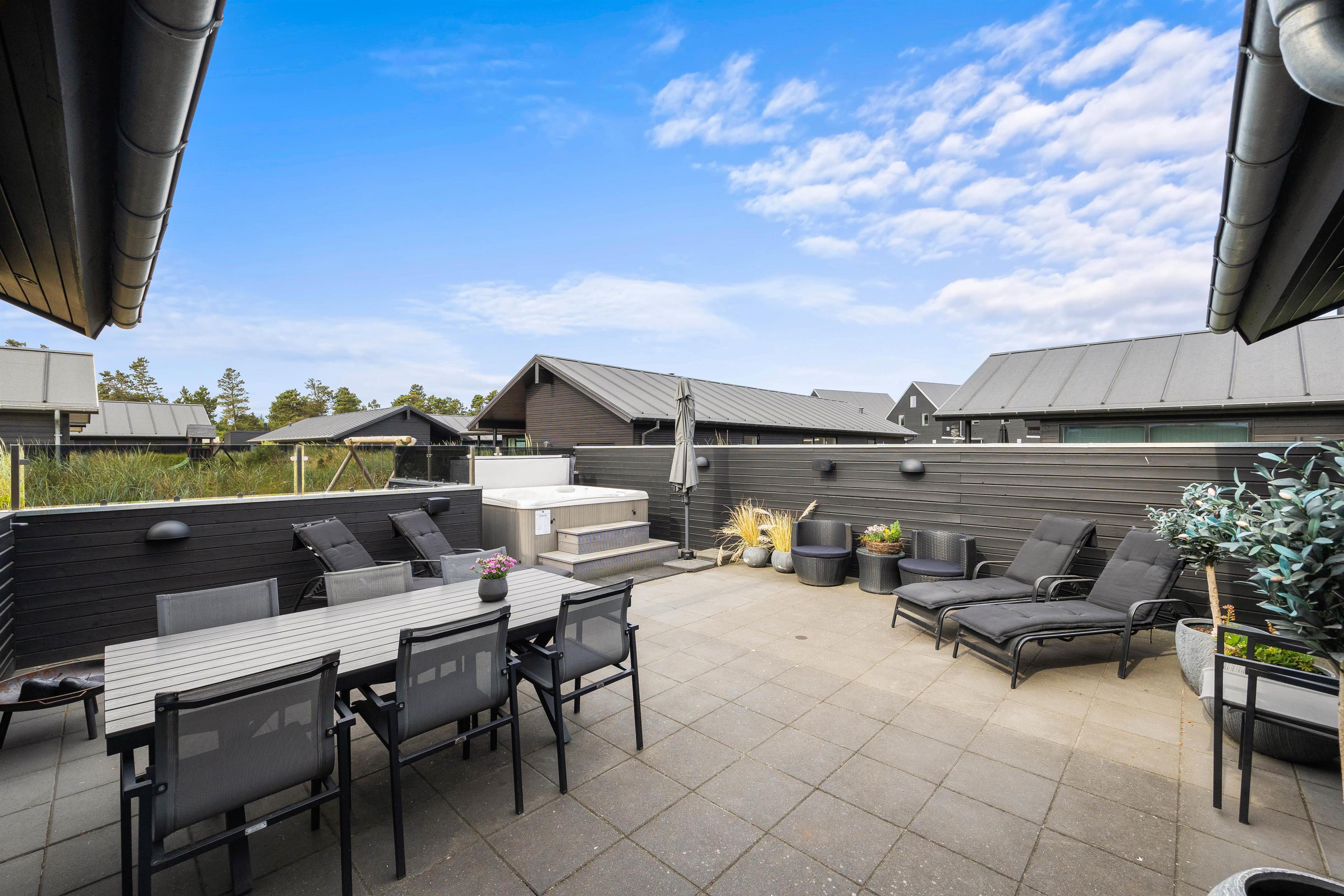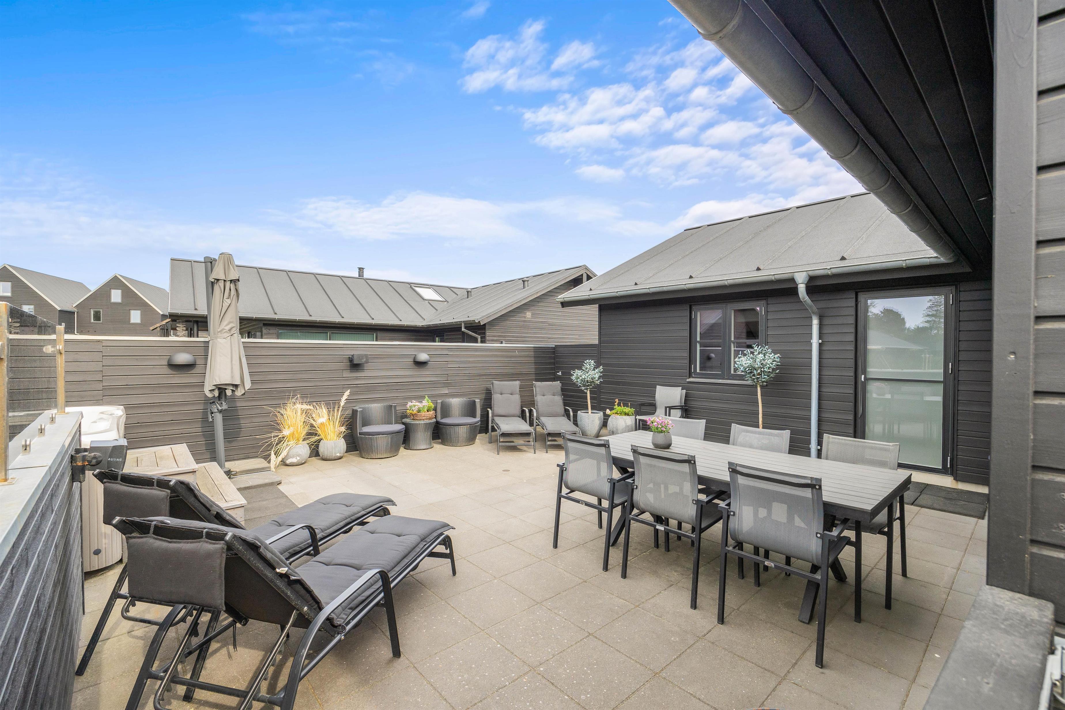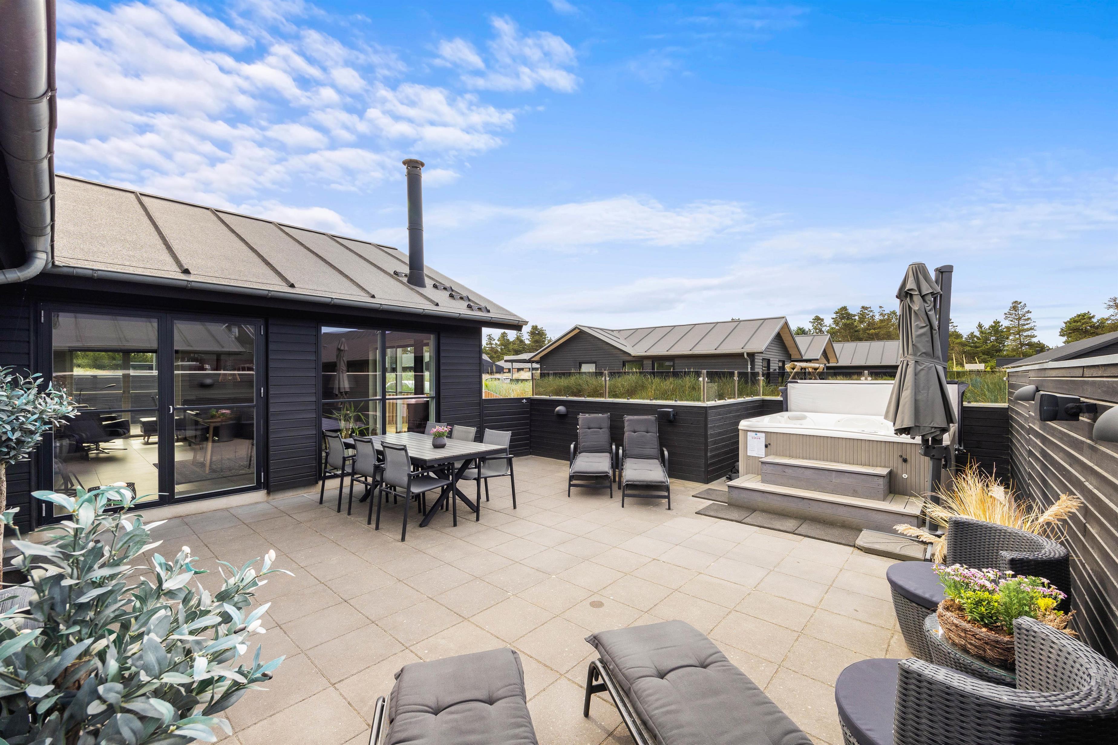 På den lukkede terrasse står et af husets absolutte highlights; det store udendørs spabad med plads til 4-6 personer. Så husk badetøjet hele året rundt, så I kan hoppe en tur i den varme jacuzzi under åben himmel!