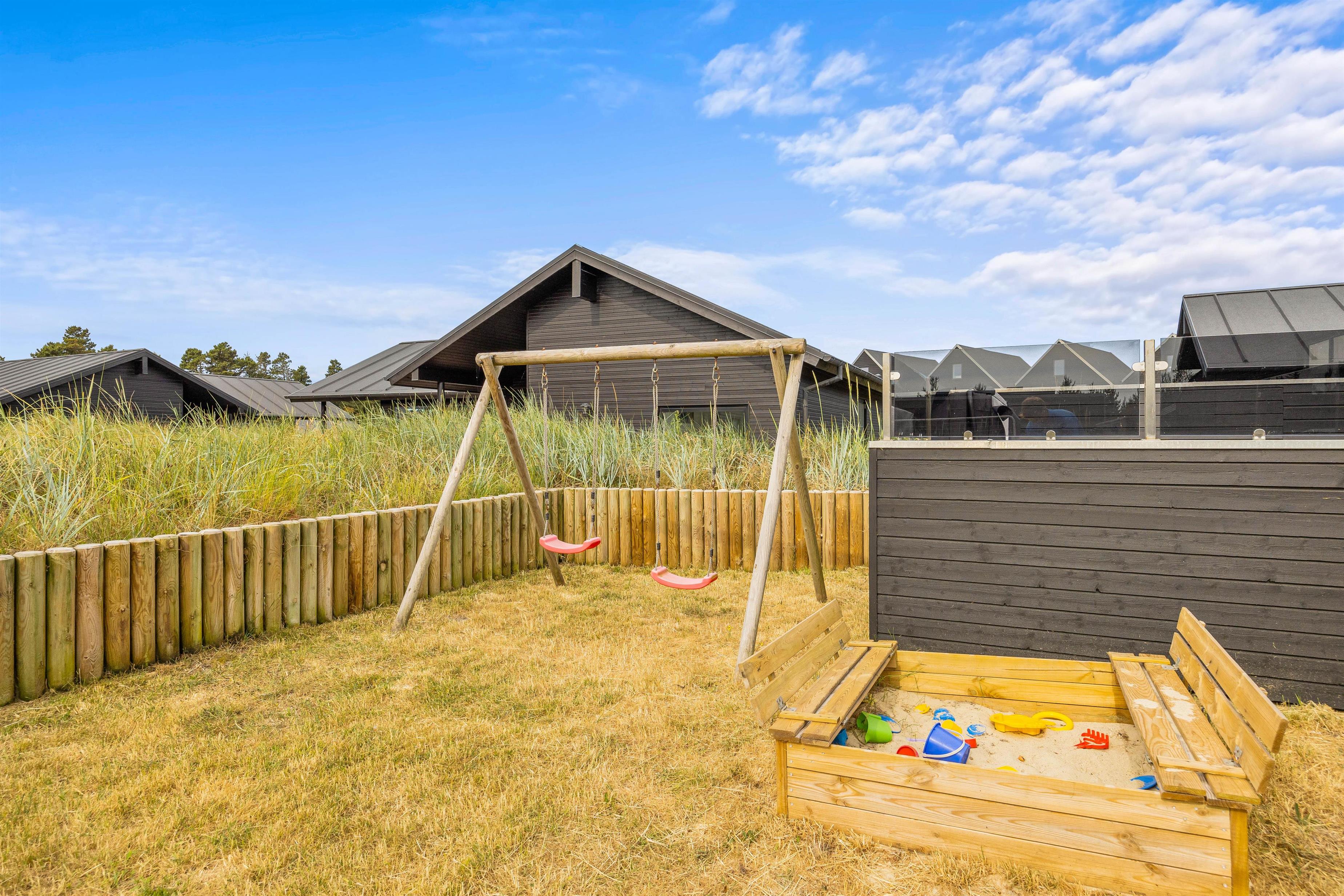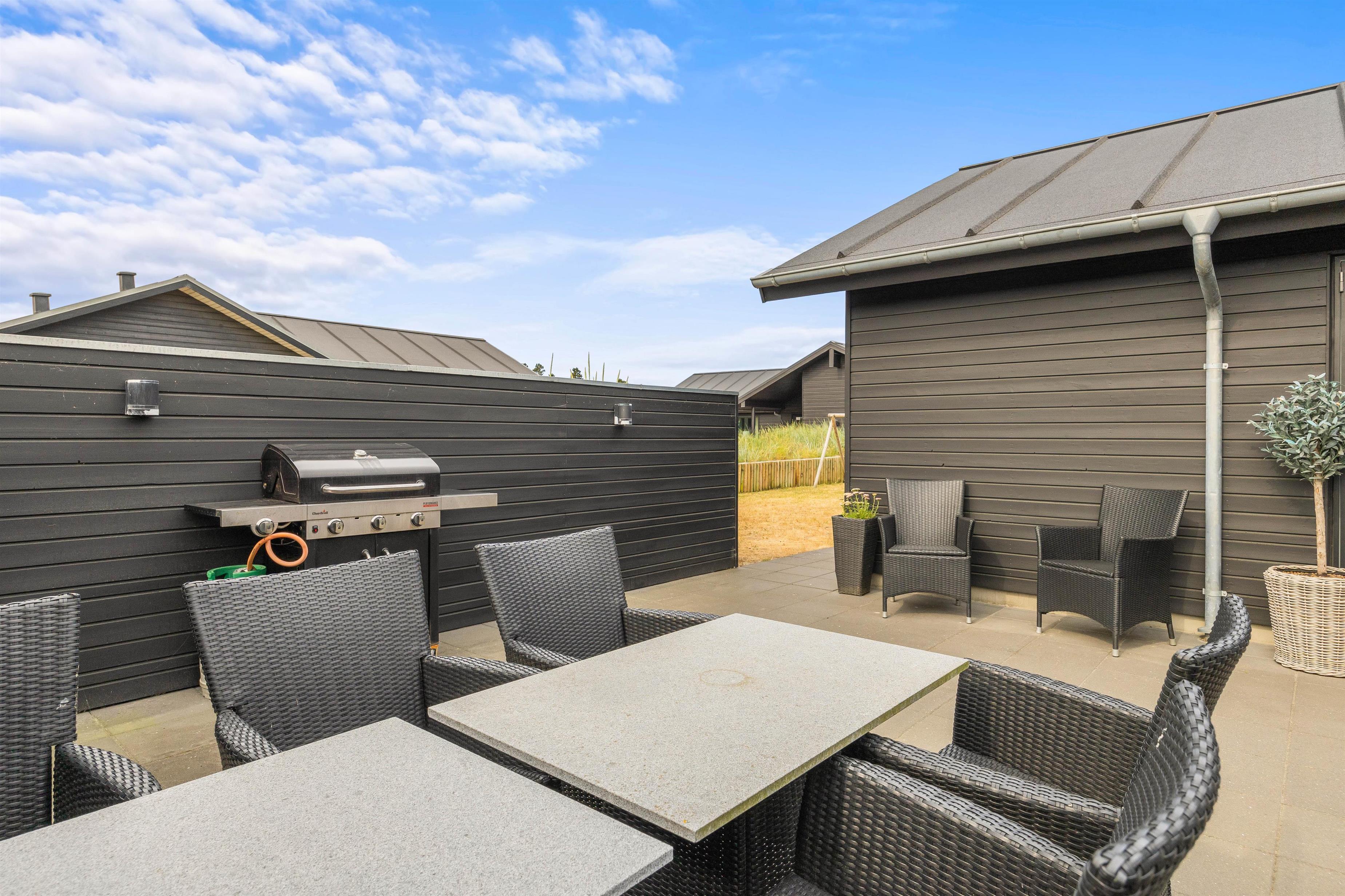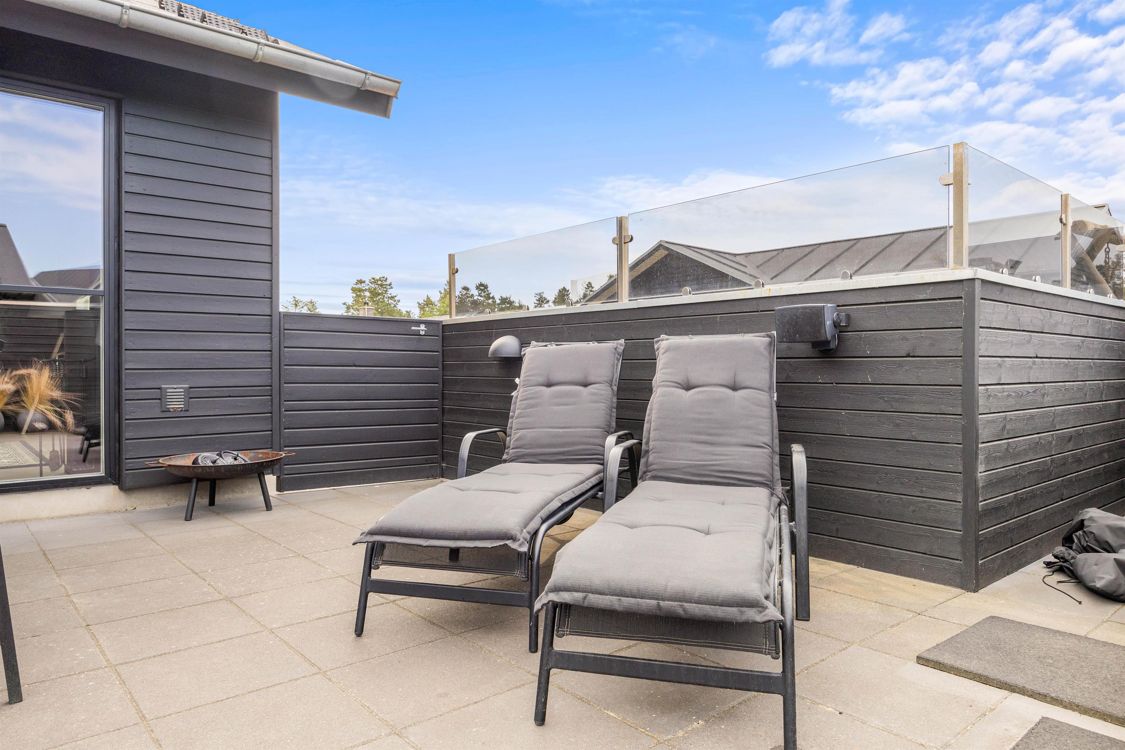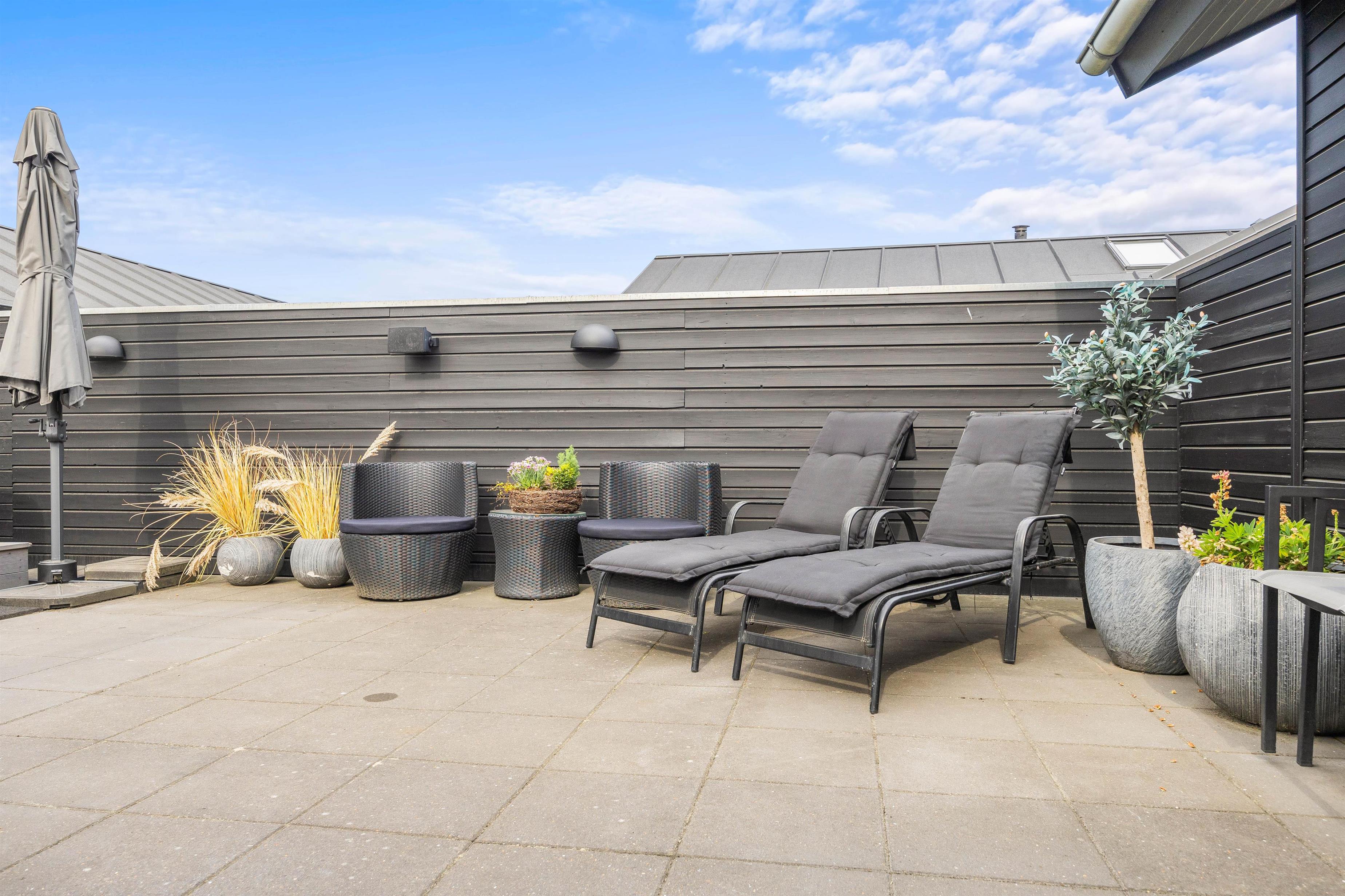 Rundt om huset finder I to gode terrasser mod øst og vest. Mens den ene terrasse er afskærmet, er den anden helt lukket, så I roligt kan lade børnene lege, mens I slapper af i liggestolene eller er i gang med at forberede aftensmaden på grillen.