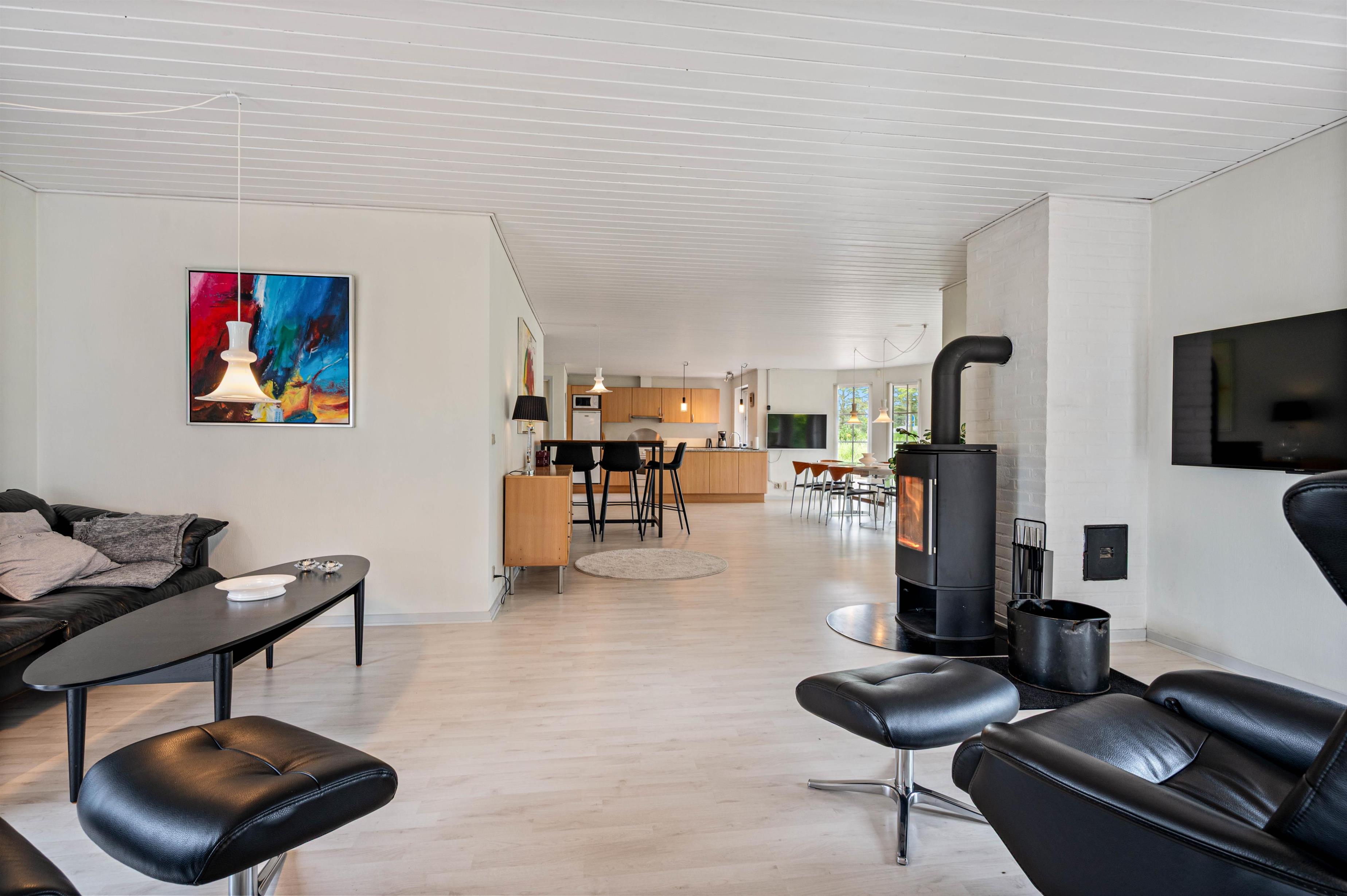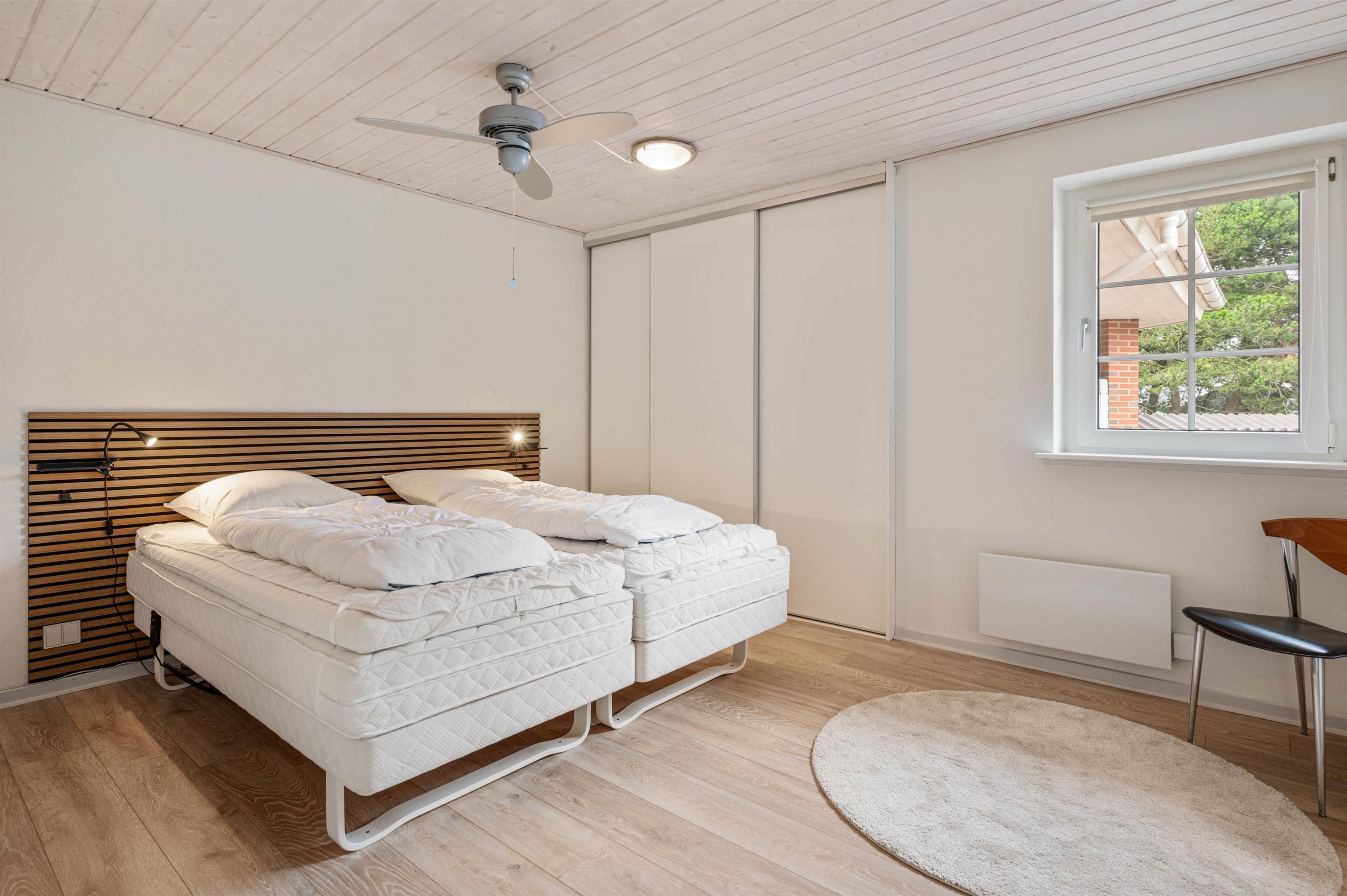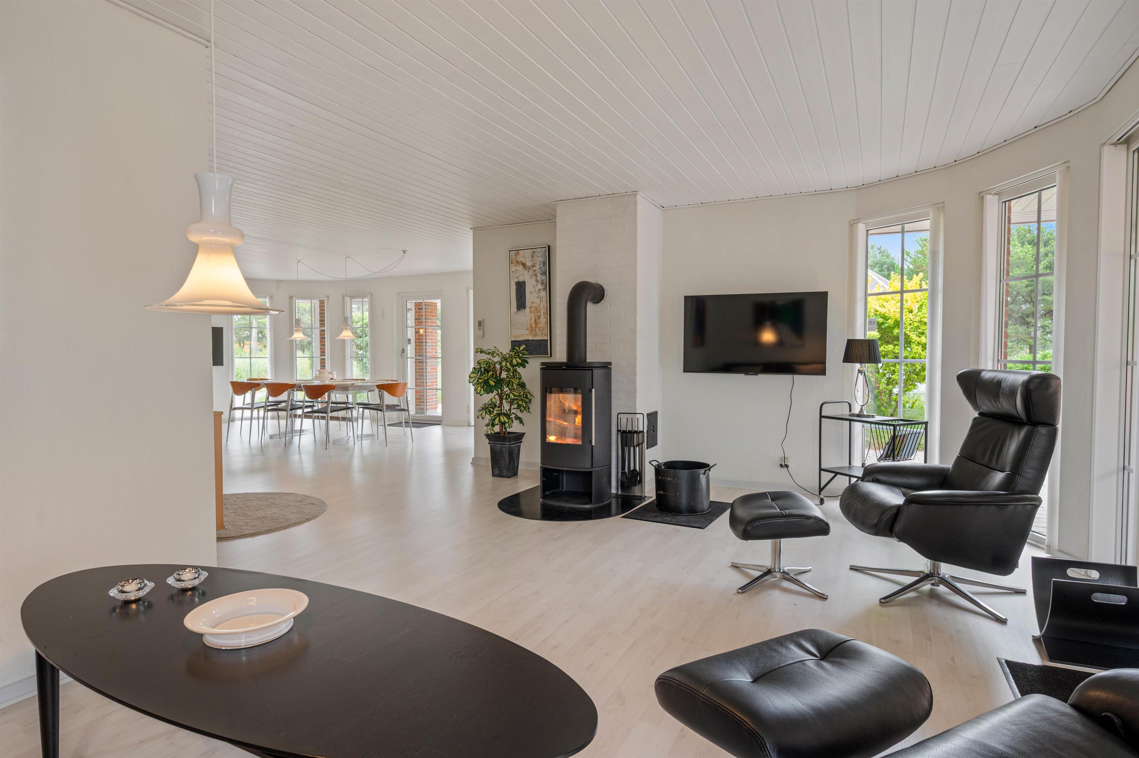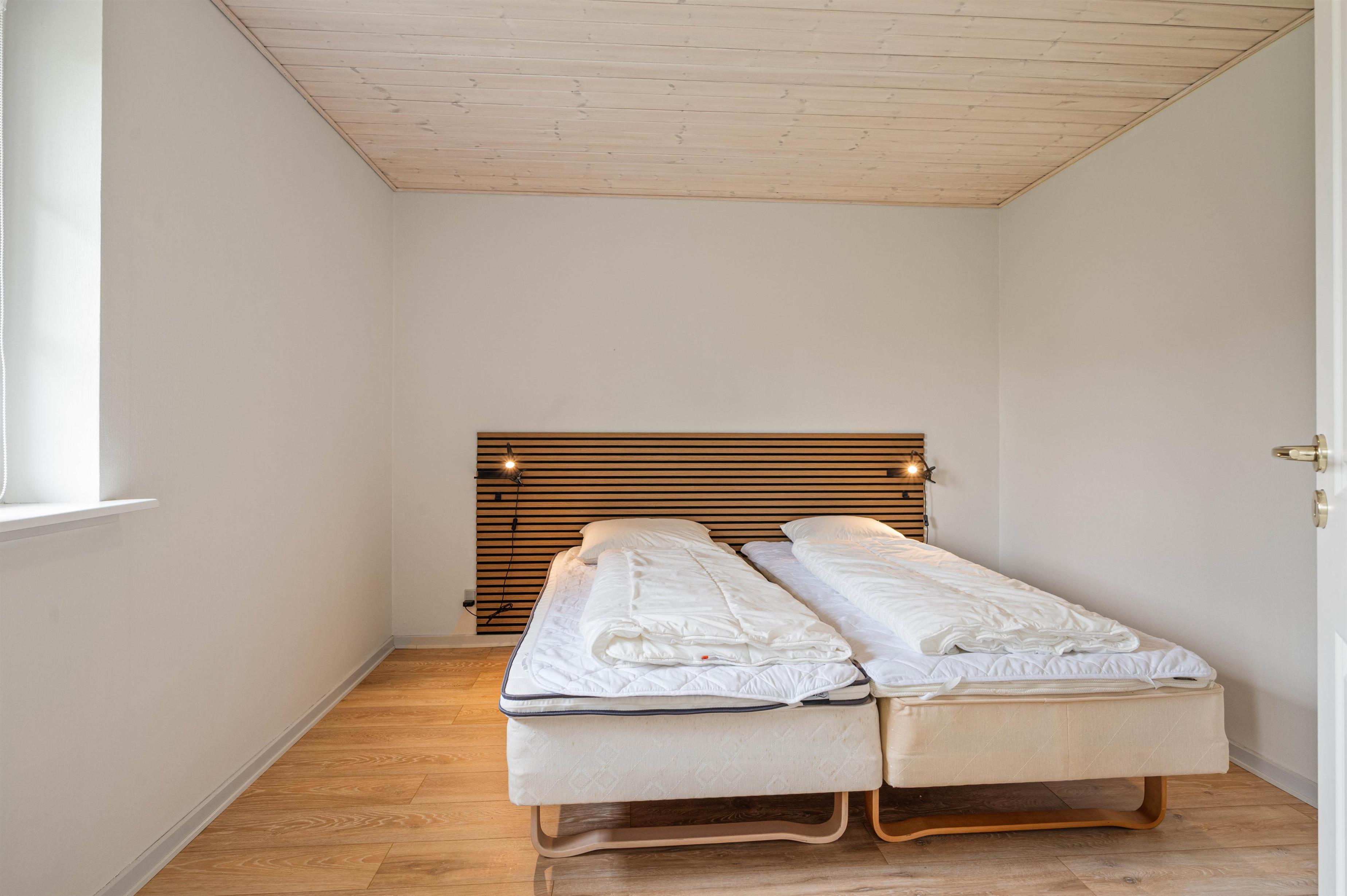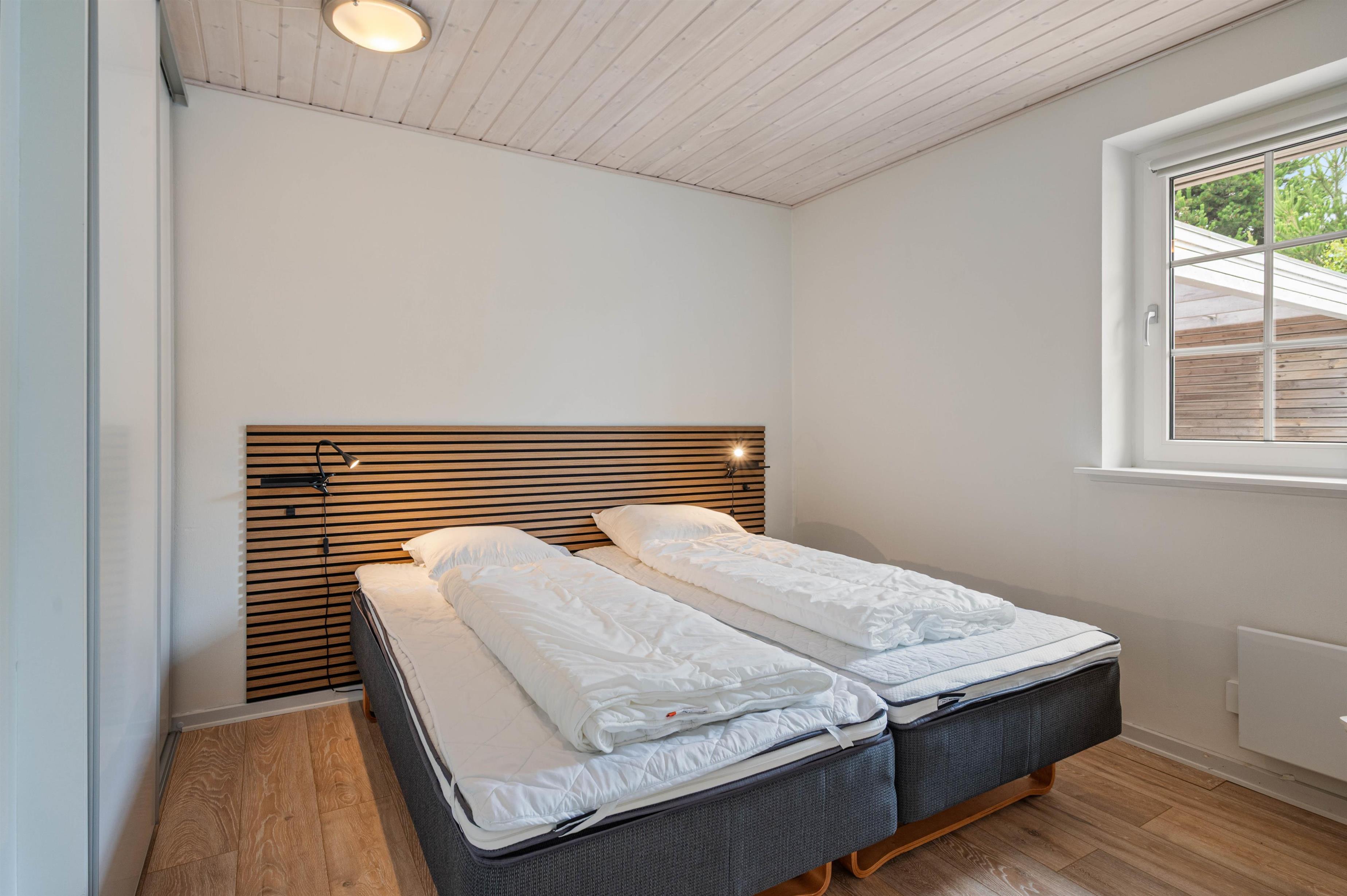 Her er der plads til seks personer fordelt på tre gode soveværelser, alle udstyret med komfortable dobbeltsenge, og pejsen i stuen inviterer til hyggelige aftener efter en dag med strandhygge.