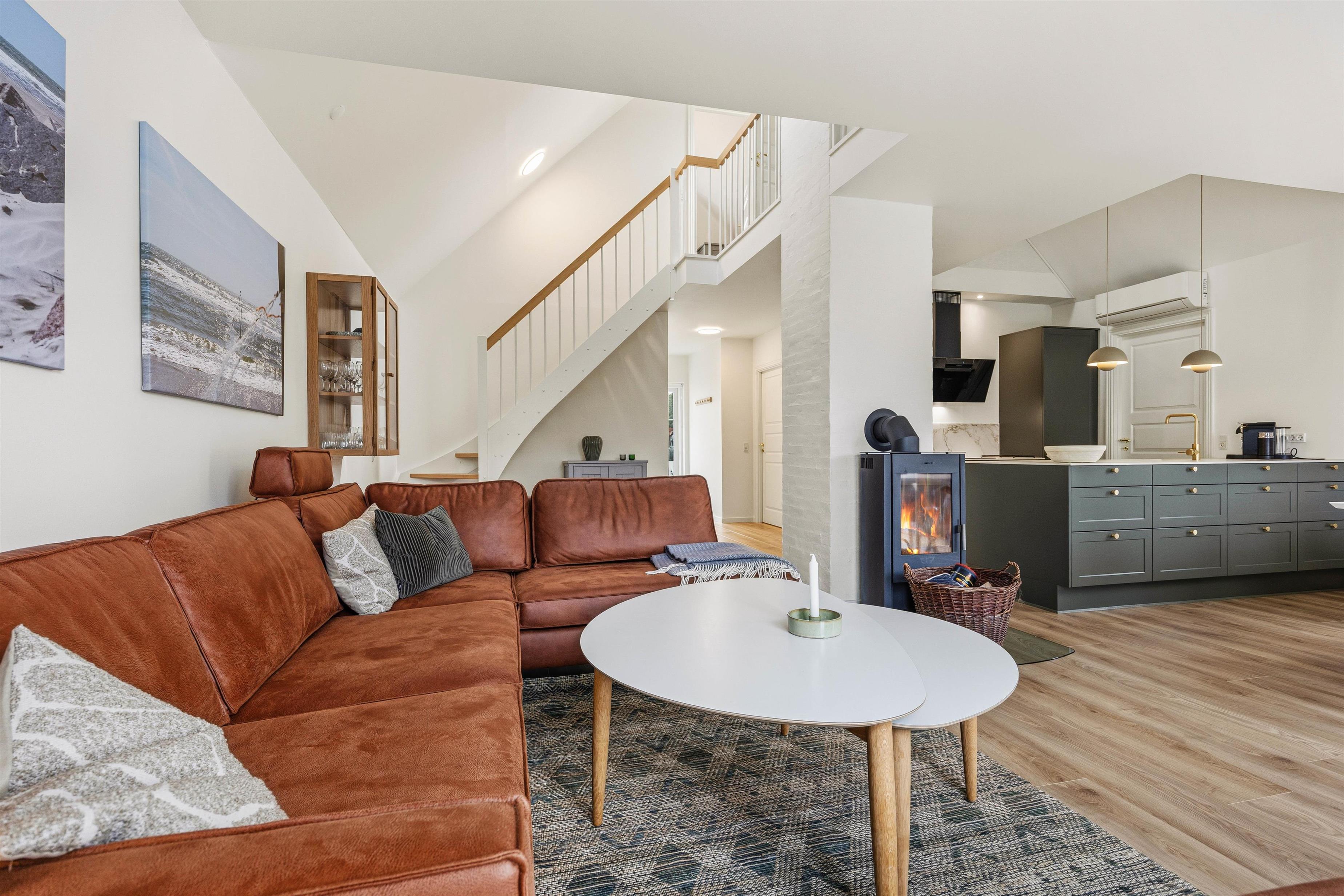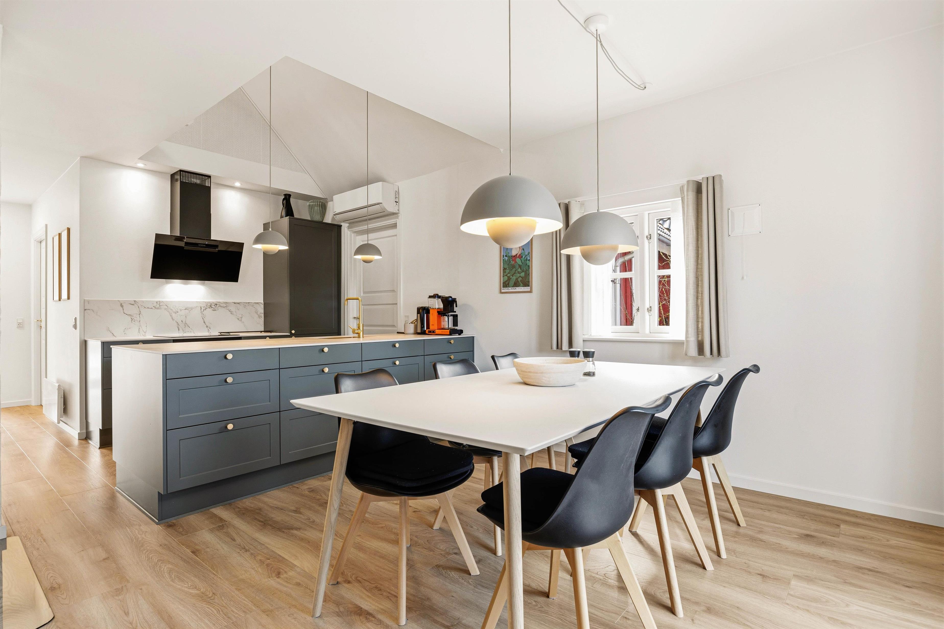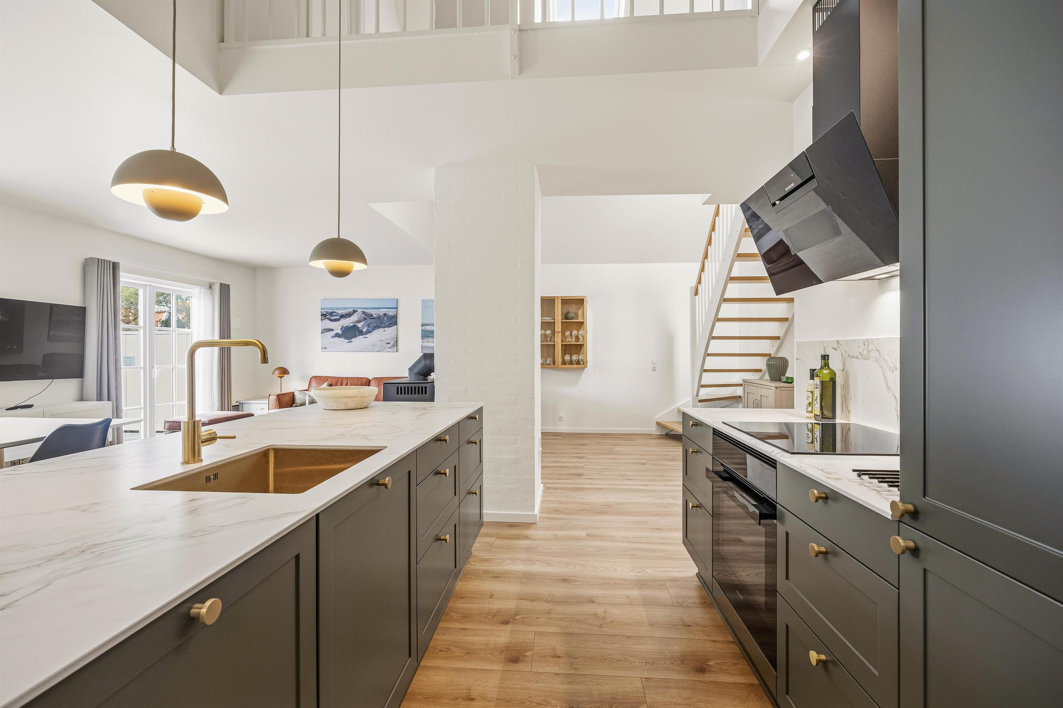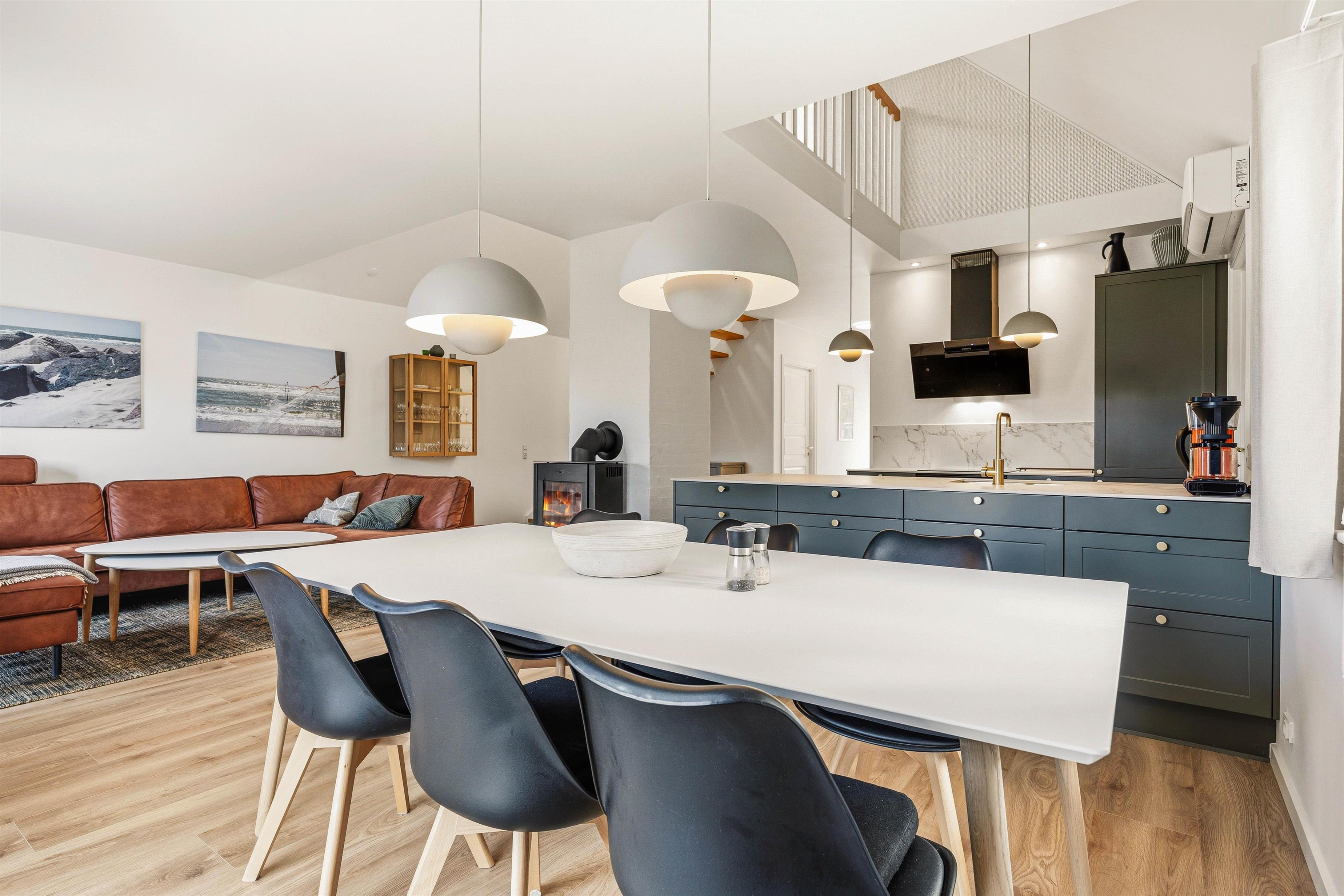 Efter indgang i huset åbner det sig op for jer i det lyse, delvist højloftede rum med køkken/alrum og stue indrettet i en flot, skandinavisk stil. Køkkenet er udstyret med en kombineret ovn/mikroovn og opvaskemaskine, så I nemt kan få lavet dejlige feriemåltider og derefter slippe for at skulle tænke på at skulle ordne opvasken. Skulle I få brug for yderligere fryserkapacitet, råder huset desuden over en separat fryser på 90 liter.