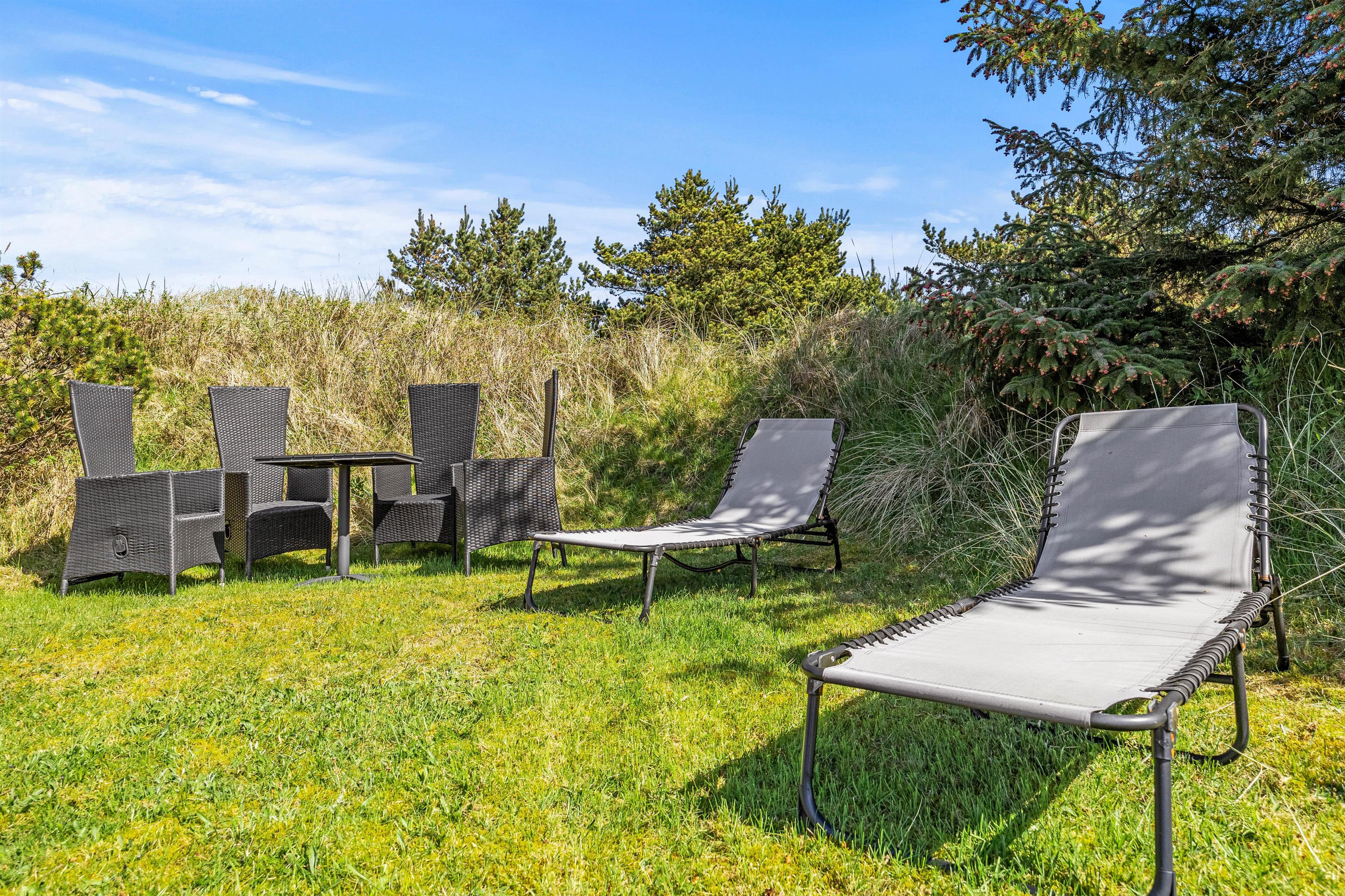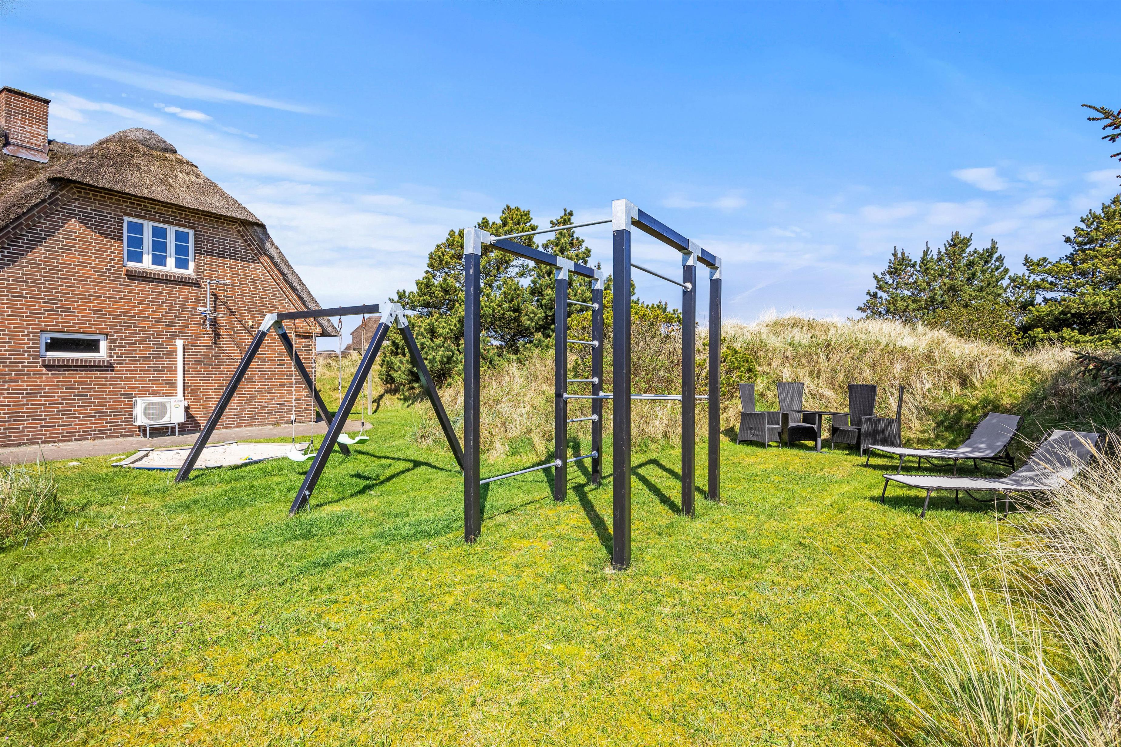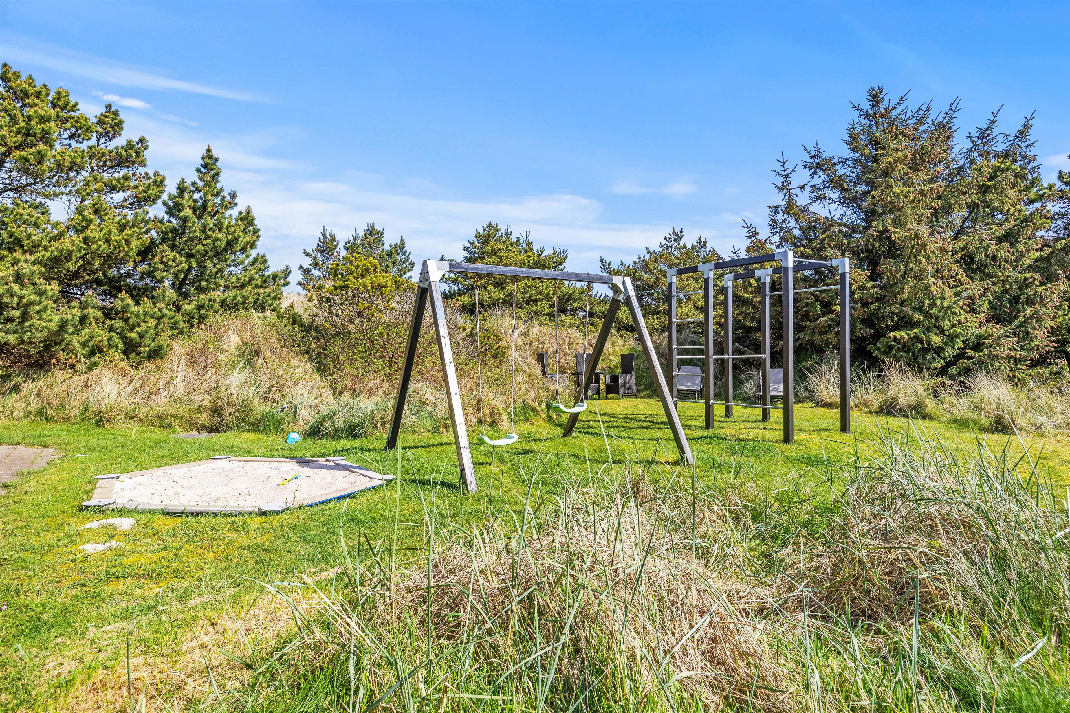 Udeområdet byder på masser af muligheder for familiehygge og leg. Børnene vil elske at lege på sommerhusets fine legeplads med gyngestativ og sandkasse, mens de voksne kan nyde en kop kaffe på terrassen.
