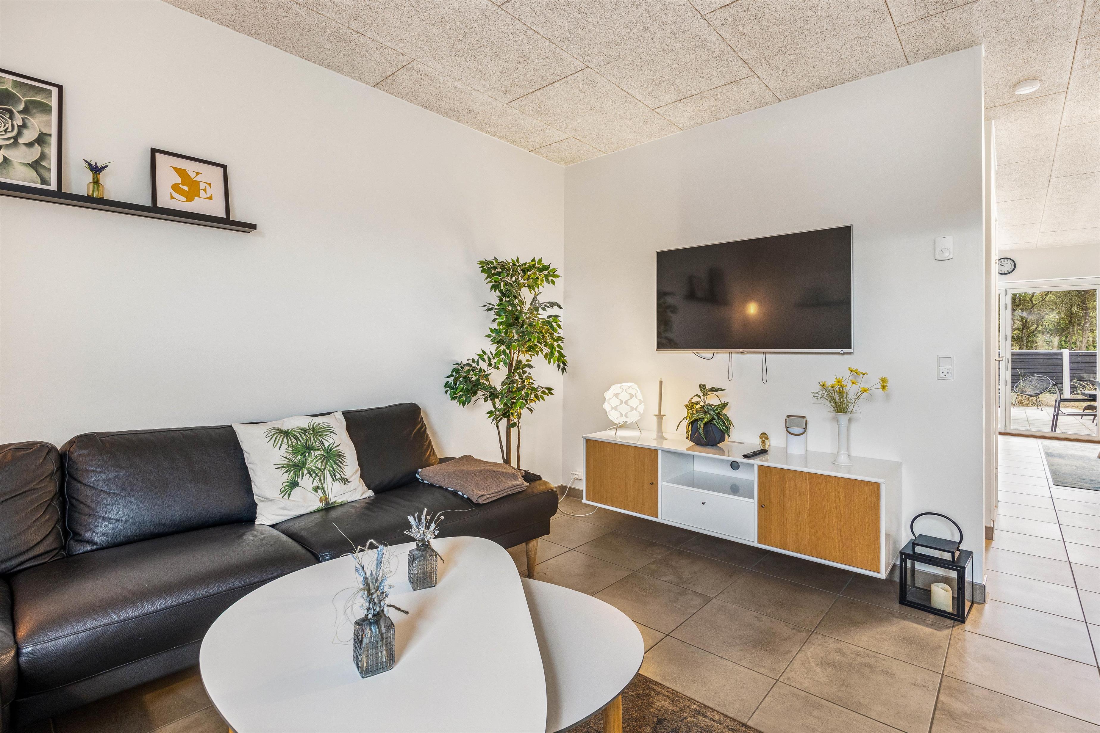 Til hyggelige feriestunder for hele familien kan I samles i sommerhusets stue, hvor I kan se en god film i tv’et. I stuen er der gulvvarme, og derudover har sommerhuset en varmepumpe, der sørger for et godt indeklima på jeres ferie. Mens I slapper af i stuen, står opvaskemaskinen, vaskemaskinen og tørretumbleren for det praktiske husarbejde.
