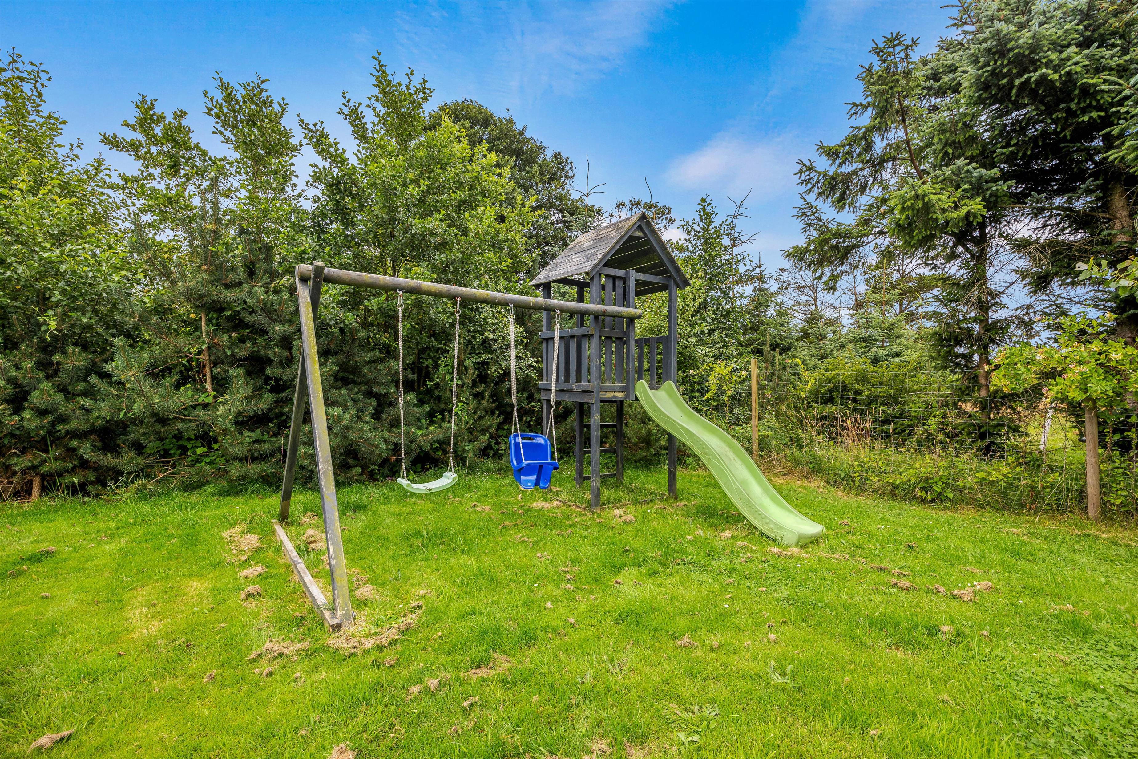Indhegnet grund med gode aktivitetsmuligheder og shelter
