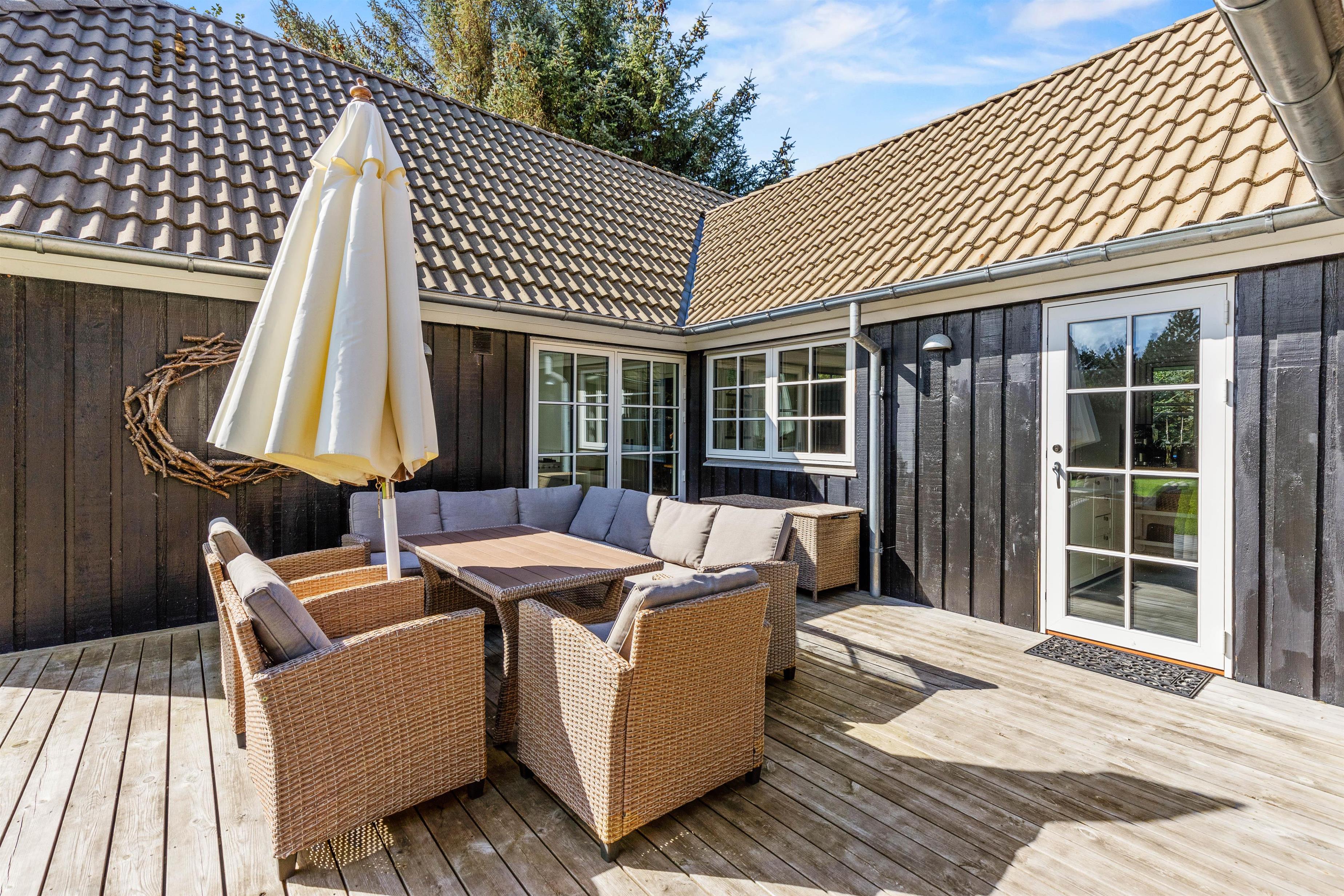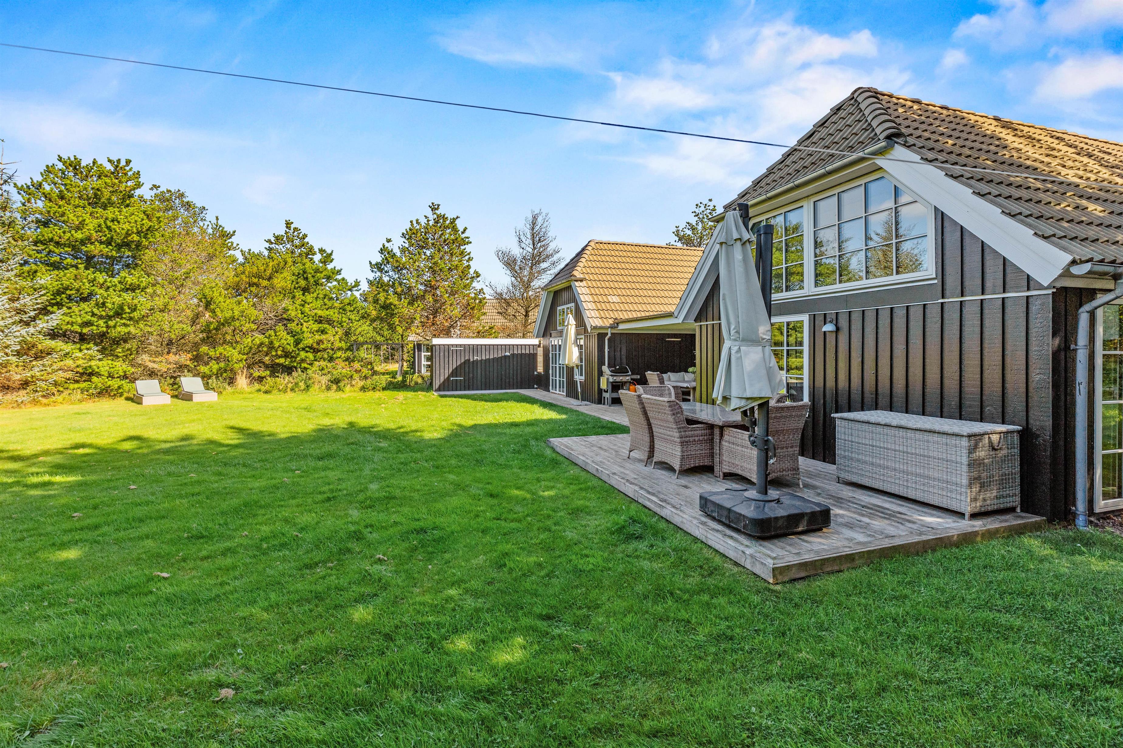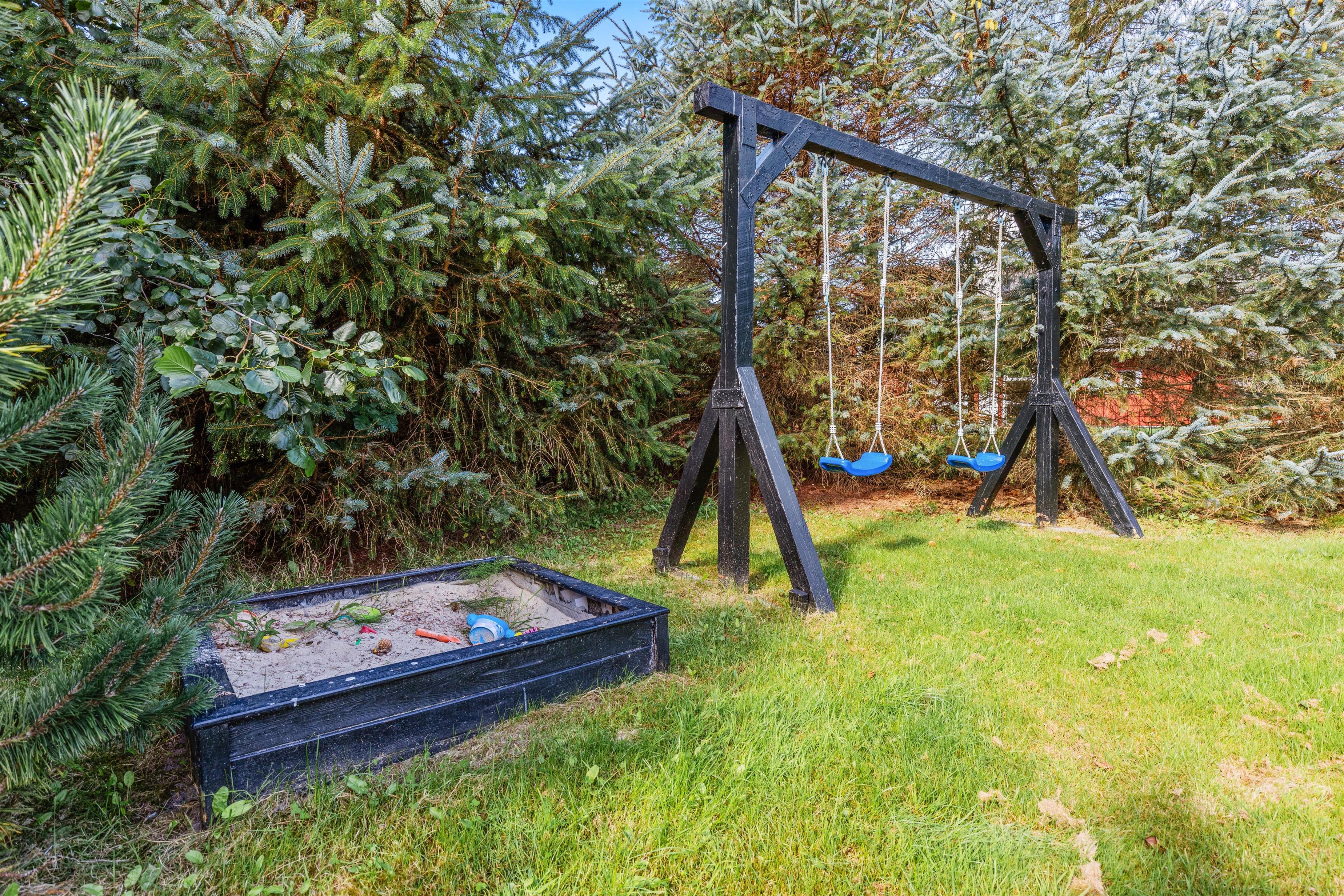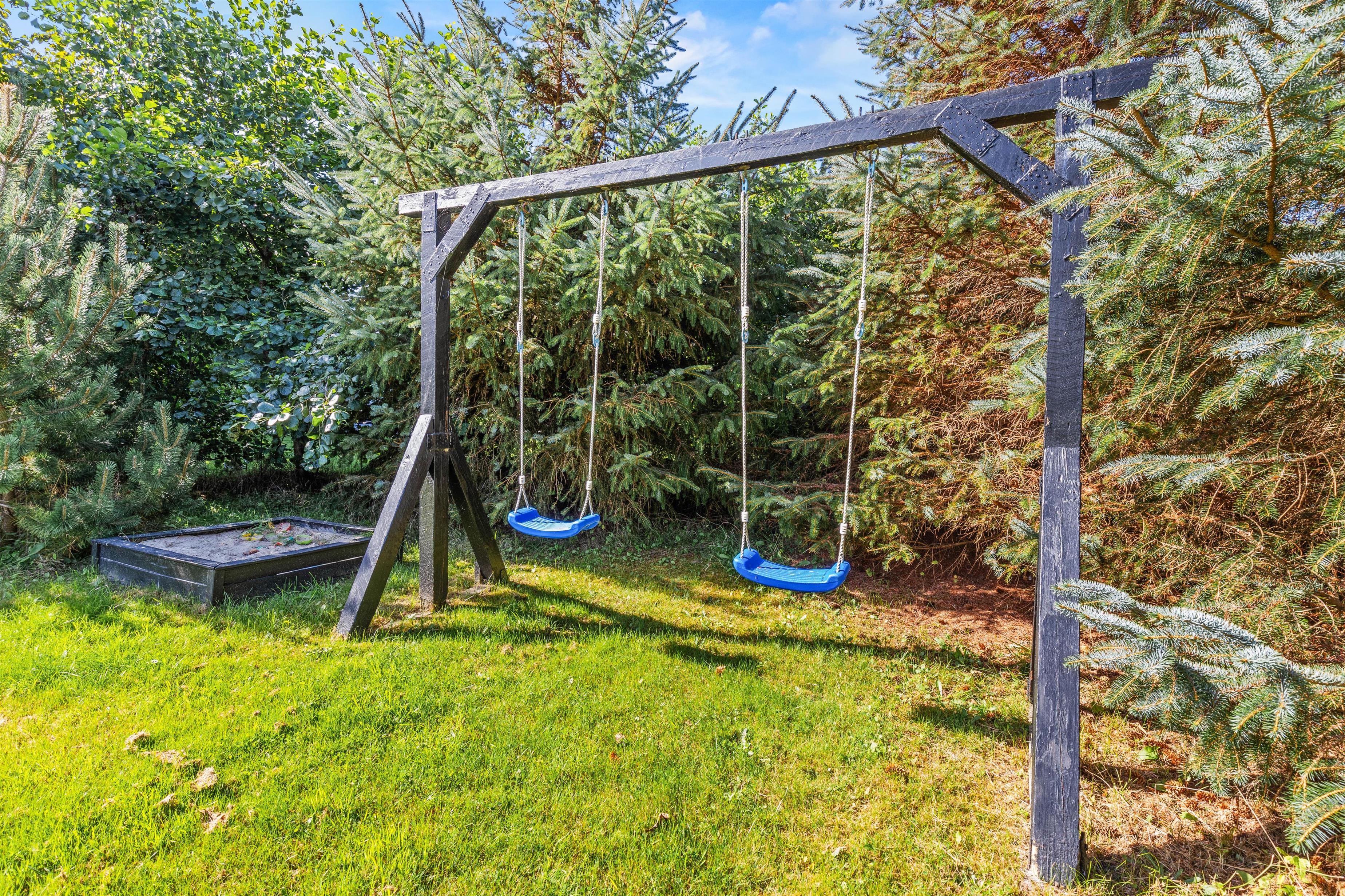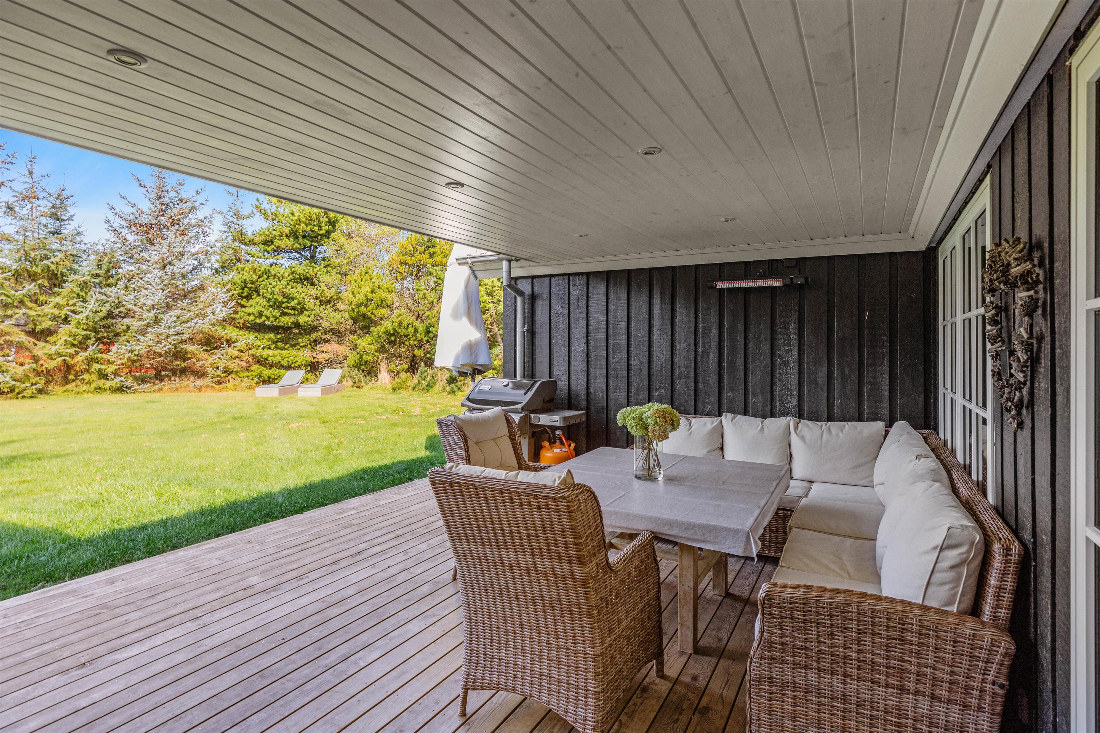 Rundt om feriehuset på Kollemarken 59 har I masser af plads til udendørs liv. Imens børnene leger med hunden i haven, gynger eller bygger slotte i sandkassen, kan I sole jer på liggestolene. Om aftenen kan I nyde grillmaden på den store terrasse, hvor der er god læ for aftenbrisen.