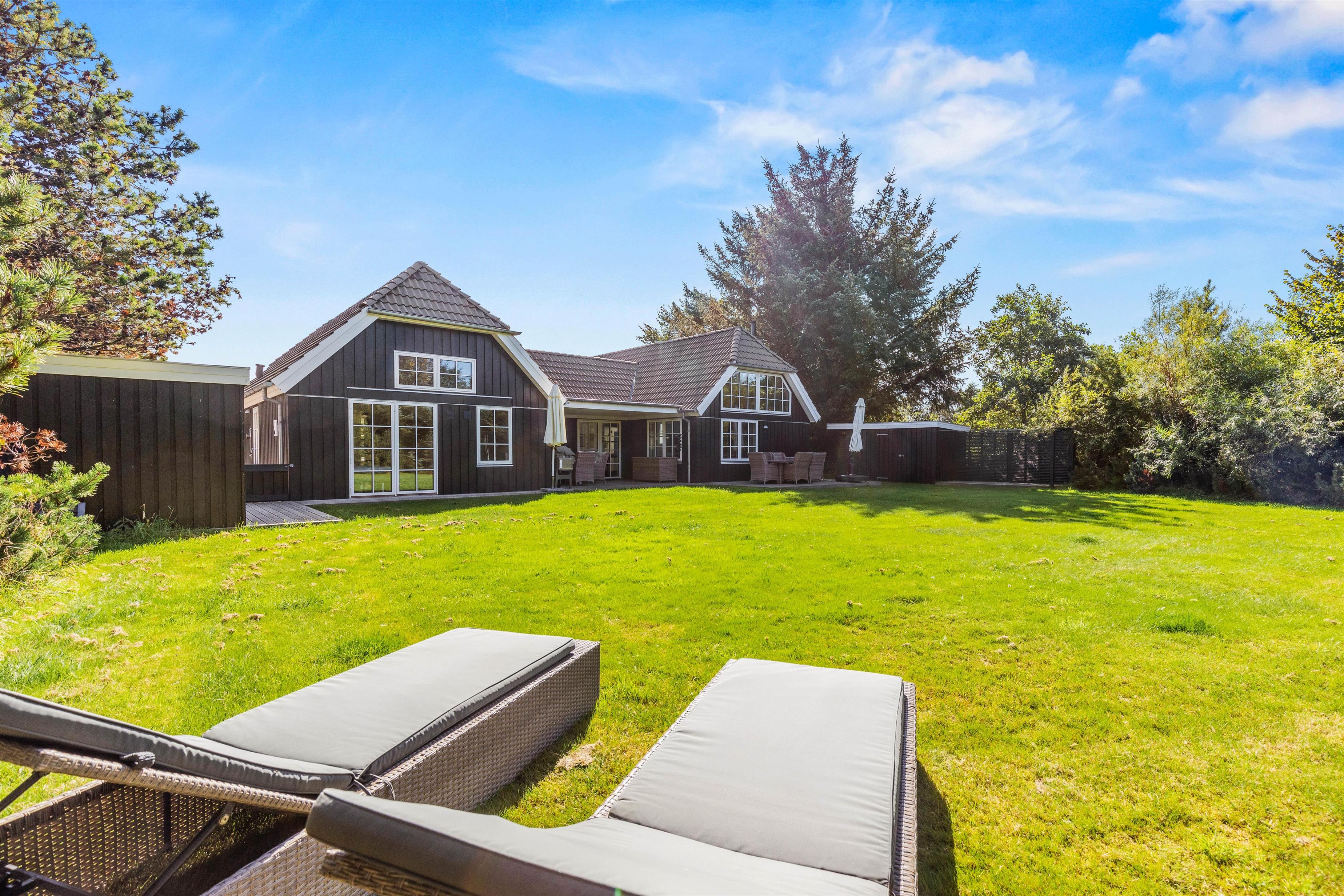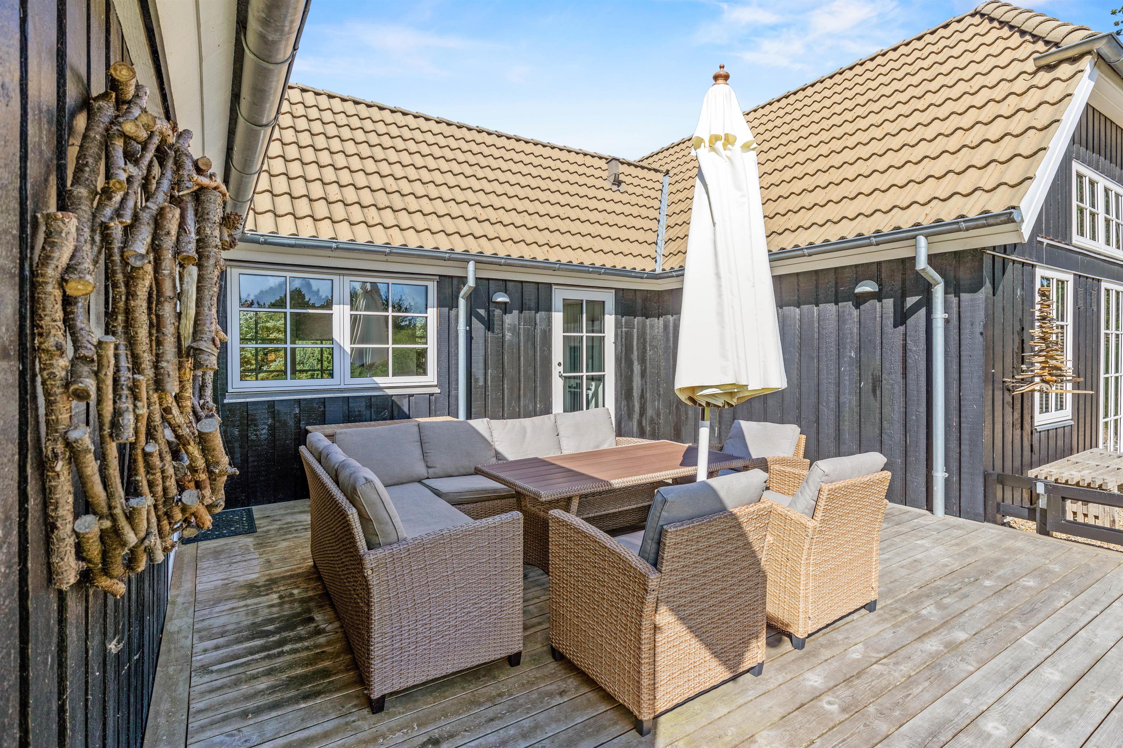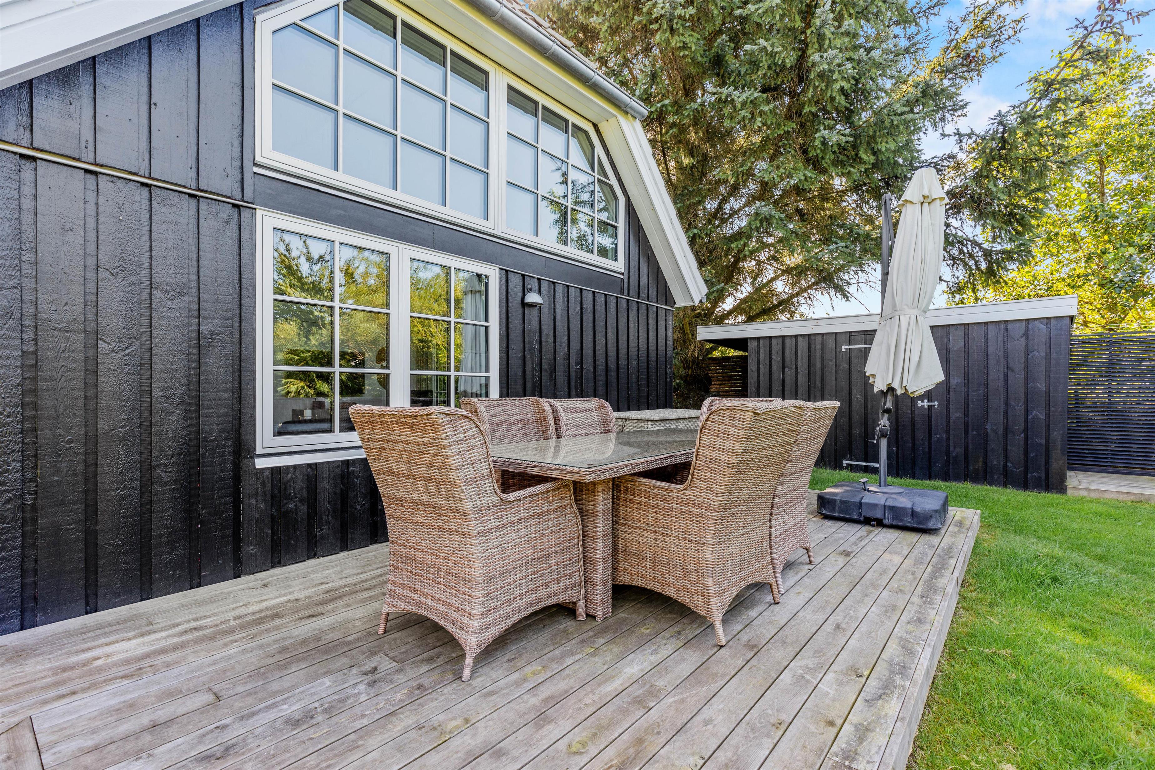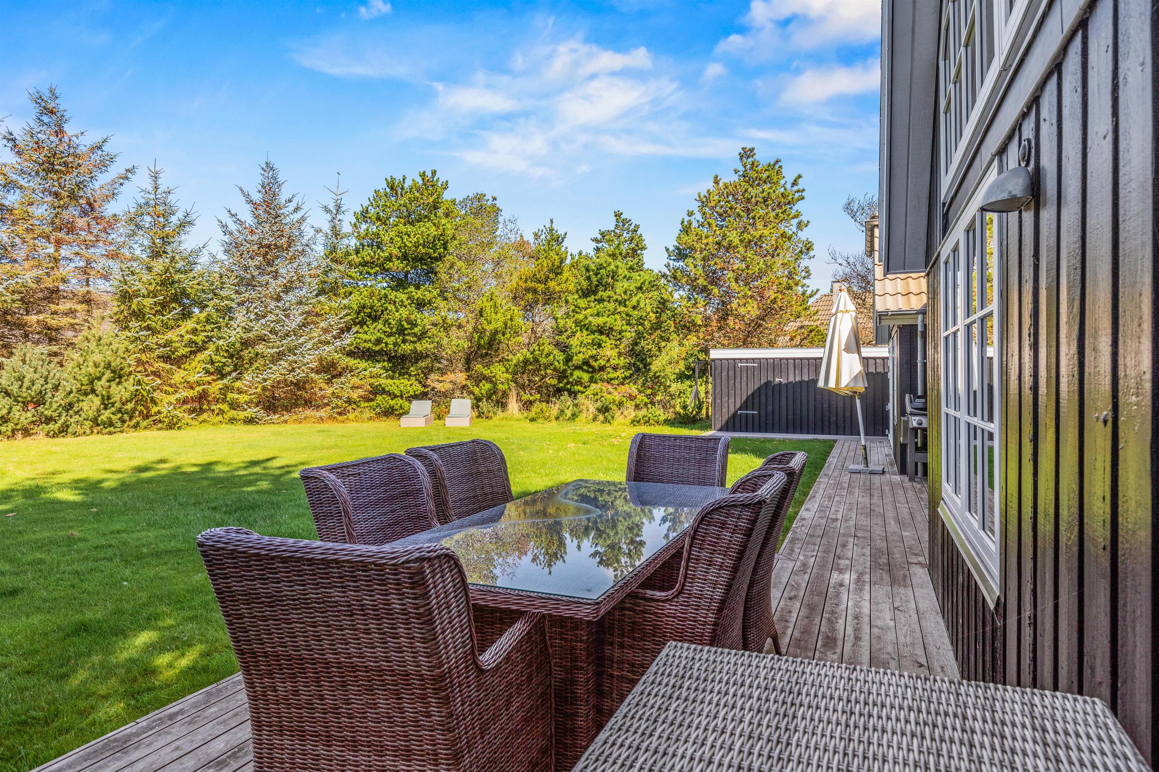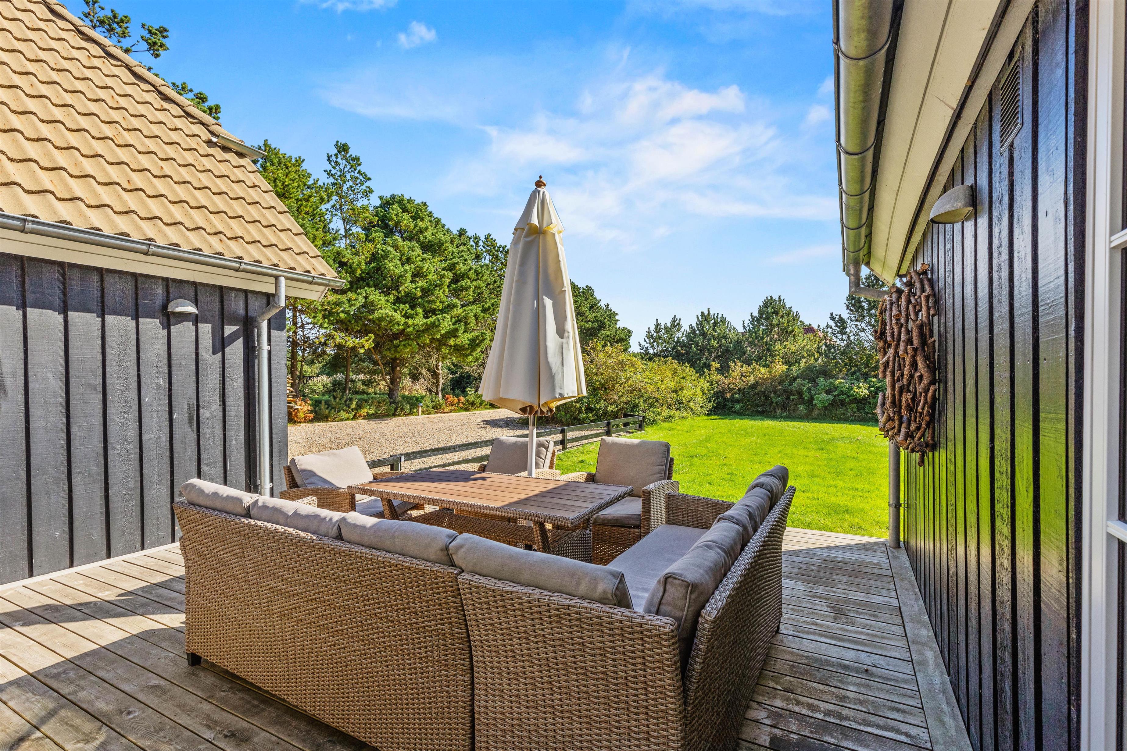 Rundt om feriehuset på Kollemarken 59 har I masser af plads til udendørs liv. Imens børnene leger med hunden i haven, gynger eller bygger slotte i sandkassen, kan I sole jer på liggestolene. Om aftenen kan I nyde grillmaden på den store terrasse, hvor der er god læ for aftenbrisen.