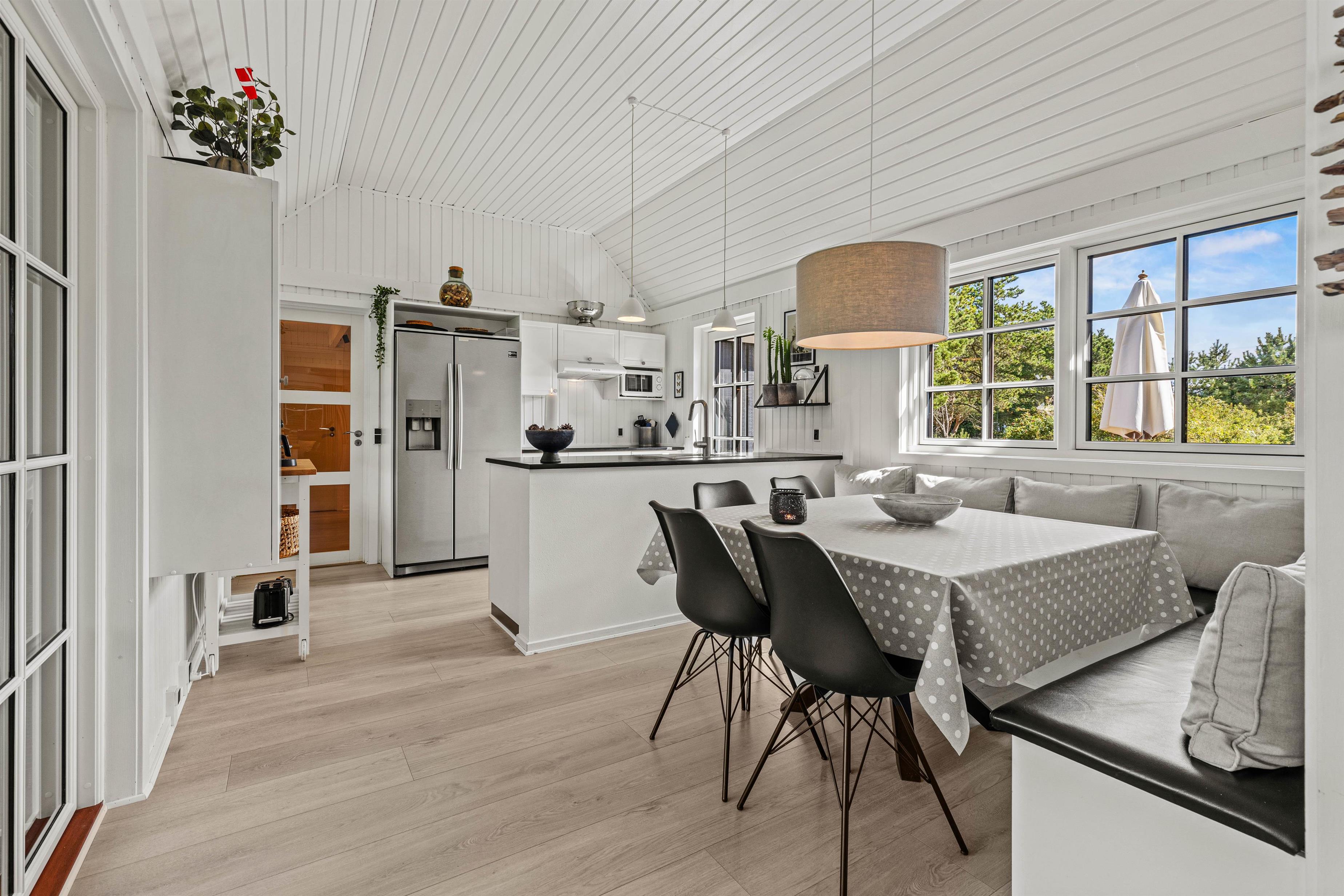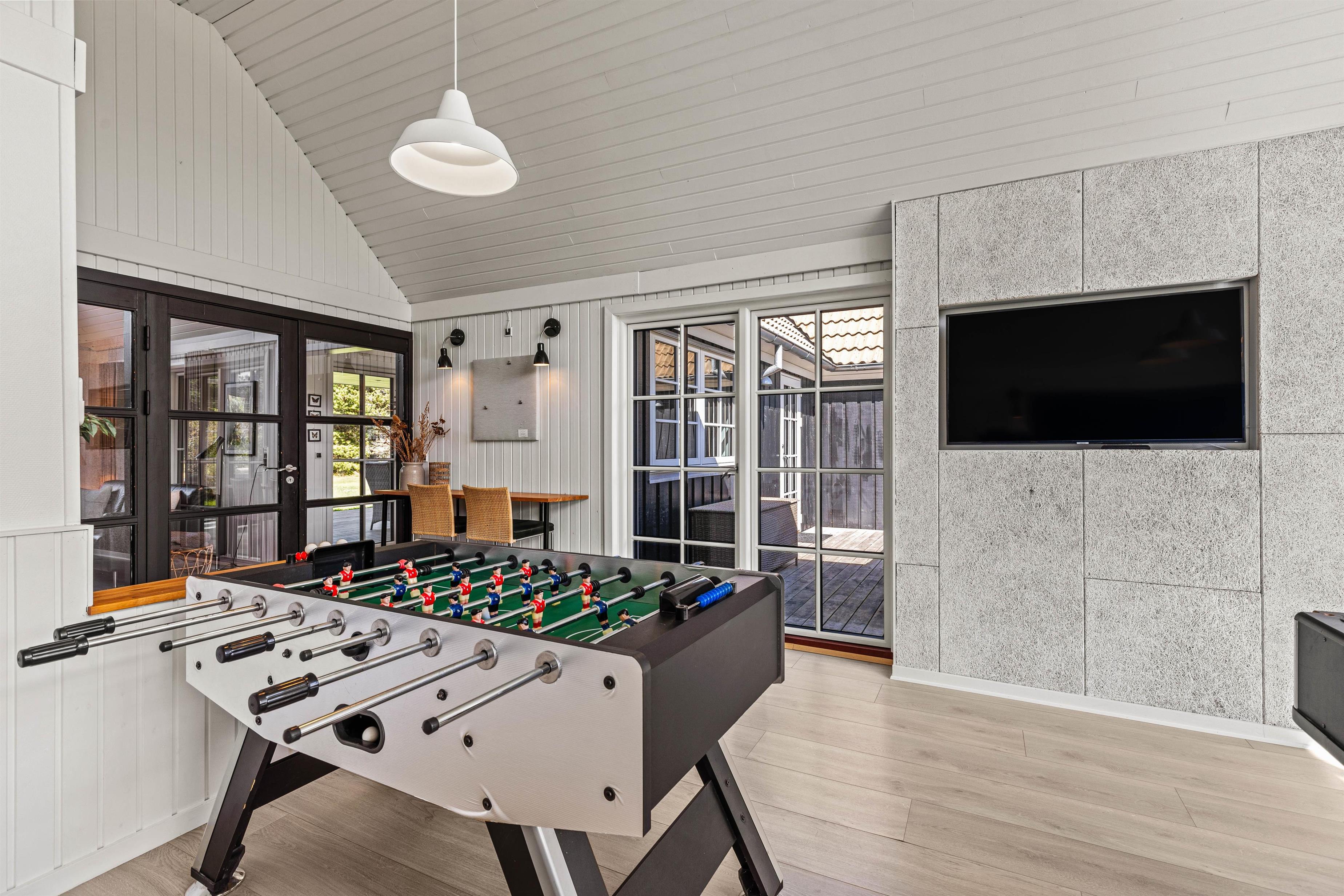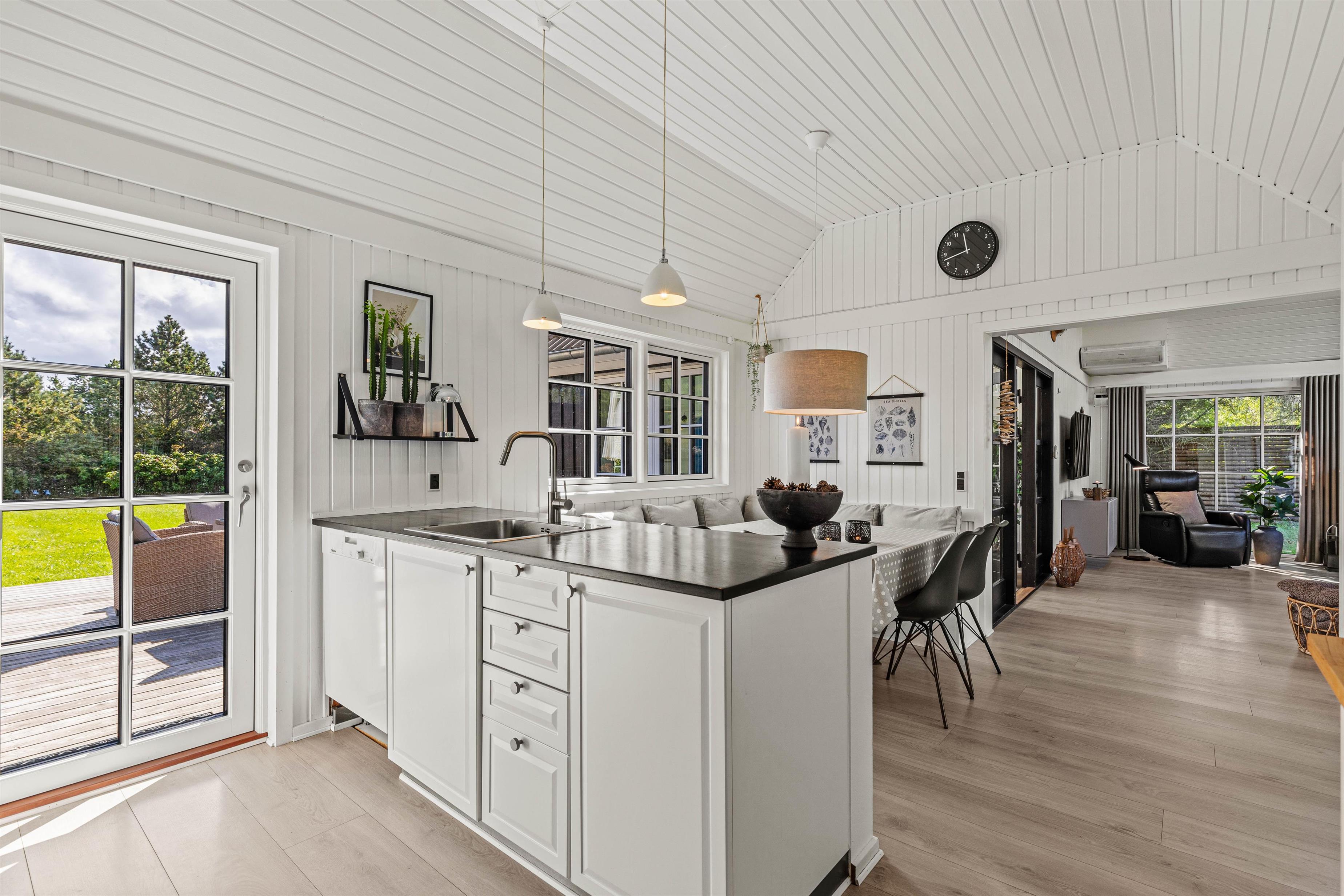 Det 172 m2 store flotte hus er stilfuldt indrette og rummer alle vigtige faciliteter og mere til. De store lyse fællesrum – det moderne køkken og stuen med brændeovnen og et opholdsrum med pool billard, air hockey eller bordtennis lover masser af fælles feriehygge. Her føler hele familien sig godt tilpas, og en regnvejrsdag kan sagtens blive til feriens hyggeligste! I det moderne køkken er der naturligvis opvaskemaskine og det store køleskab lover kolde drinks med masser af is på varme dage. Naturligvis er huset udstyret med både vaskemaskine og tørretumbler.