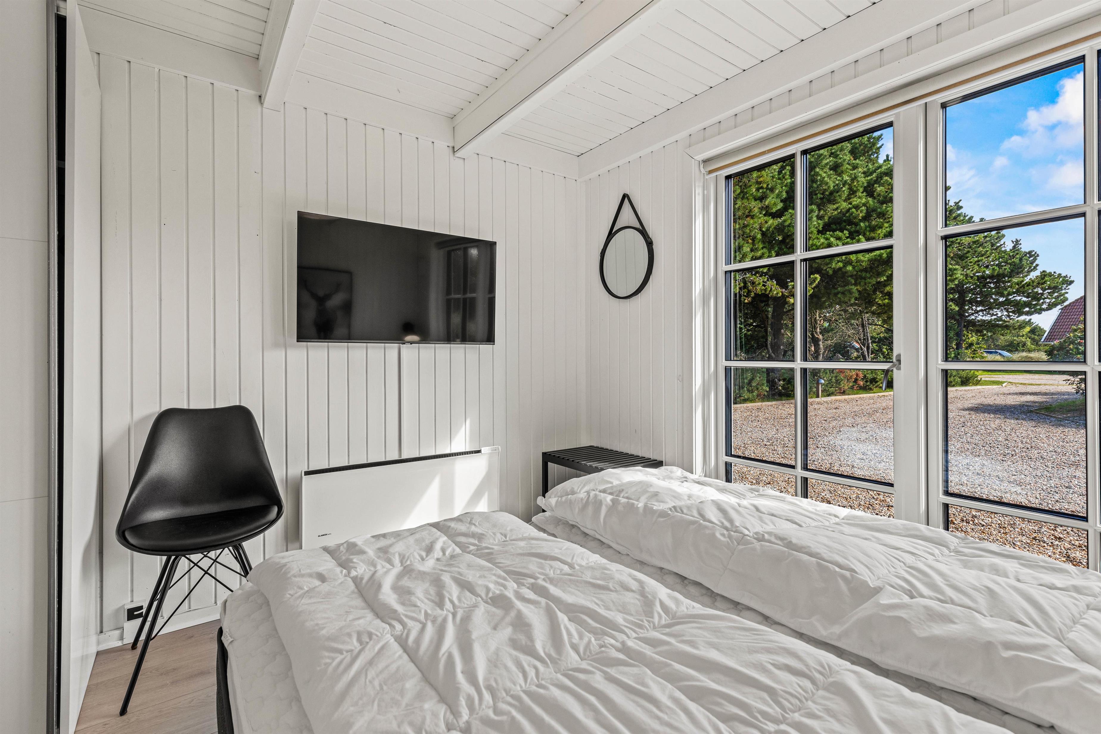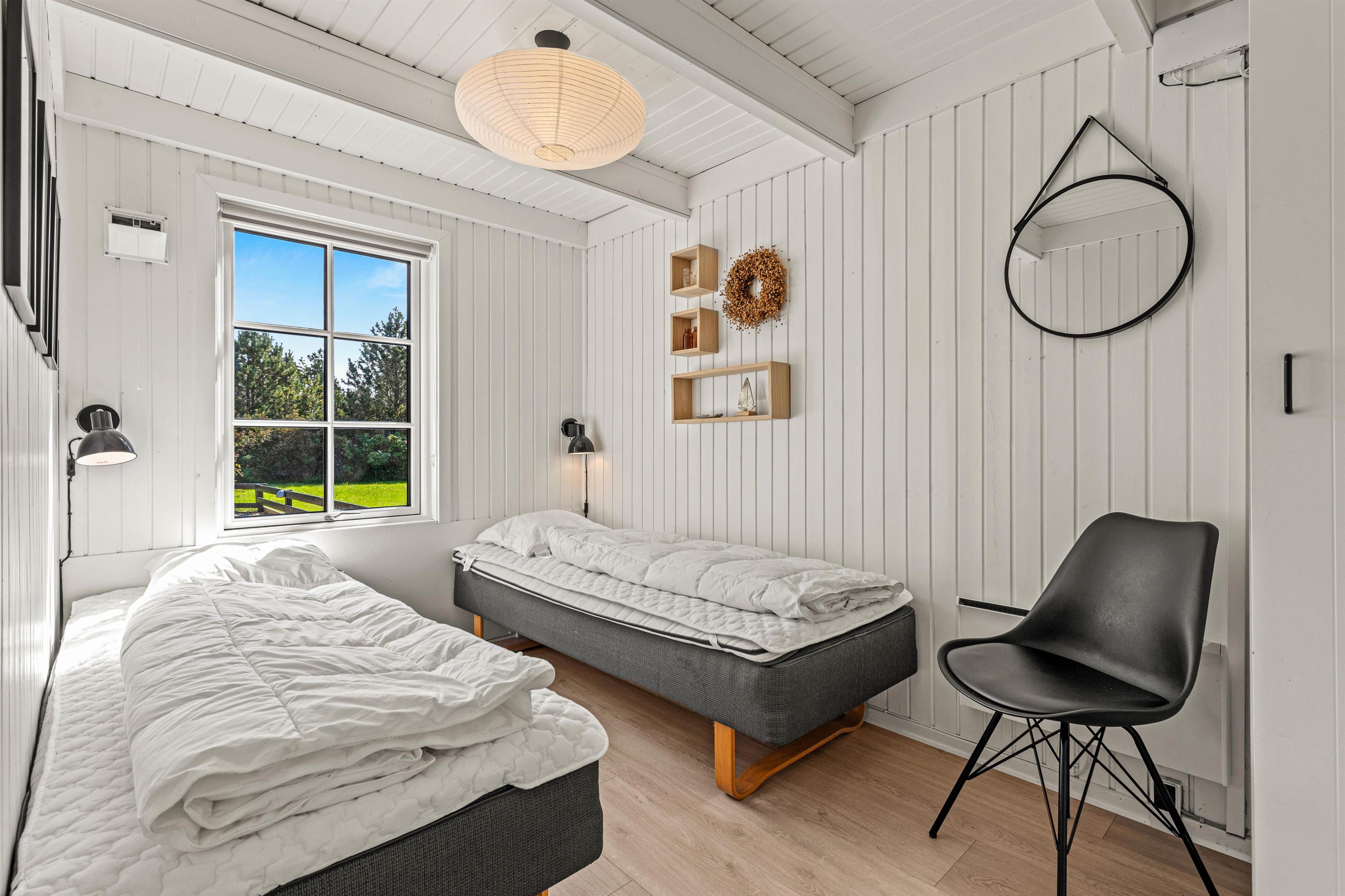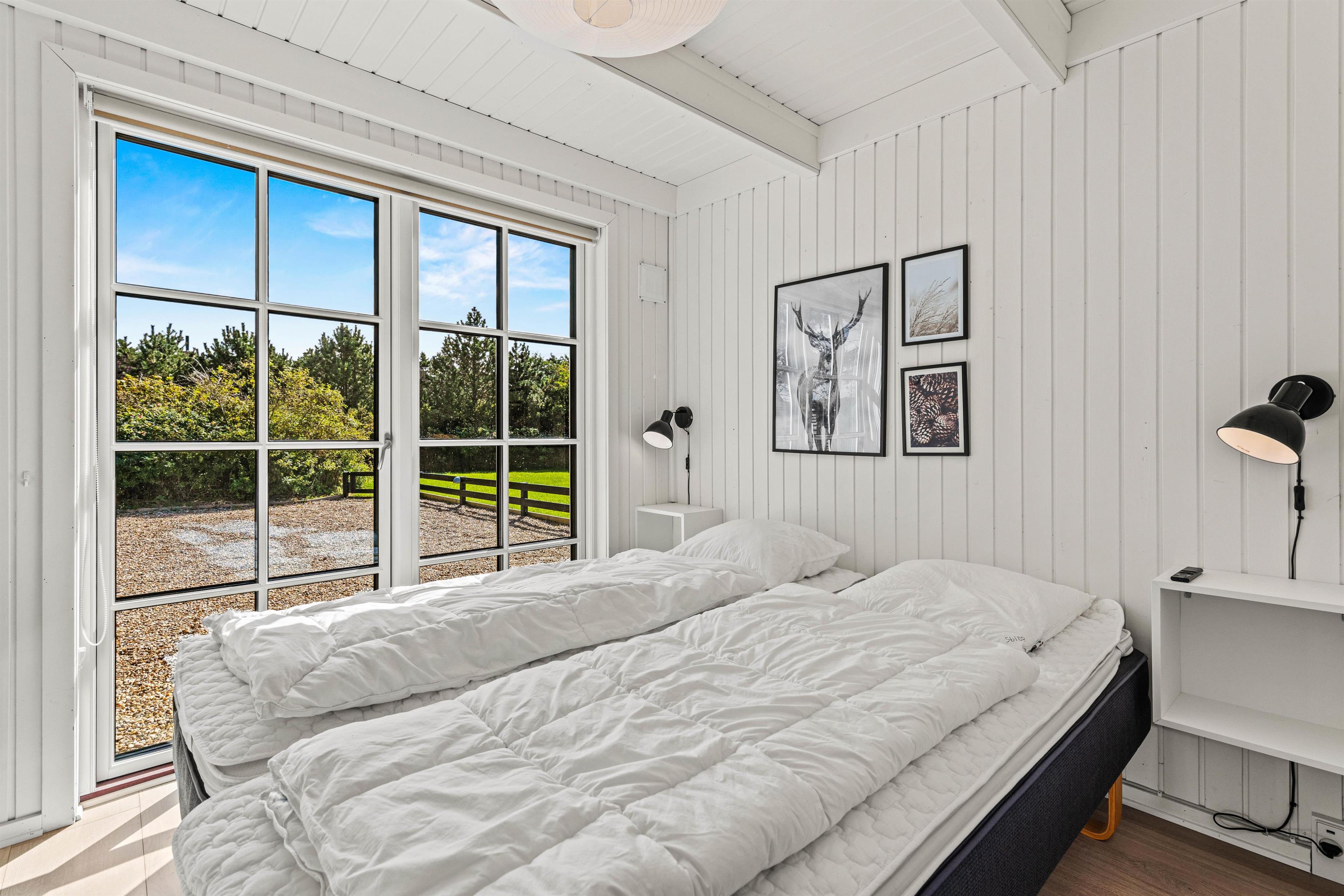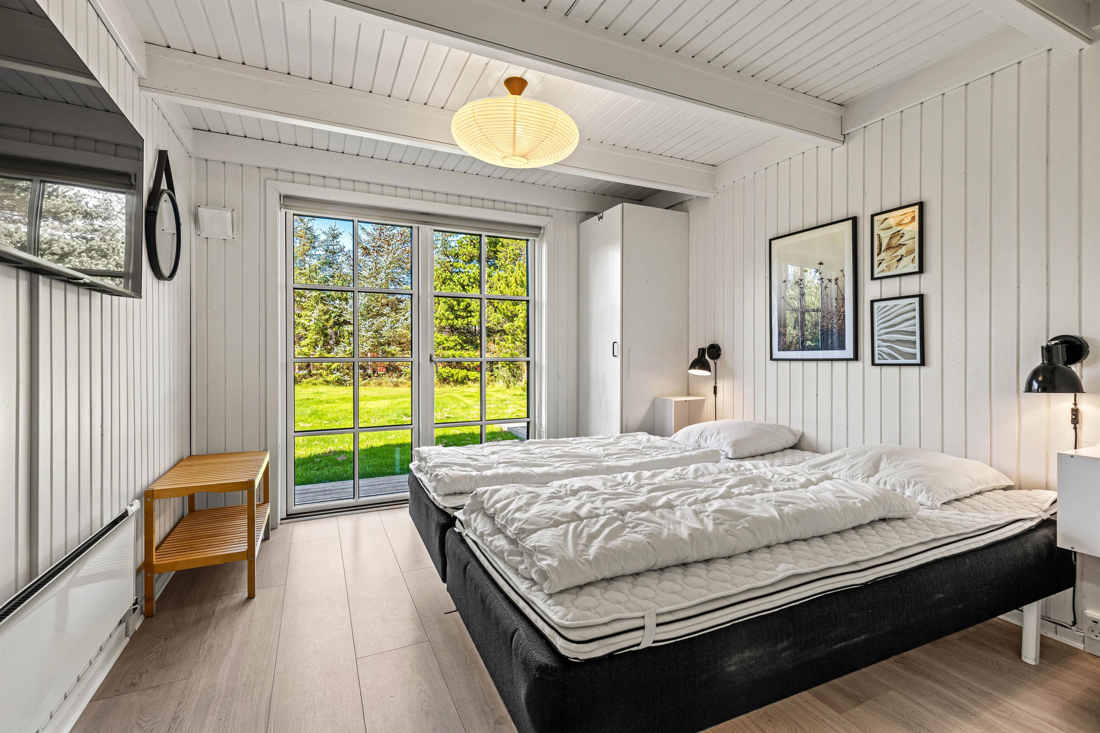 Kollemarken 59 har en praktisk opdeling med 2 soveafdelinger – begge med et masterbedroom med egen terrasseudgang og et værelse med 2 enkeltsenge. For rigtig afslapning kan I tænde op i husets sauna, der ligger i forbindelse med det ene af de 2 badeværelser.
