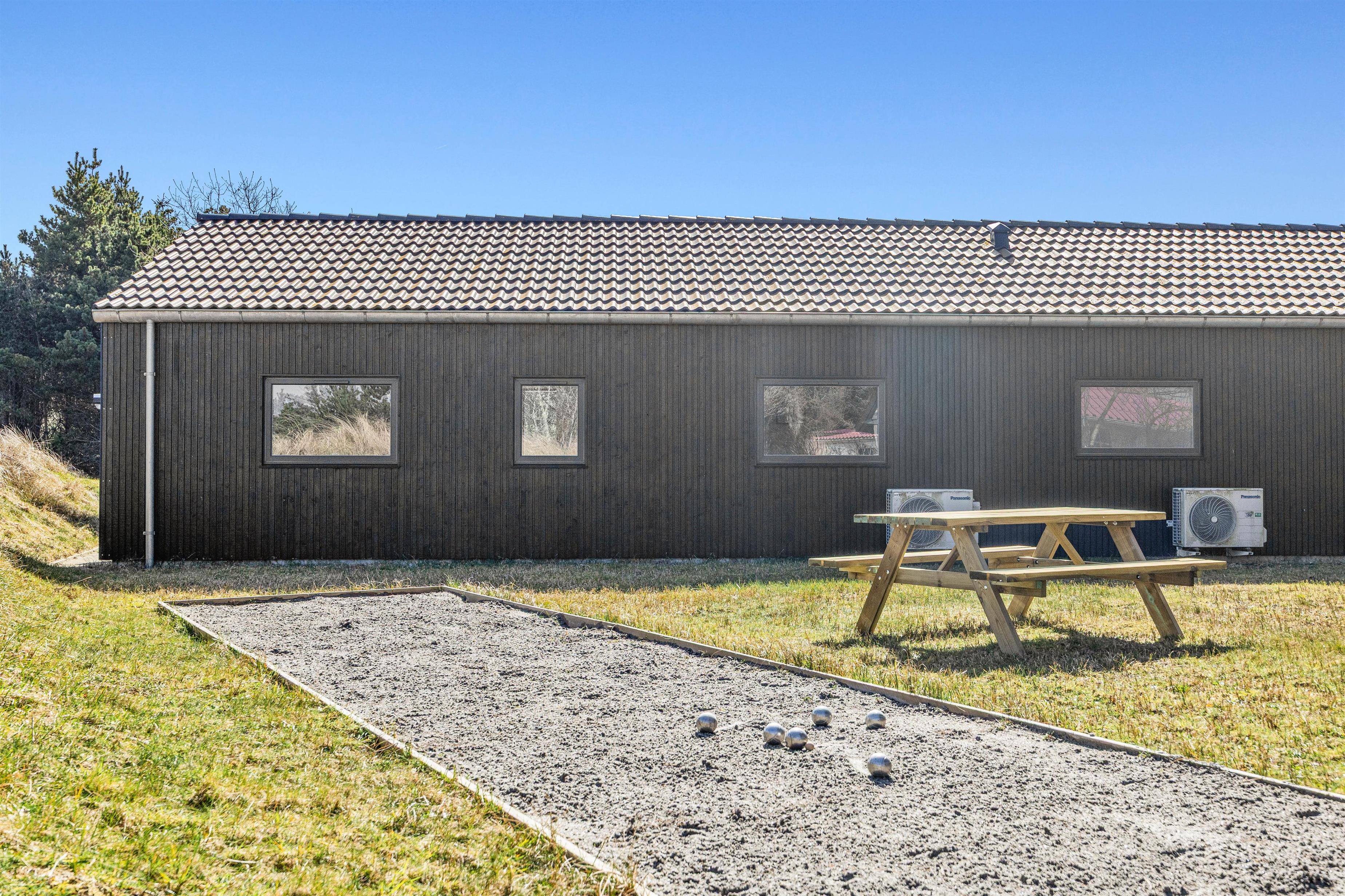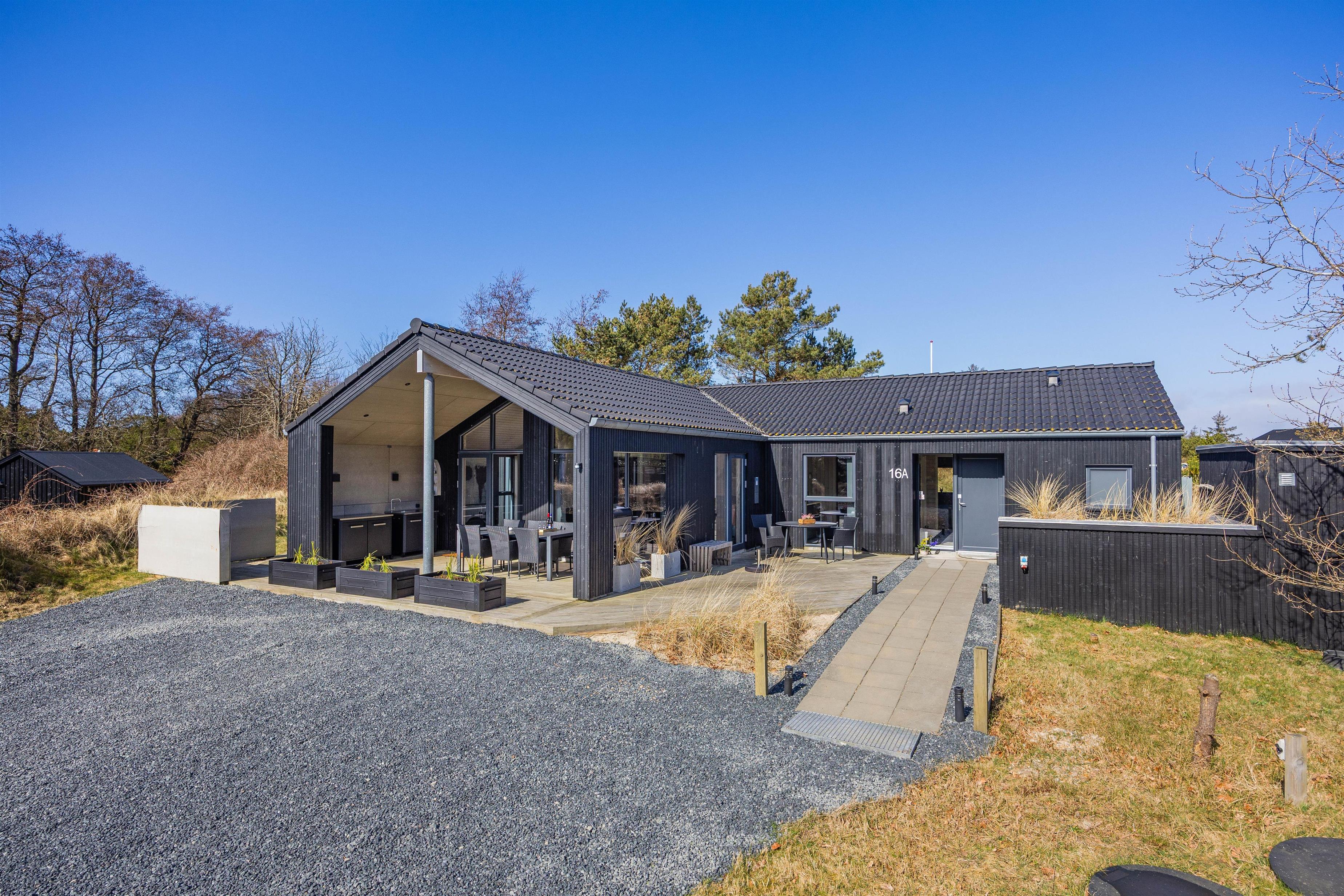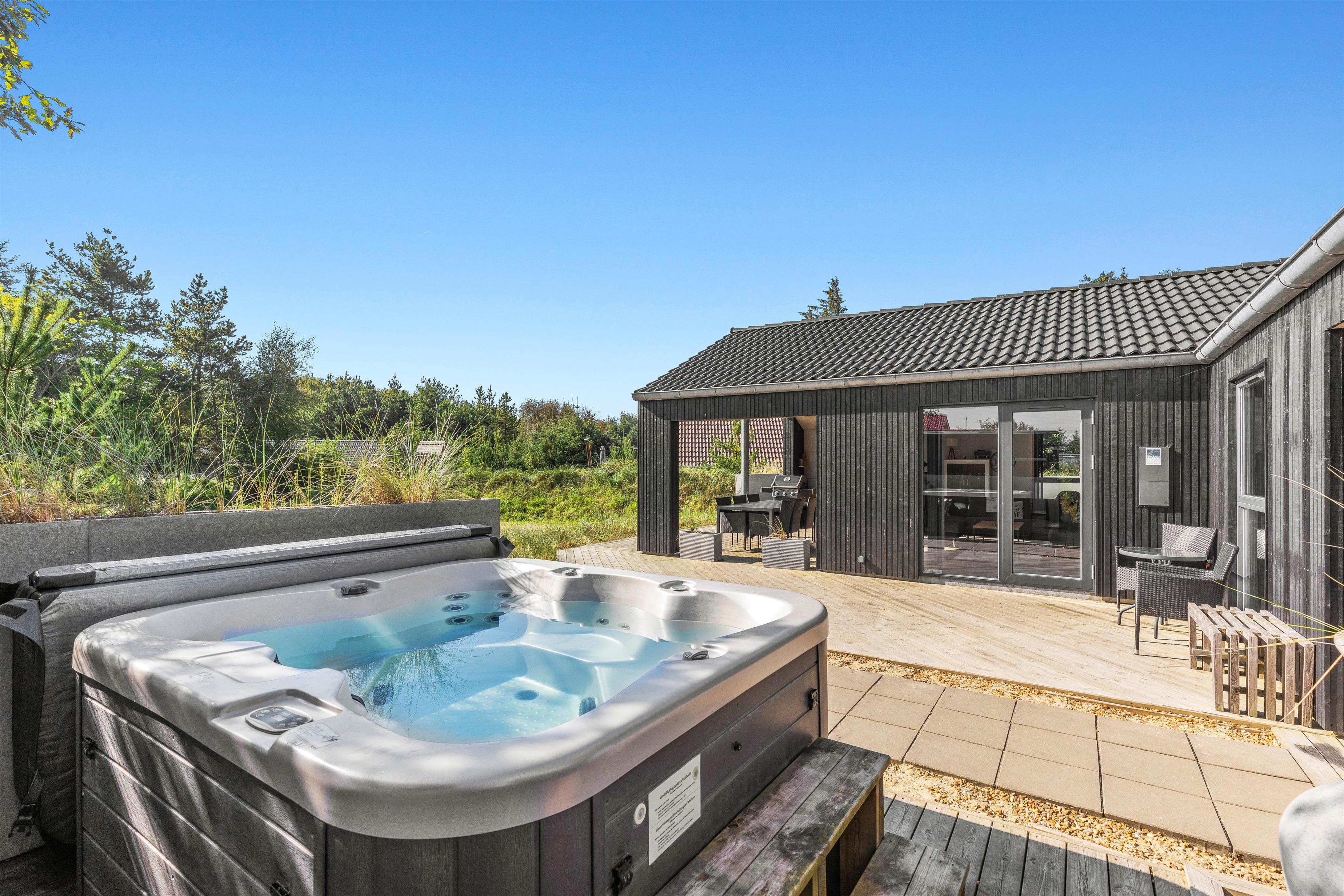 Dette sommerhus i Blåvand har plads til 8 personer og inviterer til en luksuriøs ferie ved Vesterhavet. Et moderne indre med aktivitetsrum, infrarød sauna, udendørs spabad på terrassen og petanquebane er blot nogle af de faciliteter, Bjergbovej 16A, har at byde på.