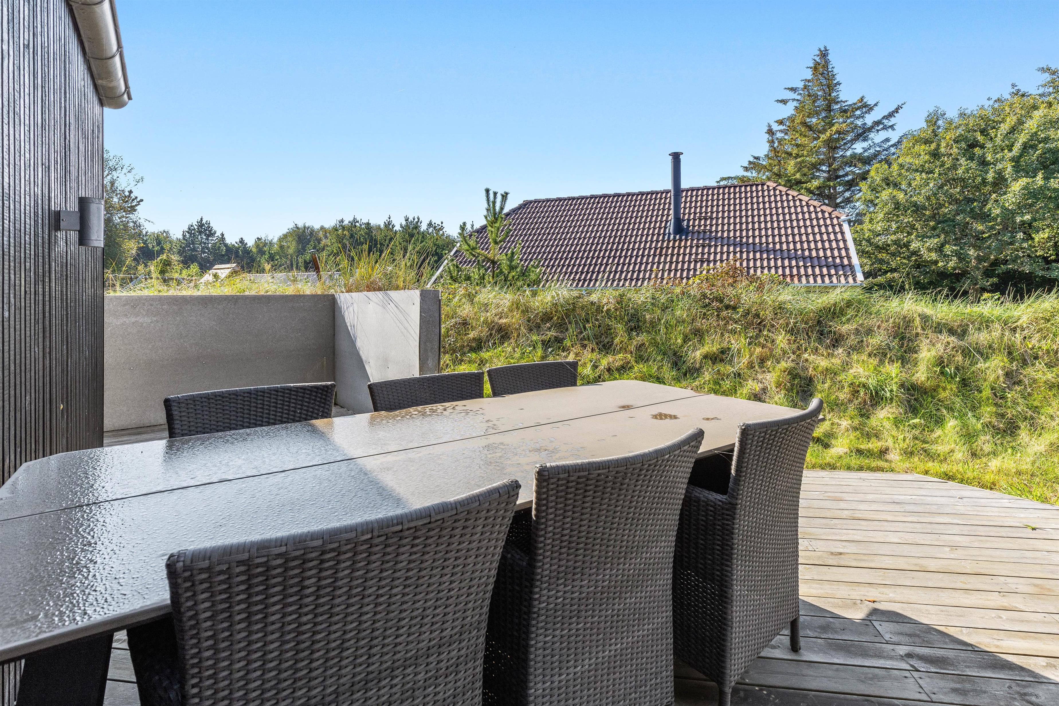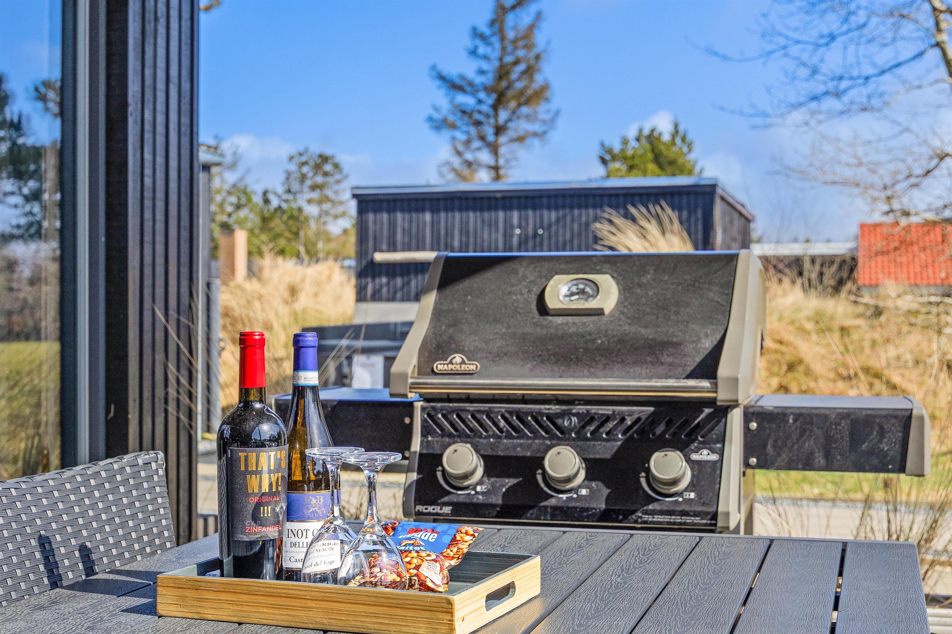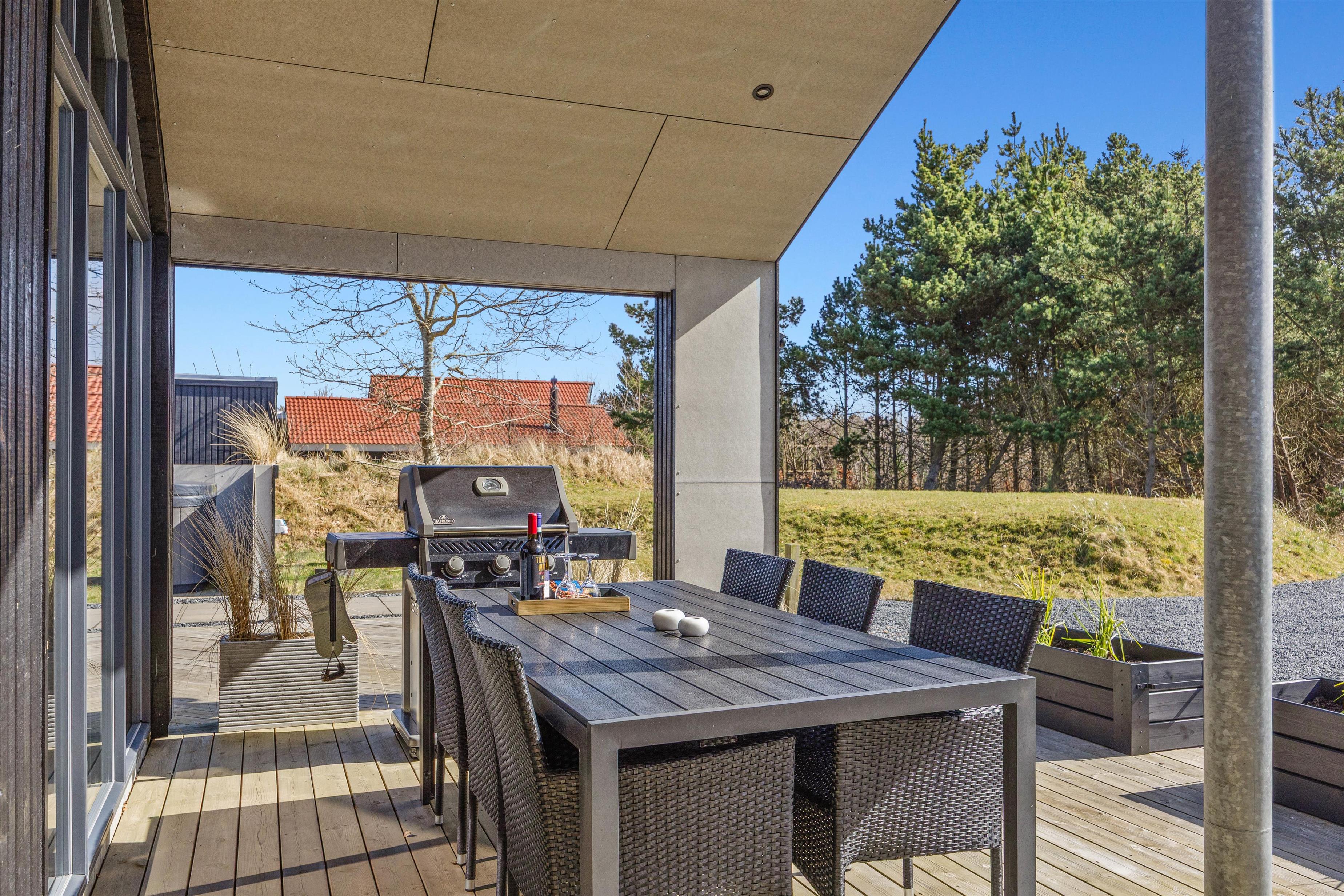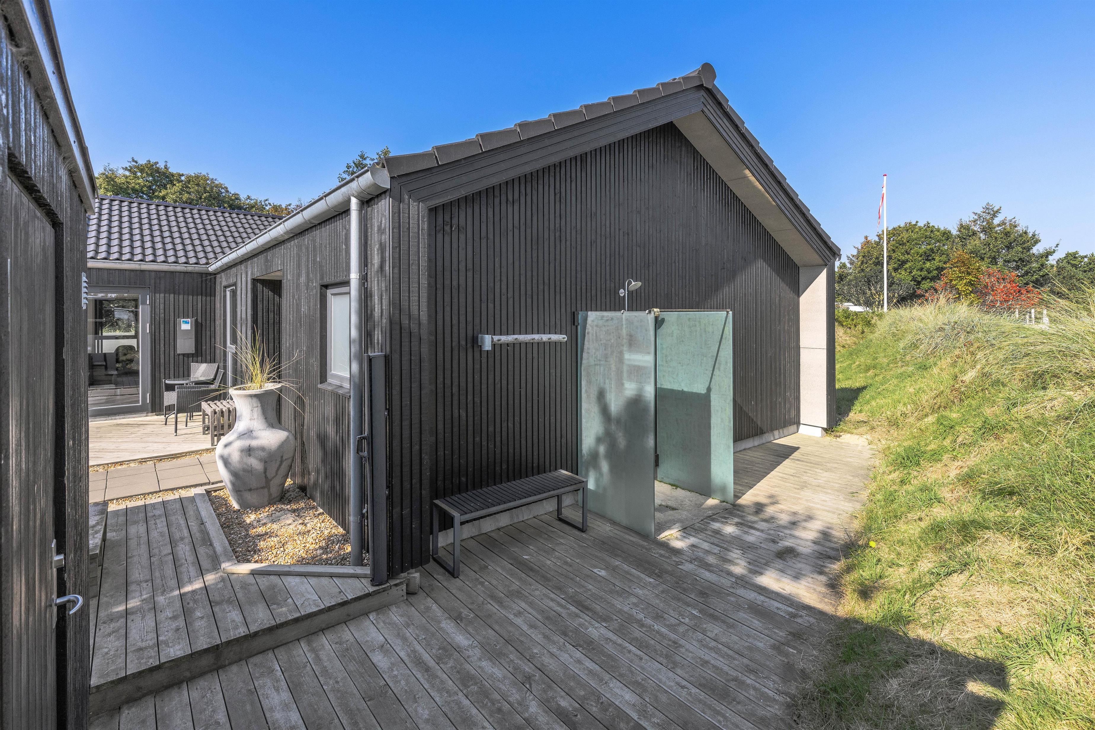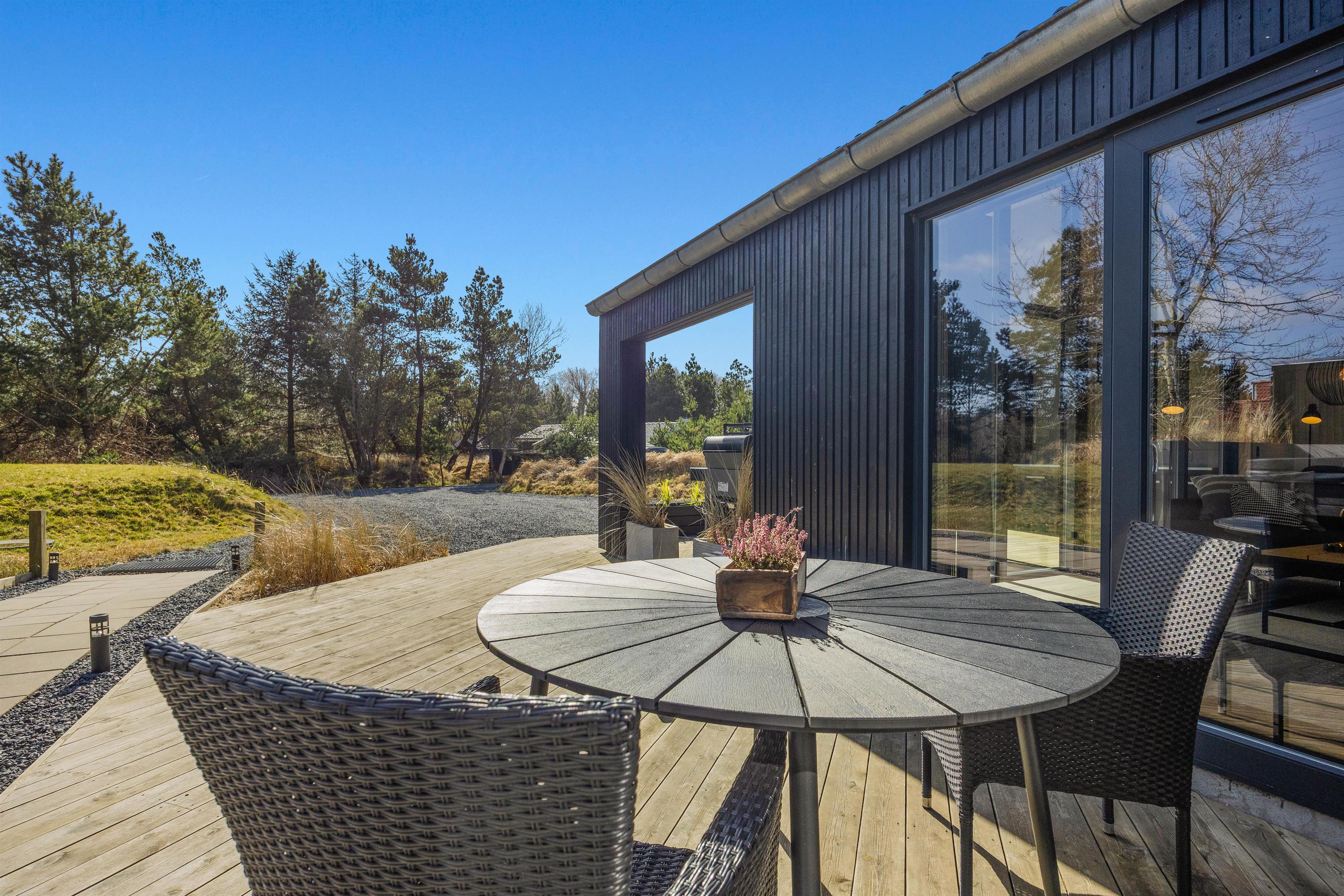 Luksussommerhuset har 3 gode terrasser med både en åben, afskærmet og overdækket del. Der er sørget for gode havemøbler, liggestole og en gasgrill, så I kan nyde de dejlige feriedage i den friske luft fuldt ud. Der er også en petanquebane på grunden. Den installerede udebruser kan benyttes i perioden 1. april til 31. oktober.