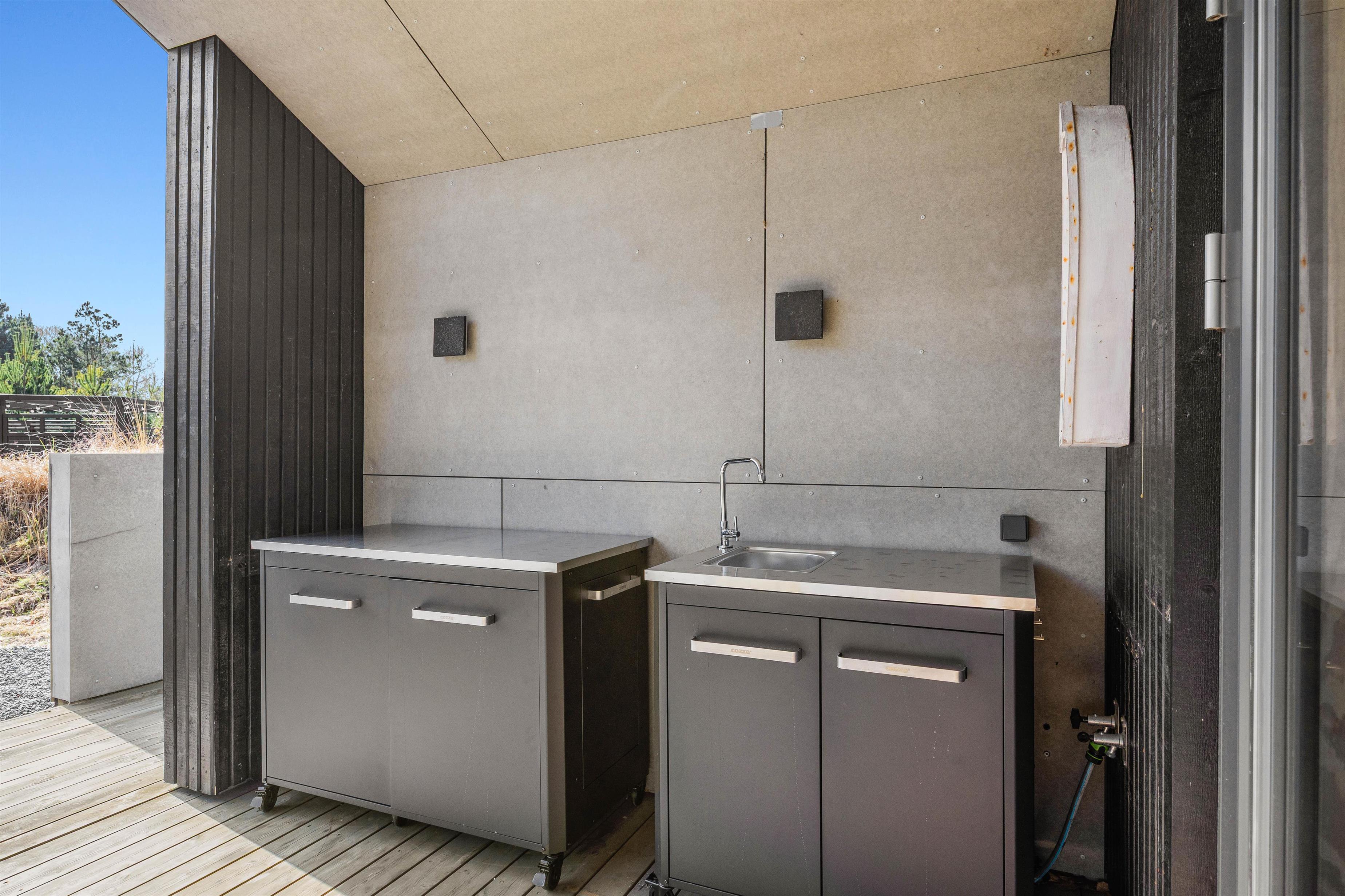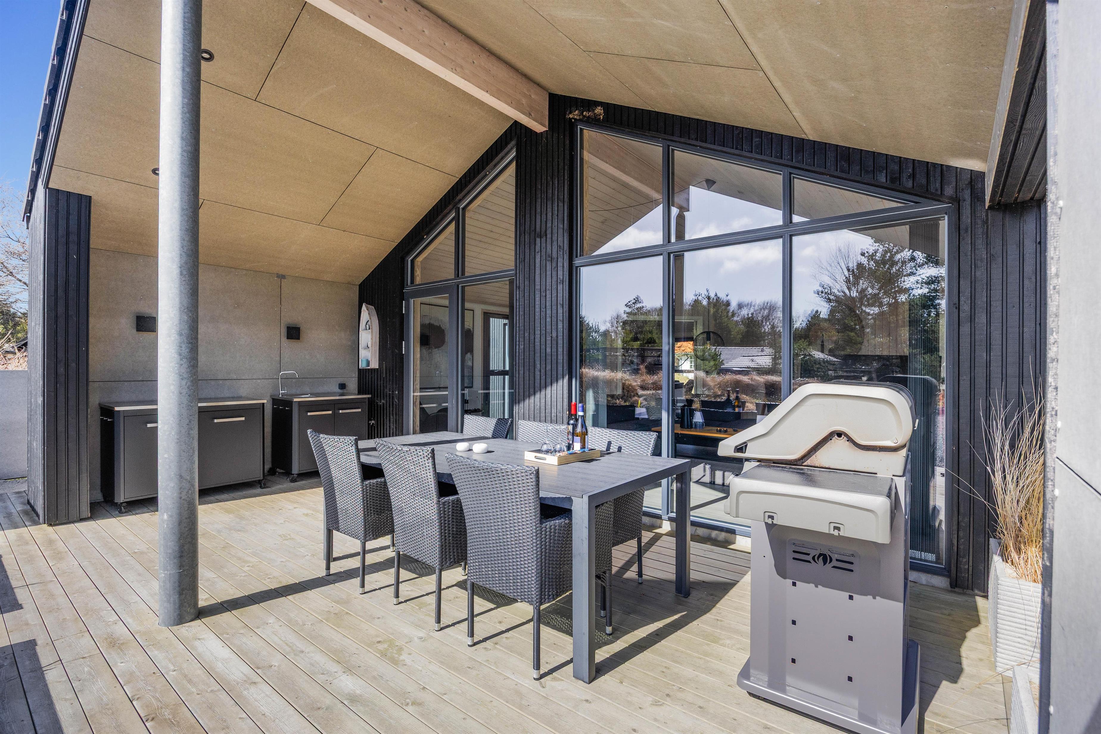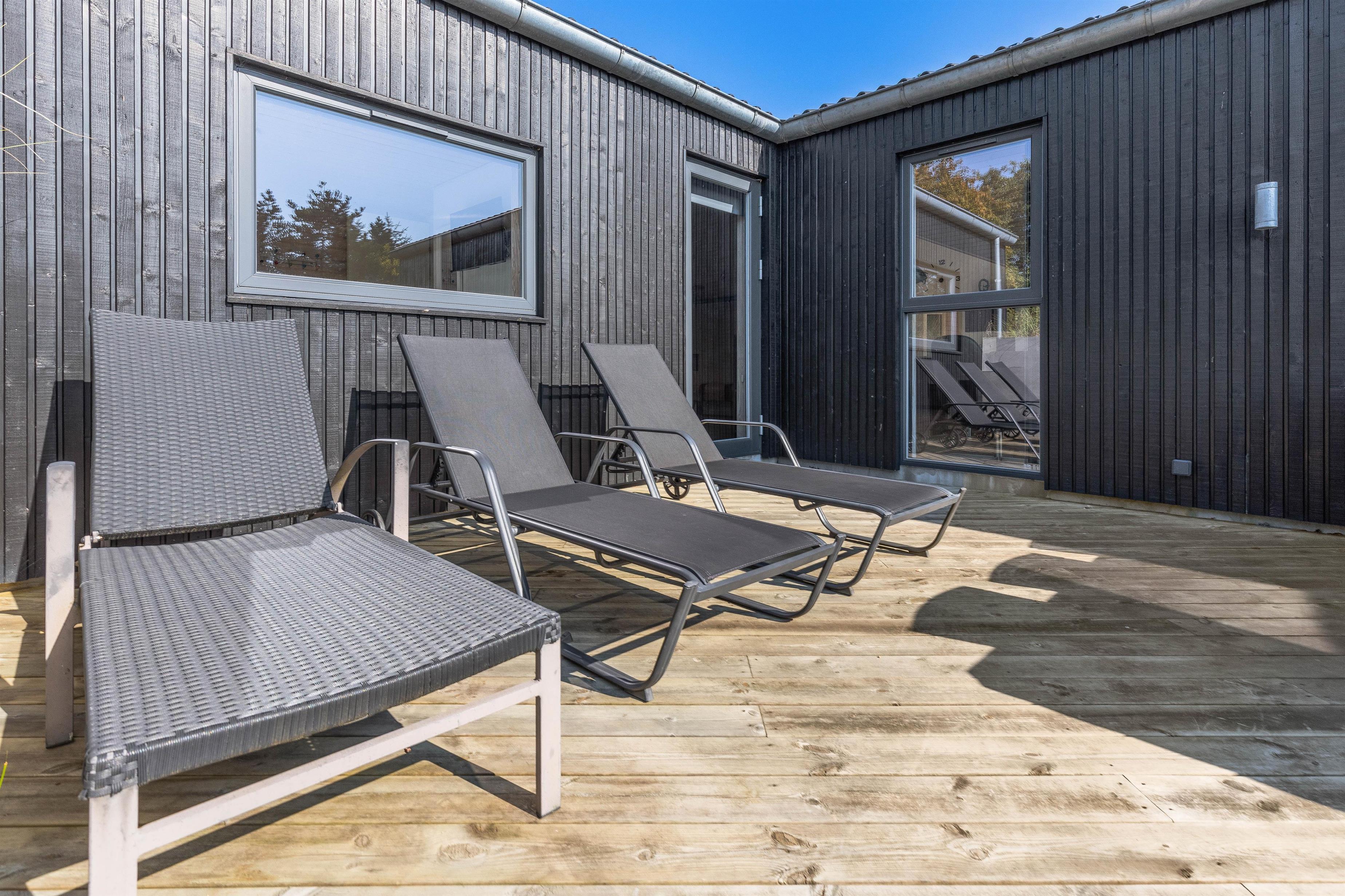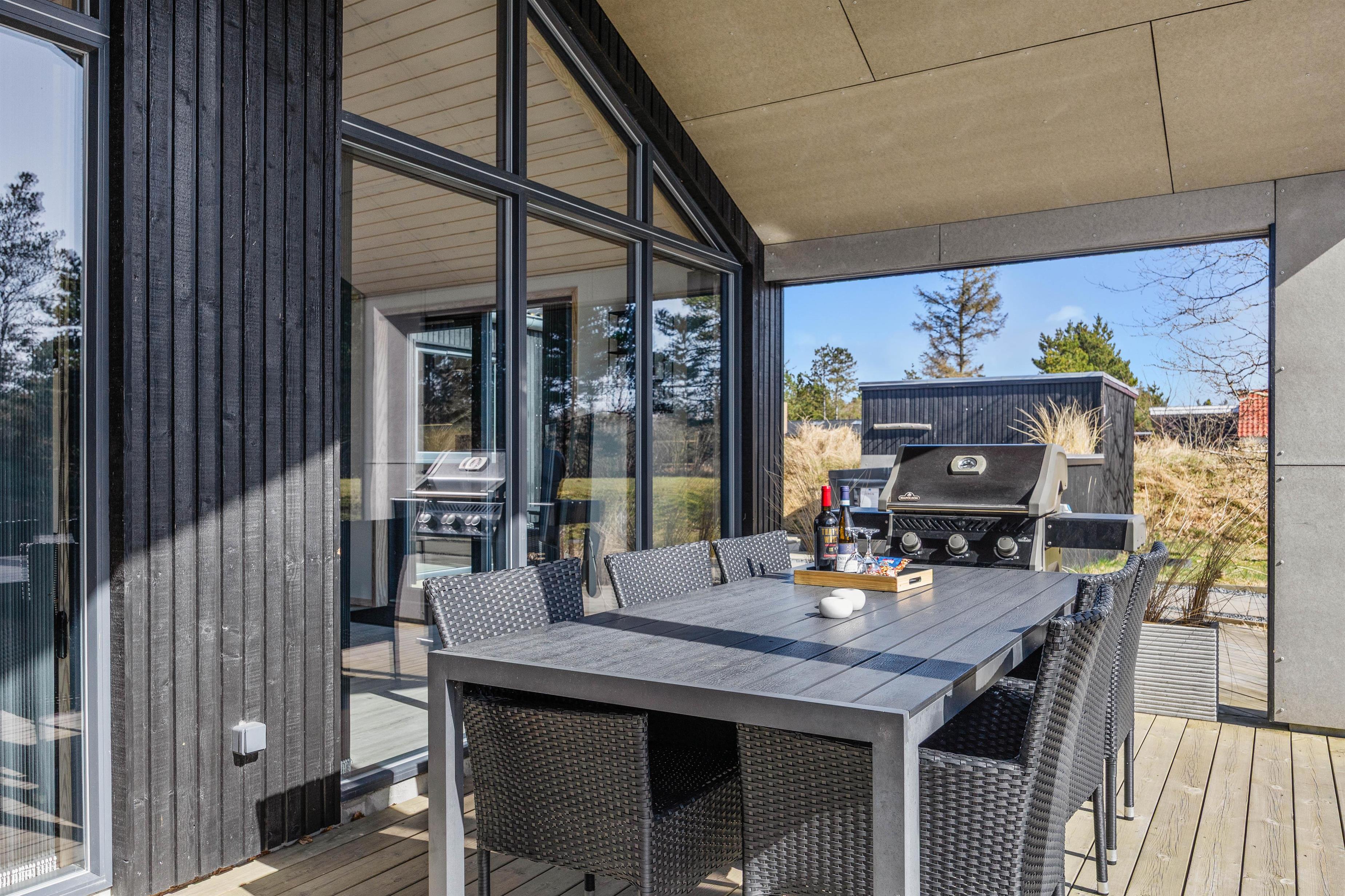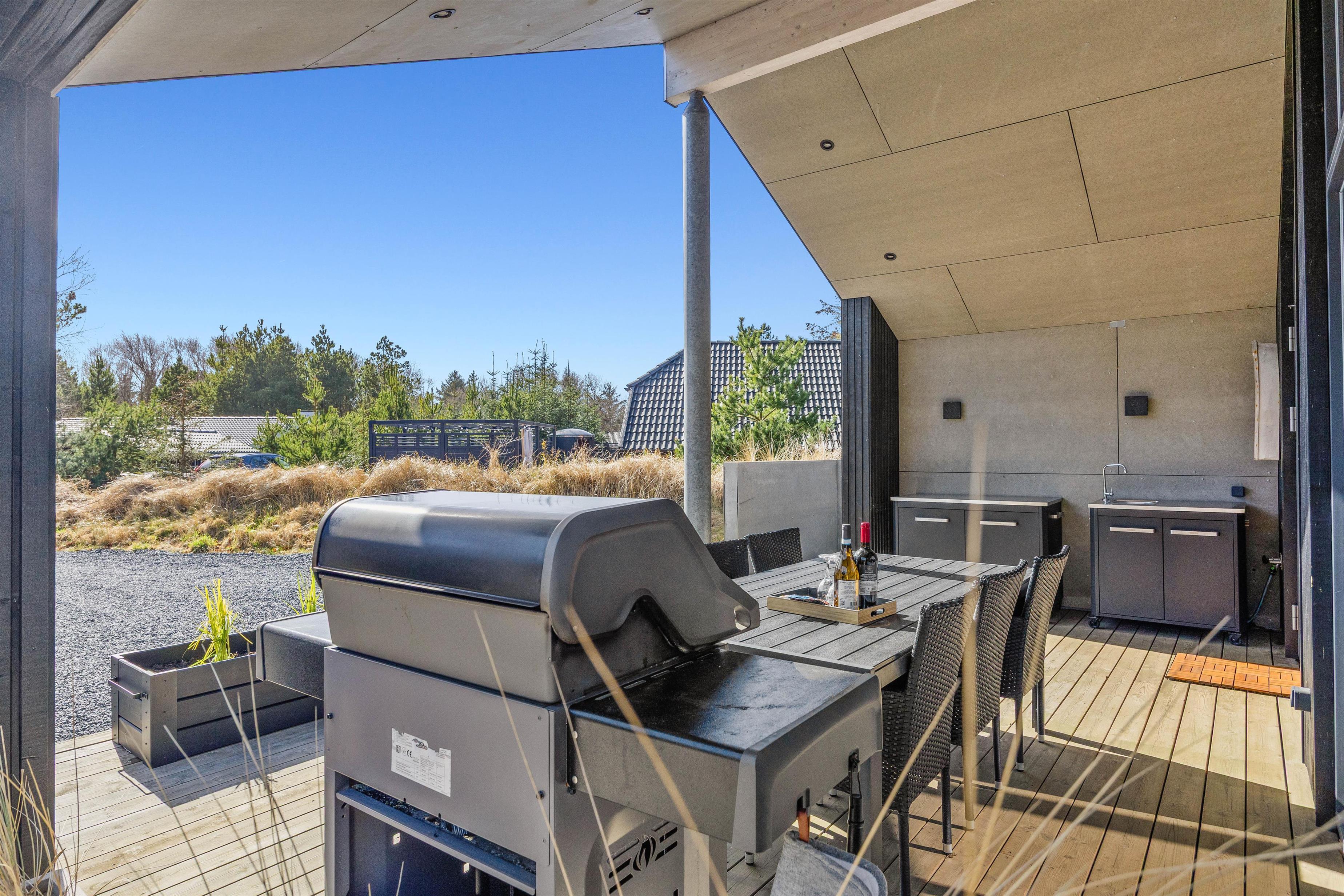 Luksussommerhuset har 3 gode terrasser med både en åben, afskærmet og overdækket del. Der er sørget for gode havemøbler, liggestole og en gasgrill, så I kan nyde de dejlige feriedage i den friske luft fuldt ud. Der er også en petanquebane på grunden. Den installerede udebruser kan benyttes i perioden 1. april til 31. oktober.