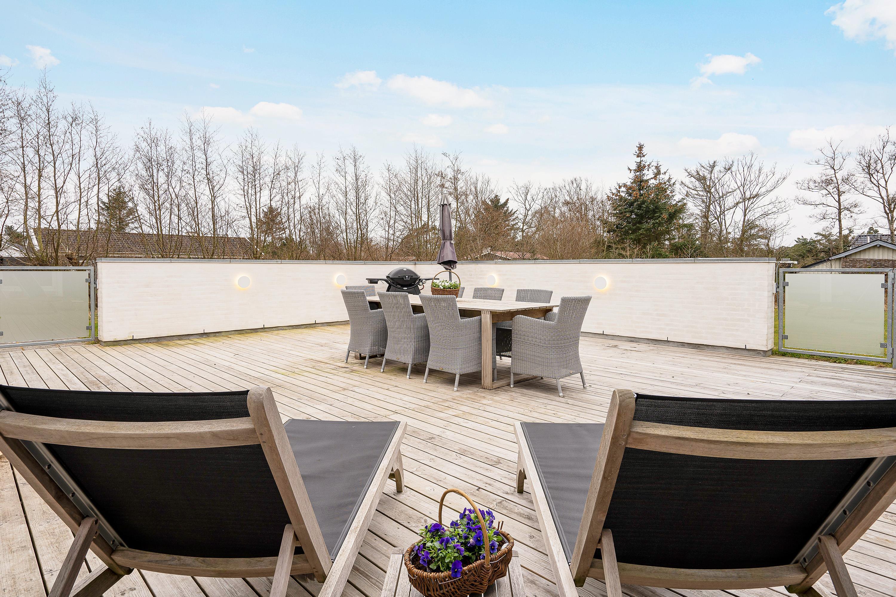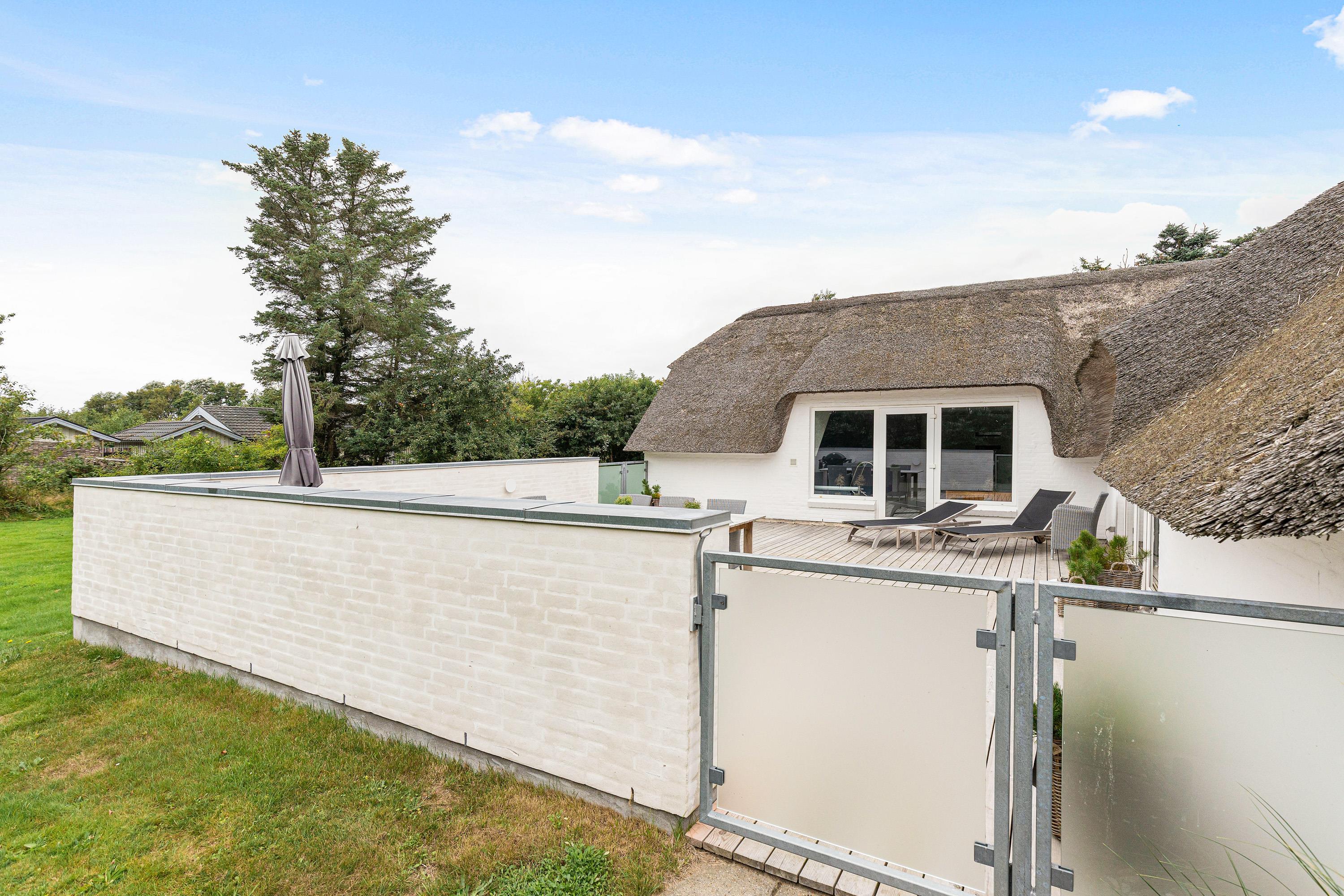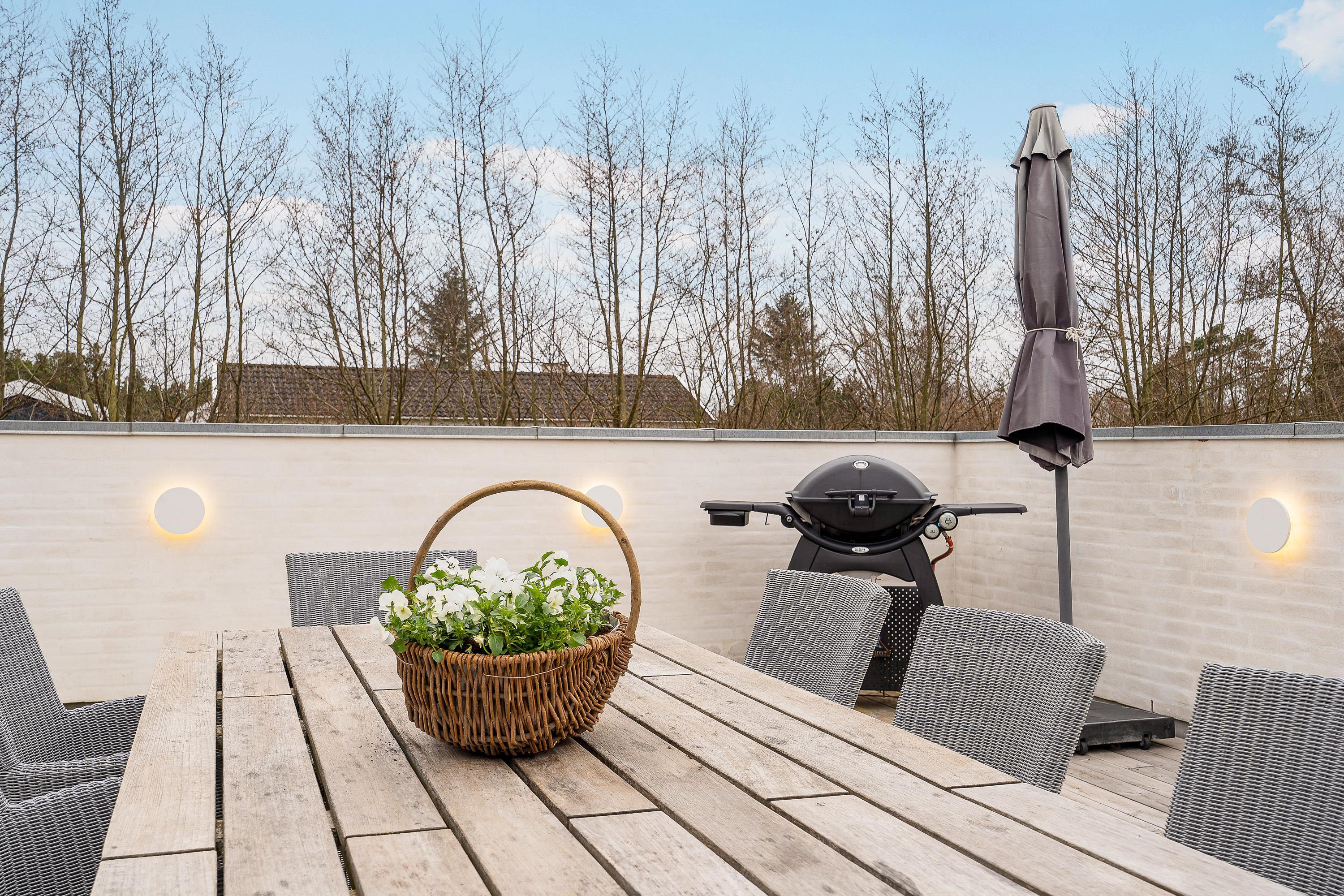 Fra poolafdelingen og opholdsrummet er der udgang til den store sydvestvendte terrasse, der er afskærmet af en halvmur – det helt optimale spot til en hyggelig grillaften i det gode vejr. Sommerhuset er udstyret med en praktisk gasgrill, så optændingen hurtigt er klaret.