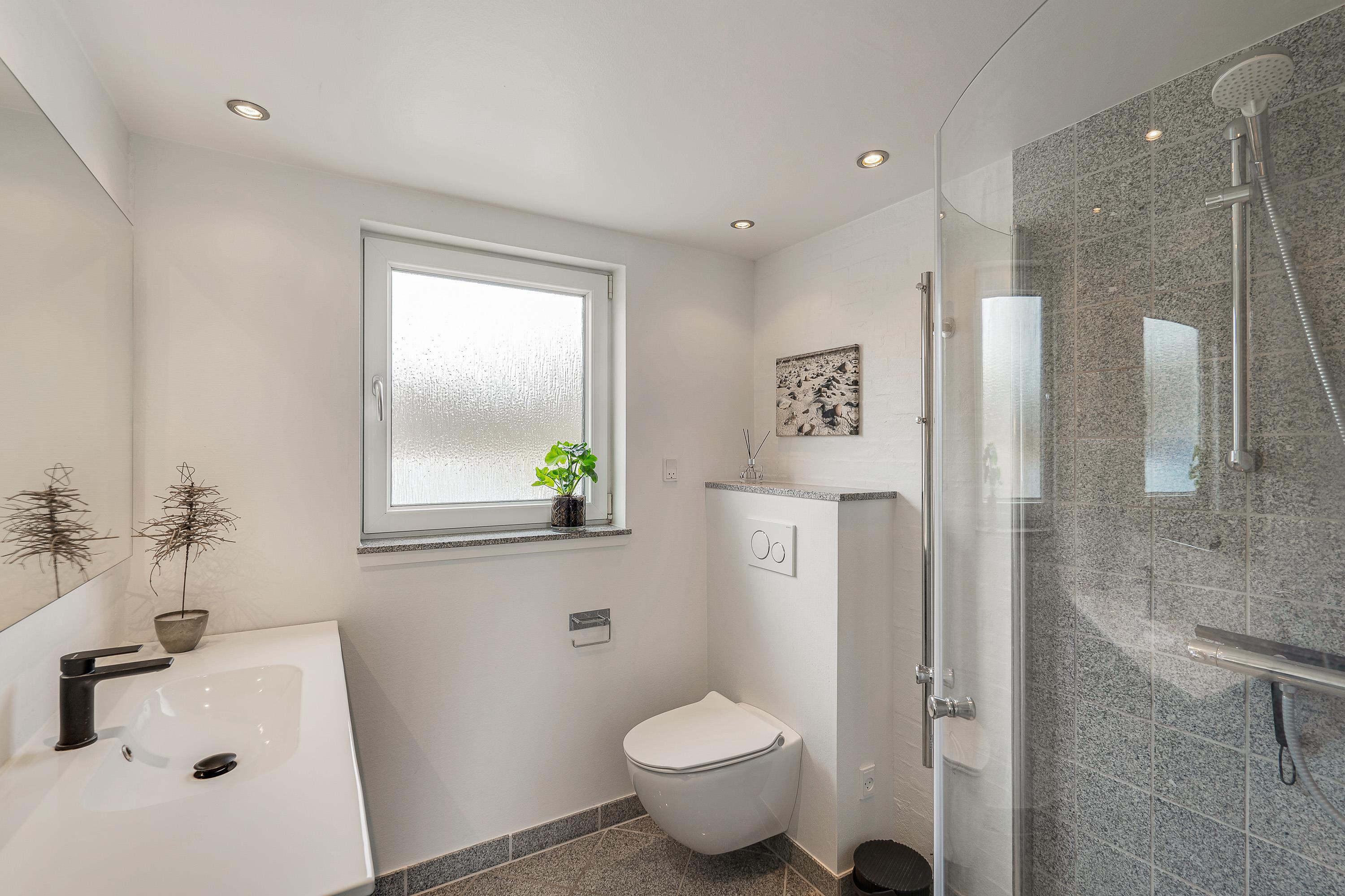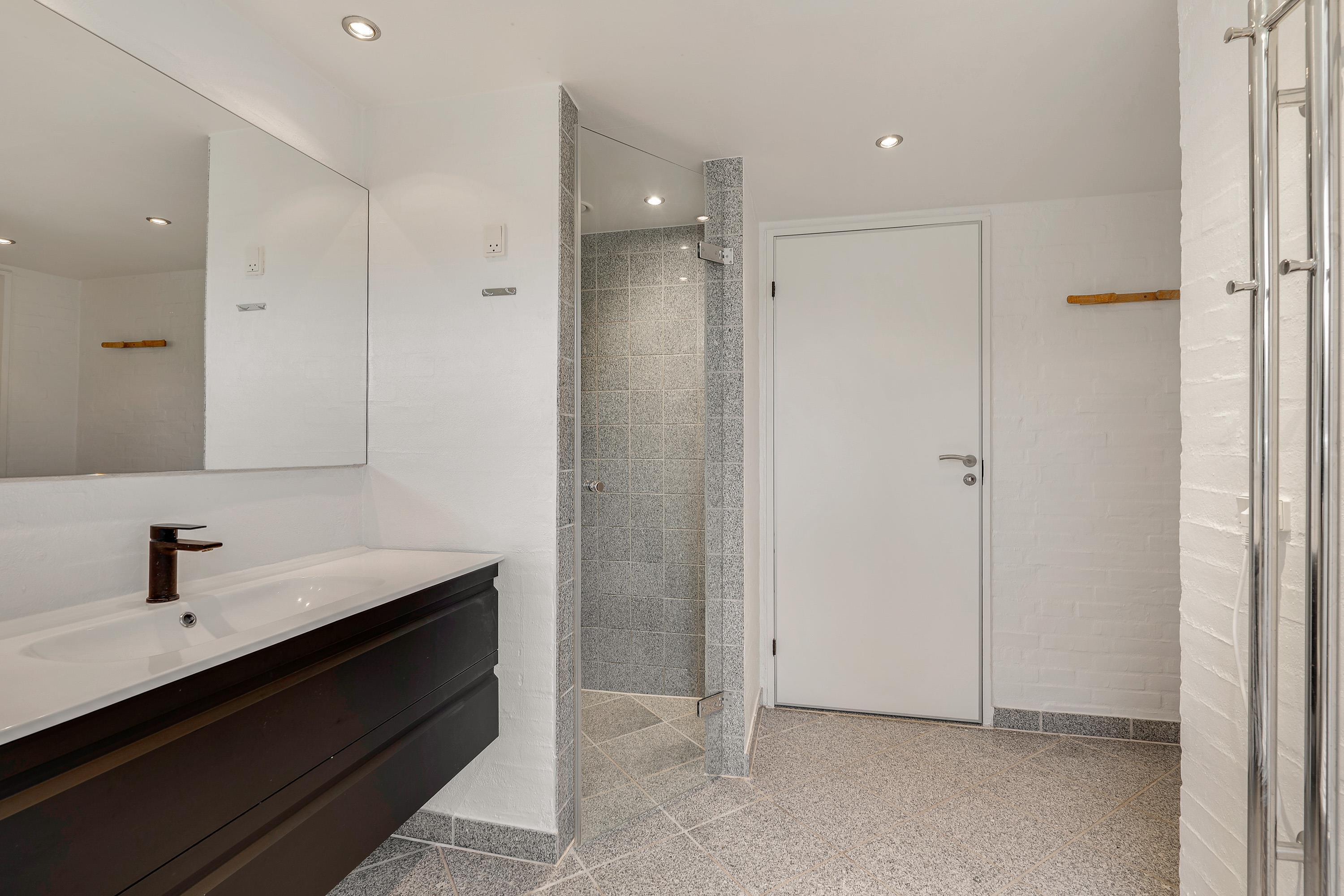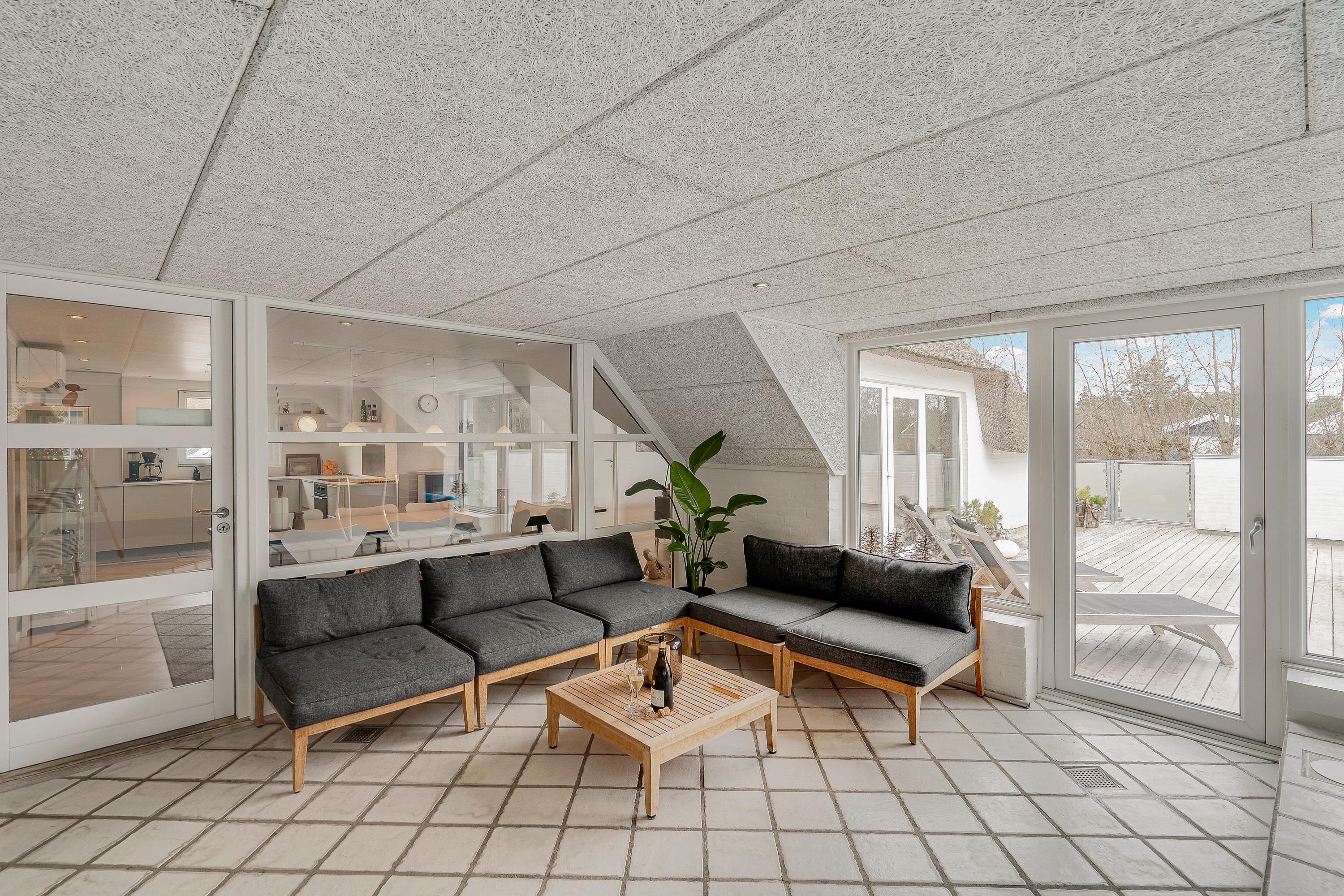 Fra poolafdelingen og opholdsrummet er der udgang til den store sydvestvendte terrasse, der er afskærmet af en halvmur – det helt optimale spot til en hyggelig grillaften i det gode vejr. Sommerhuset er udstyret med en praktisk gasgrill, så optændingen hurtigt er klaret.