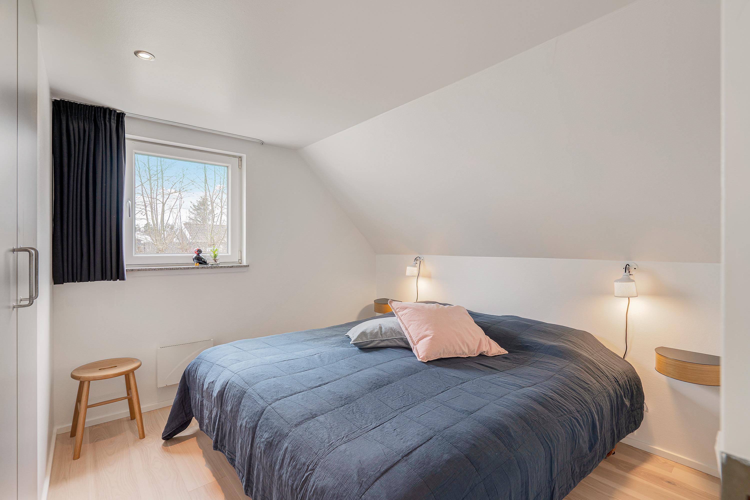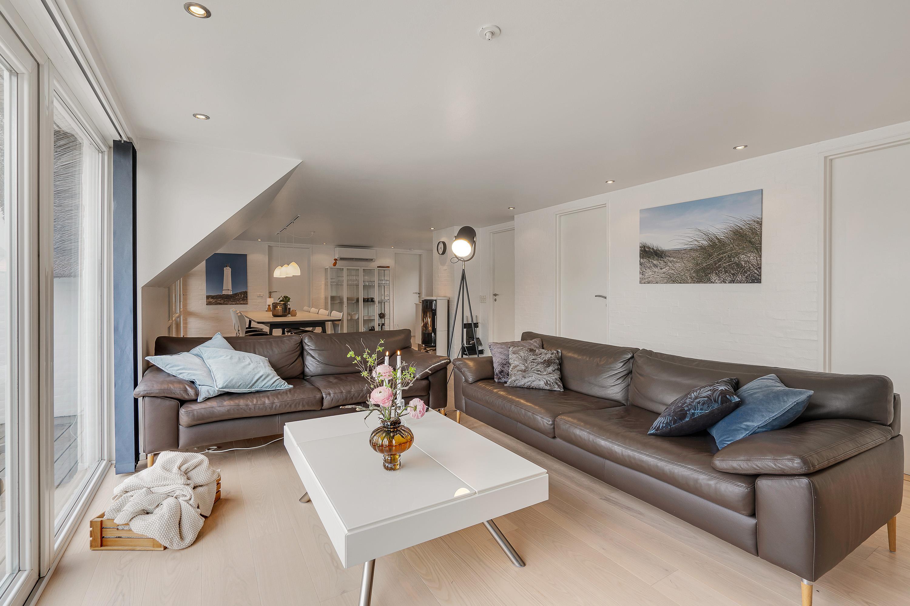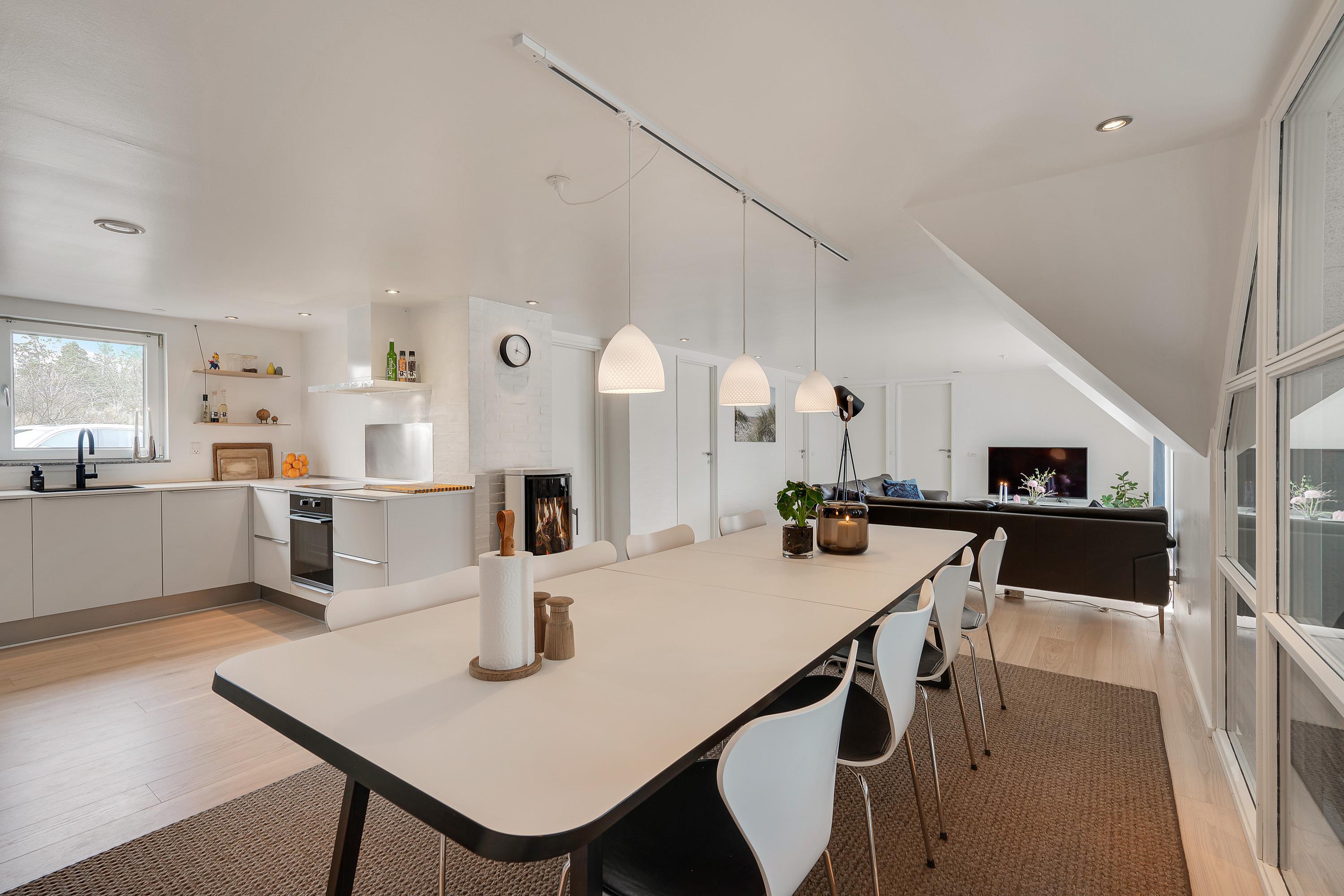 Det rummelige opholdsrum forener stue, spiseafdeling og køkken i ét stort fællesrum, hvor I kan samle familien til masser af hyggelige feriestunder. Både brændeovnen og den energibesparende varmepumpe giver en til hver tid har en behagelig rumtemperatur.
