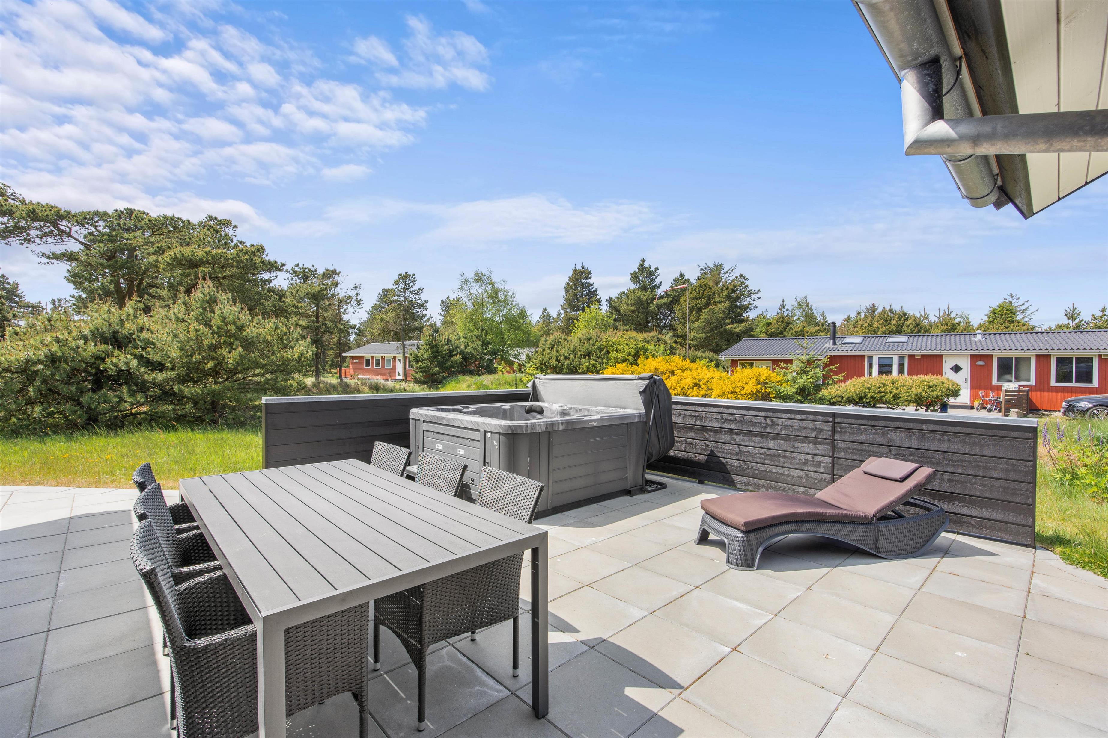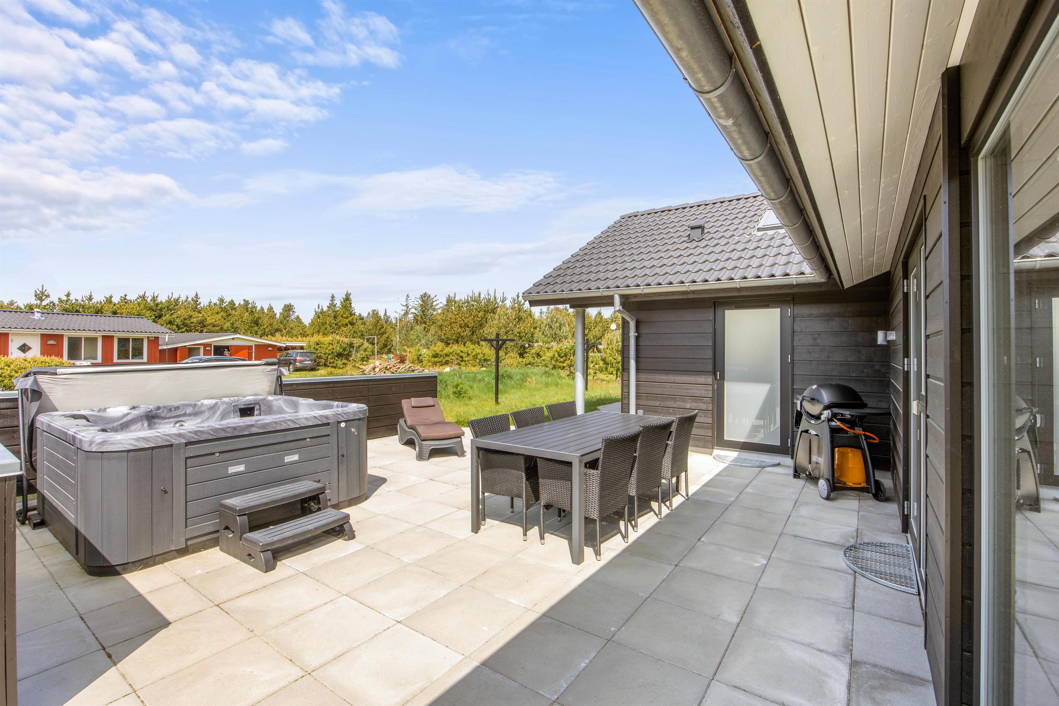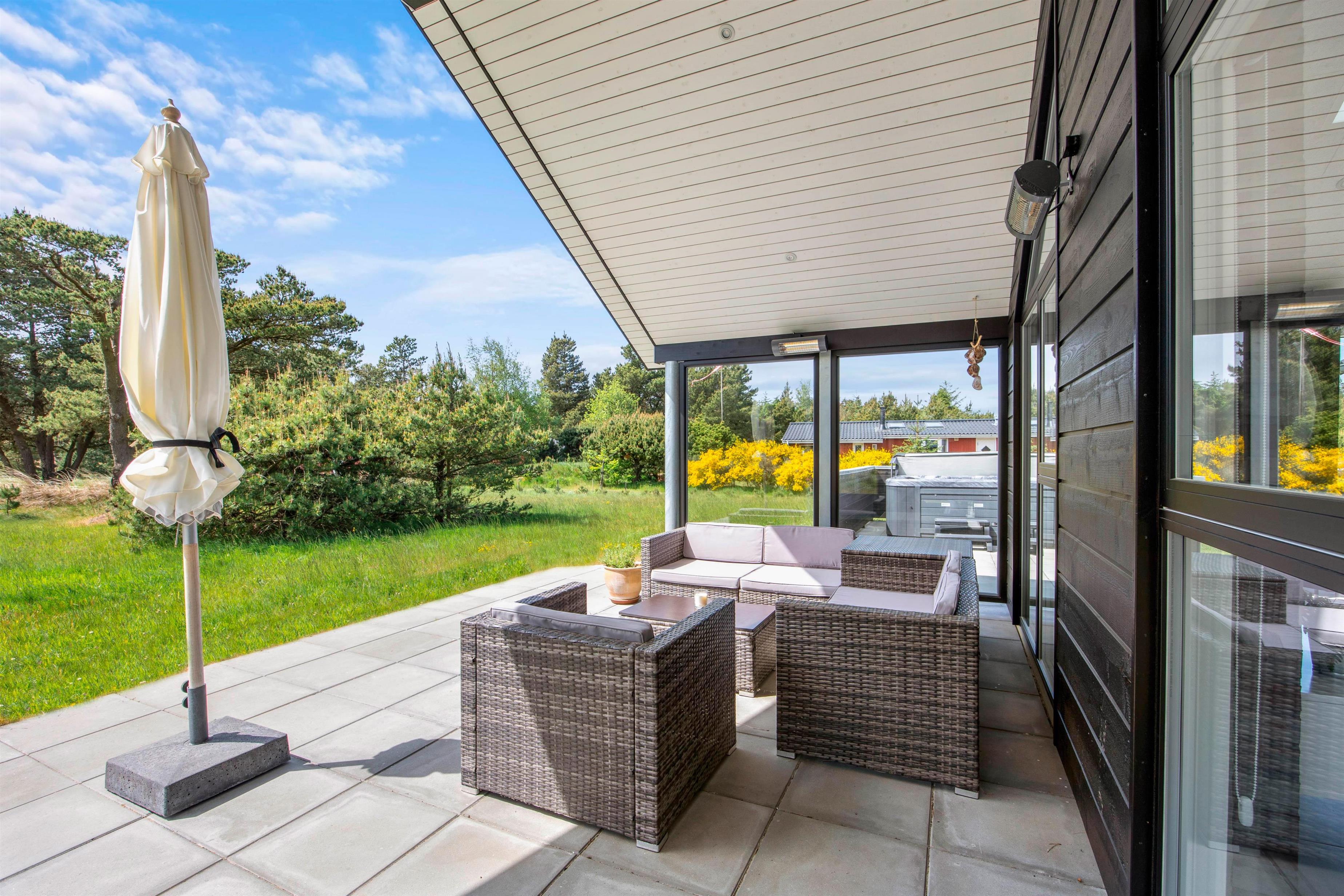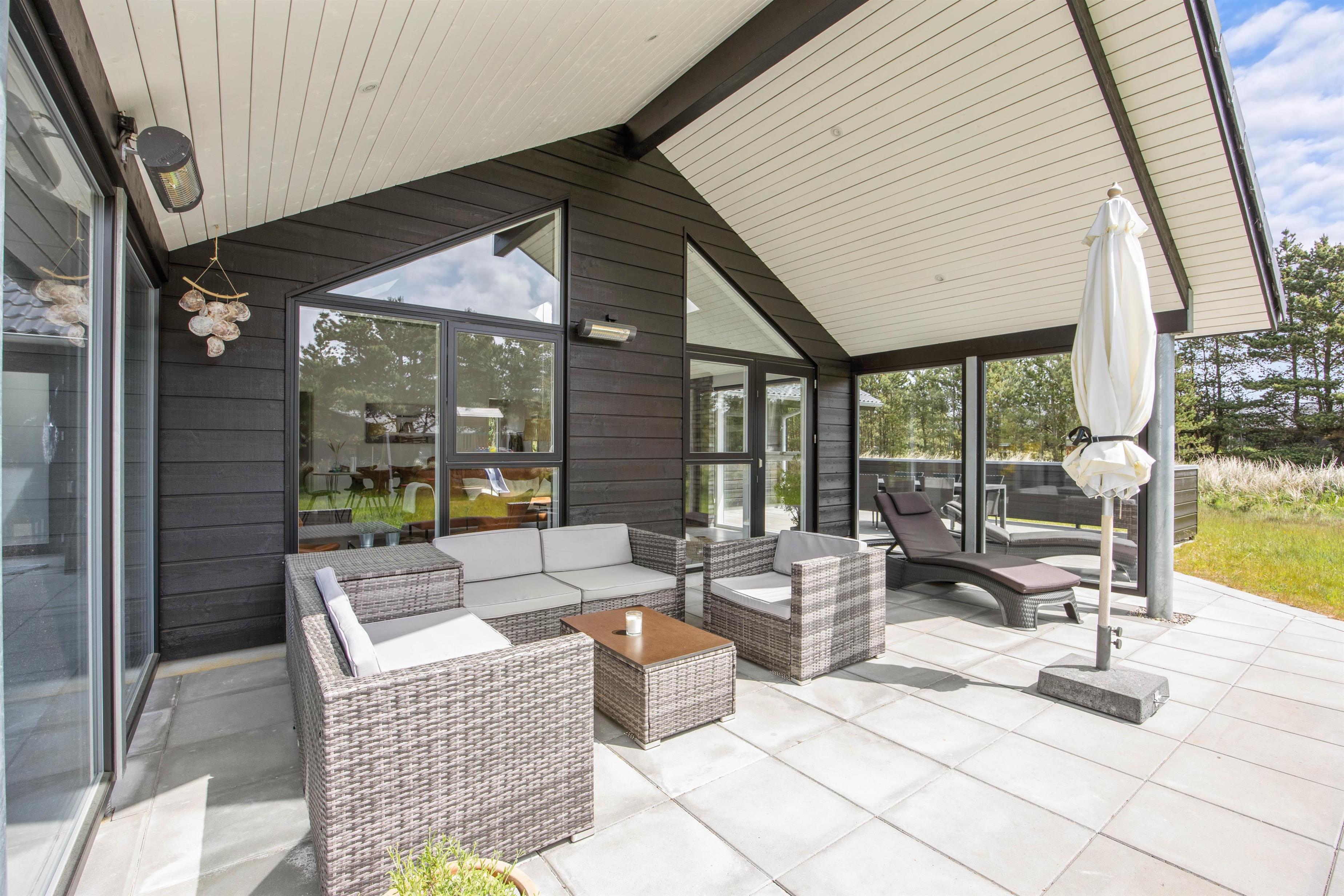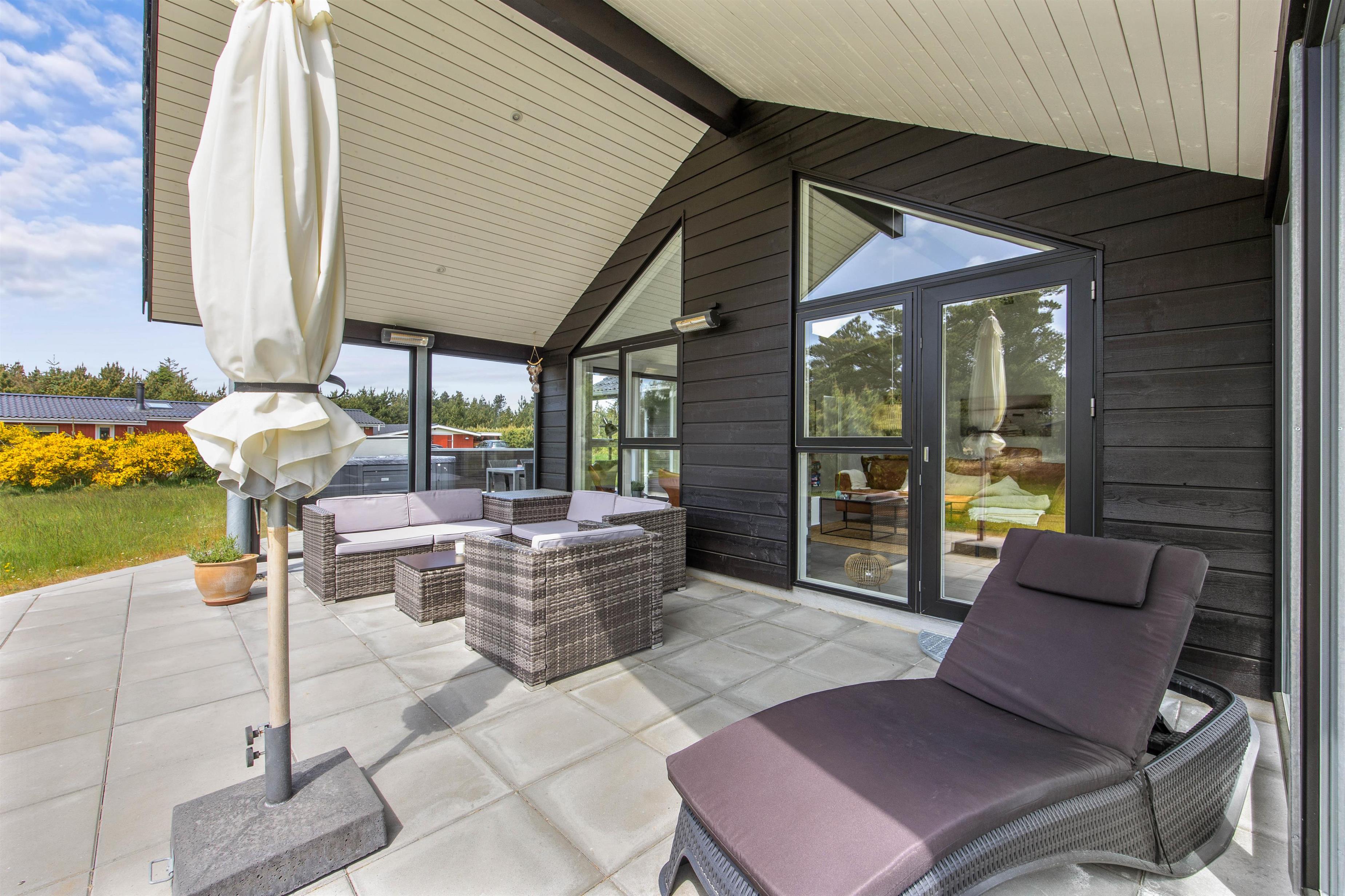 Omkring sommerhuset løber en 27 kvadratmeter stor terrasse, der både er afskærmet og delvist overdækket. Både når solen skinner, og vinden suser, kan I tilbringe jeres ferie på terrassen, hvor liggestole og havemøbler står klar til, at I kan slænge jer i dem.