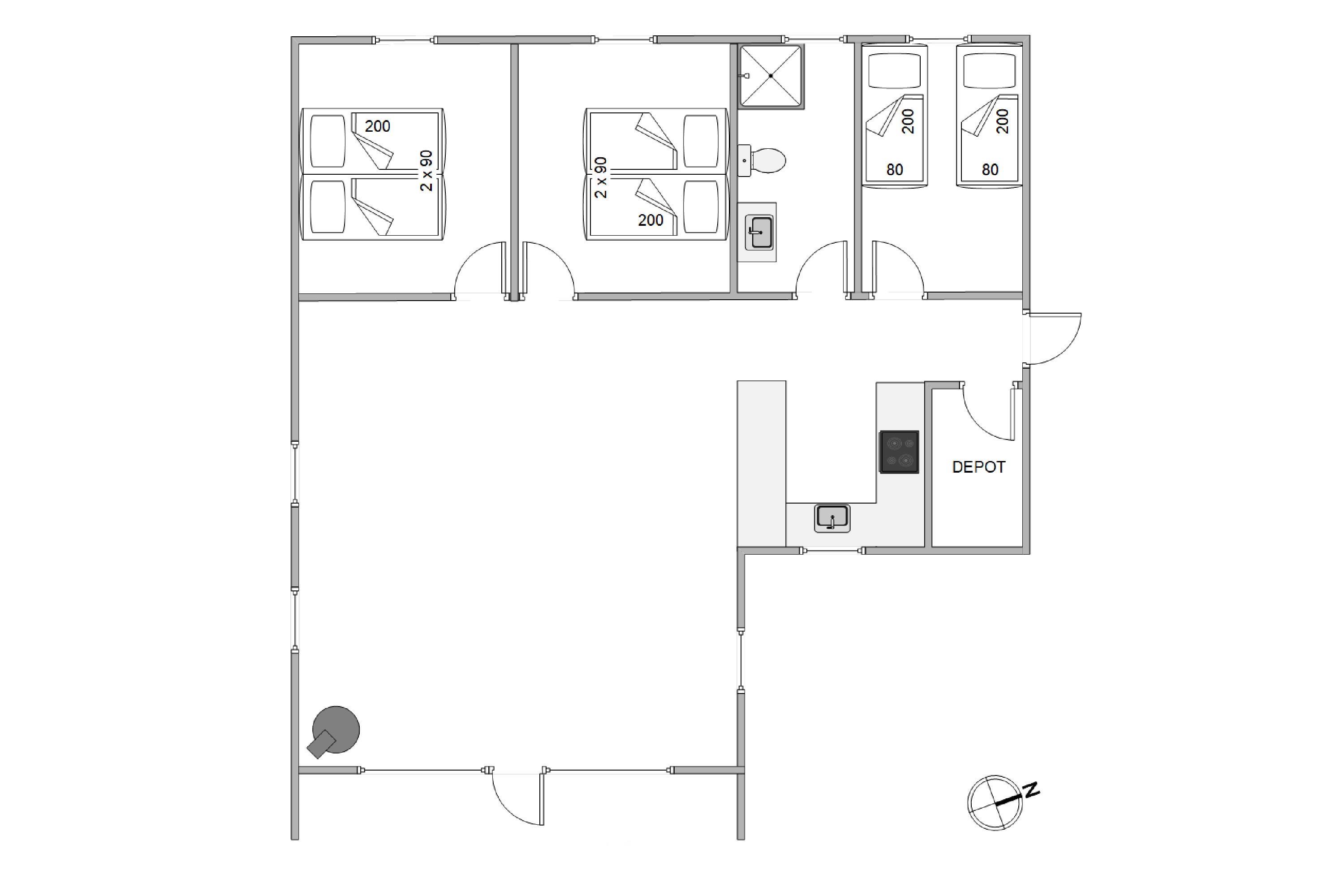 Sommerhusets hjerte er opholdsrummet. Her ligger køkkenet i åben forbindelse med stue og spiseafdeling, og der er på den måde skabt et samlet fællesrum, hvor I rigtigt kan sætte samværet i centrum og nyde feriedagene med hinanden. I stuehjørnet står brændeovnen, som altid er en ægte hyggespreder. Med en hurtig internetforbindelse og en Chromecast i stuen har I desuden alt, hvad I skal bruge for at arrangere en hyggelig filmaften i stuen.