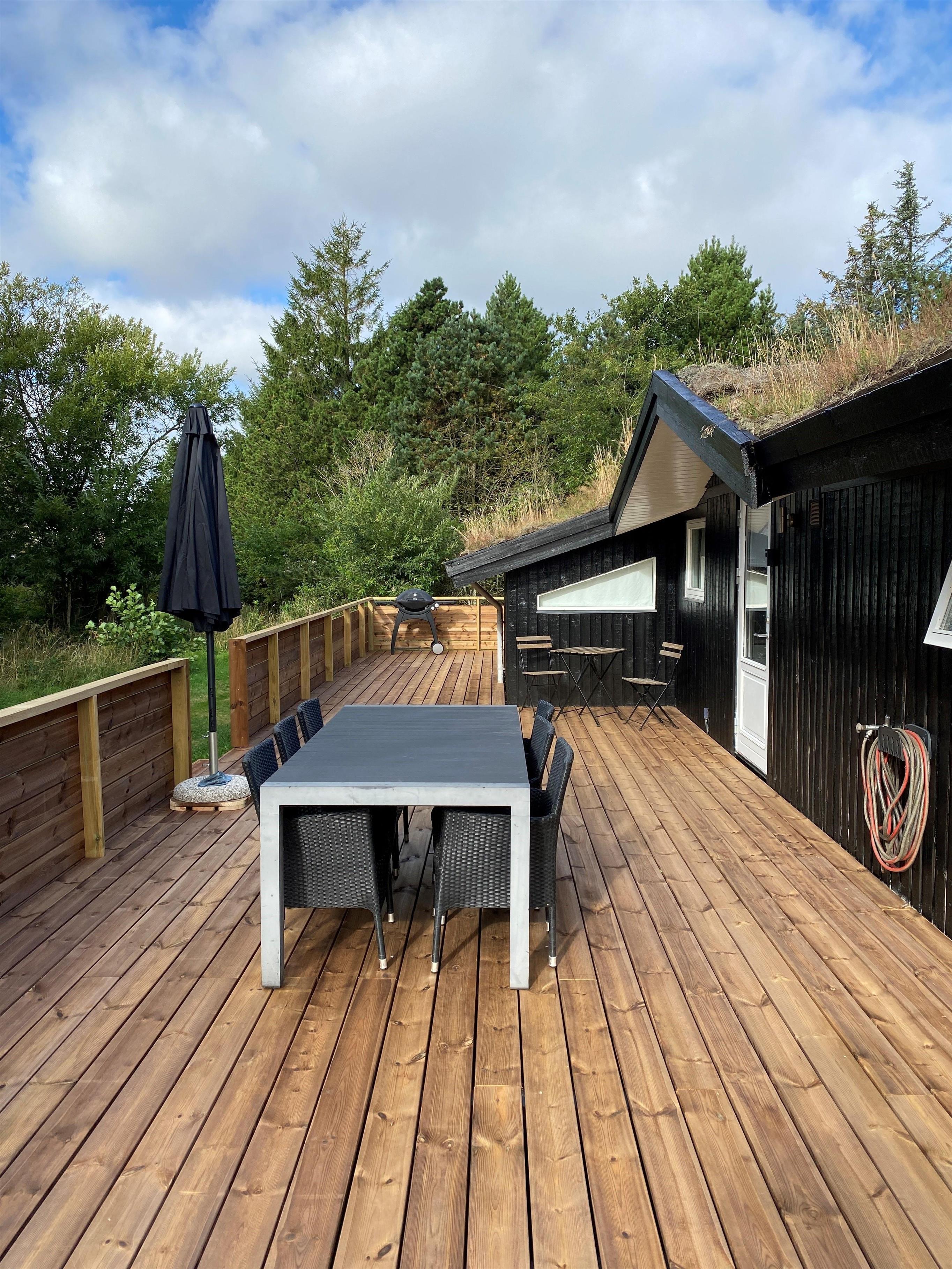 Godt træhus med græstag beliggende lige ved siden af det populære mini-golf anlæg. Huset har faste tæpper i alle opholdsrum. Panoramavindue i stuen med udsigt til smuk natur hvor hjortevildtet kigger forbi. Ligger på naturgrund med græs og stor delvist overdækket træterrasse med gode muligheder for sol, læ og skygge. I den kolde tid kan man nyde en tur i vildmarksbadet og koble af med et glas bobler mens man kigger på stjerner. 1 dobbeltseng. 2 enkeltsenge. Alkove m/ 1 dobbeltseng. Byggeår 1987, træhus, Overdækket terrasse, barnestol, barneseng. Mikroovn, opvaskemaskine. Vaskemaskine, tørretumbler, sauna. DVD-afspiller, farve-TV og parabol, cromecast, stereoanlæg, brændeovn, CD-afspiller. Naturgrund med træer.