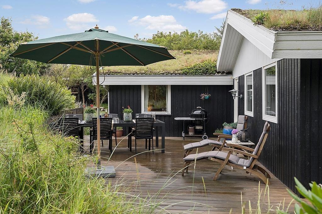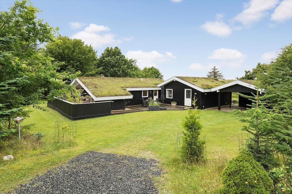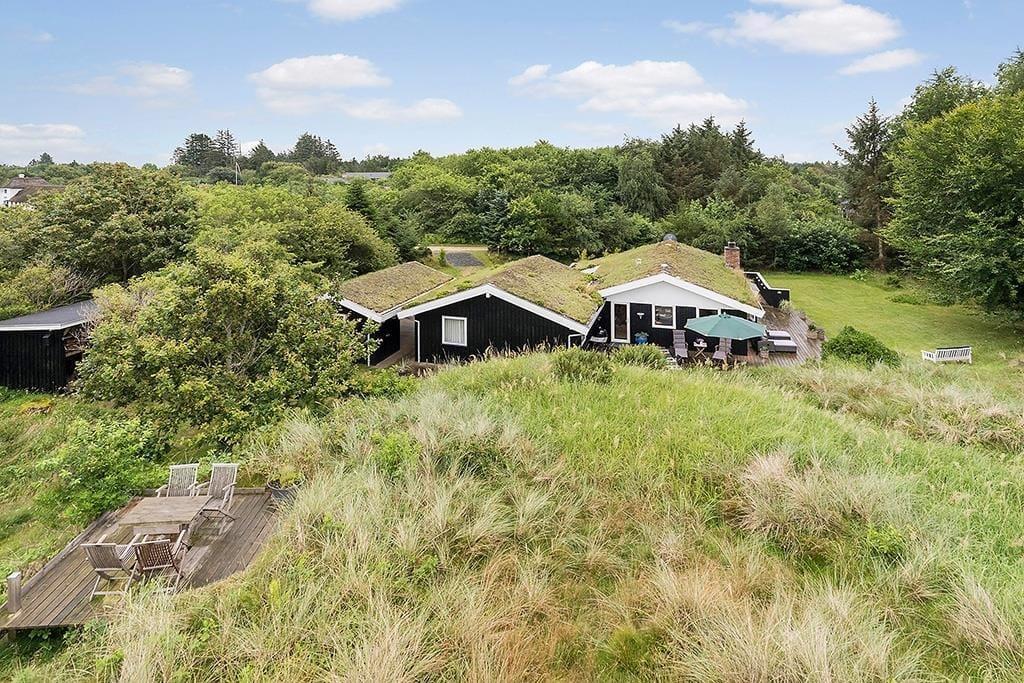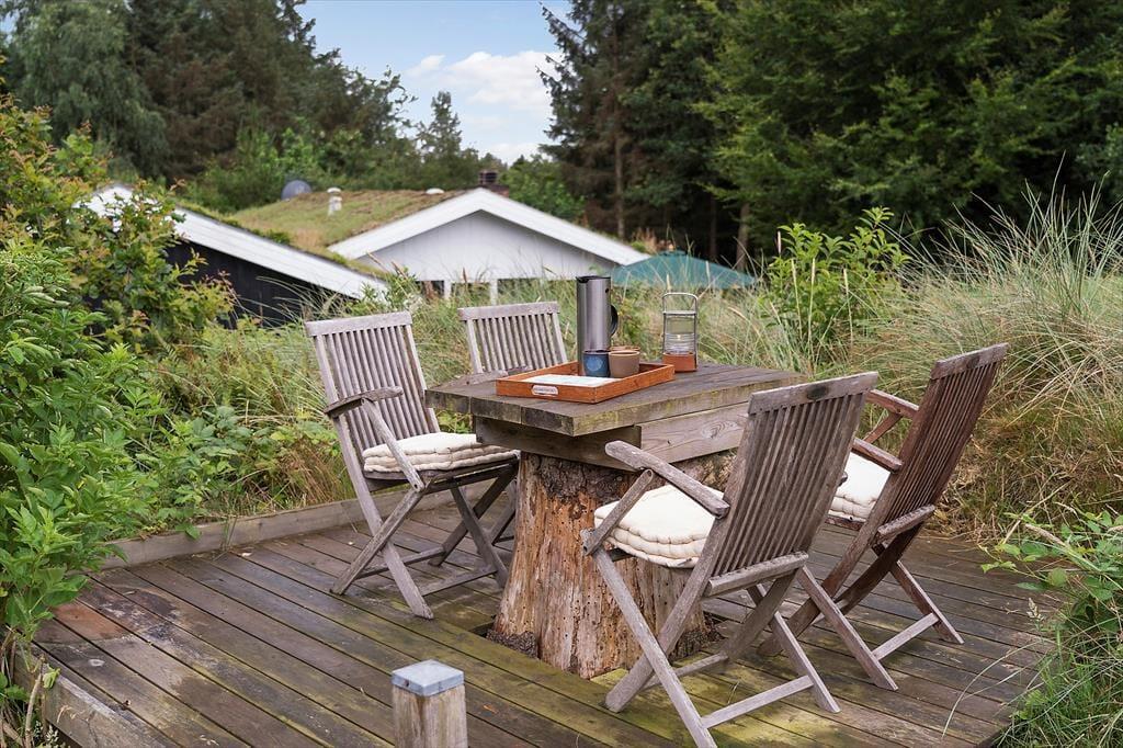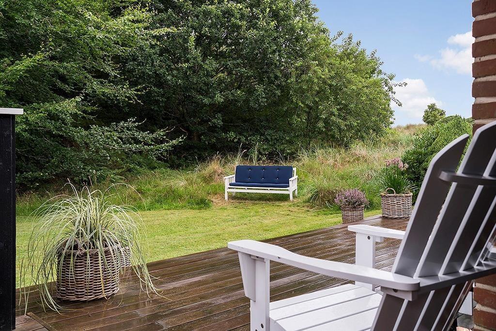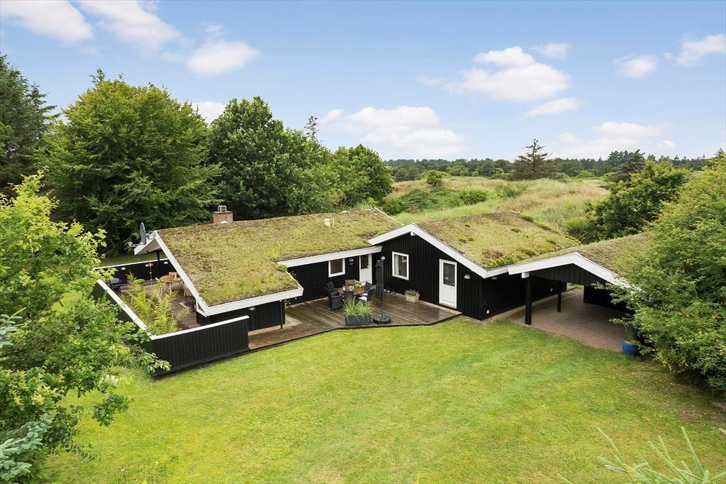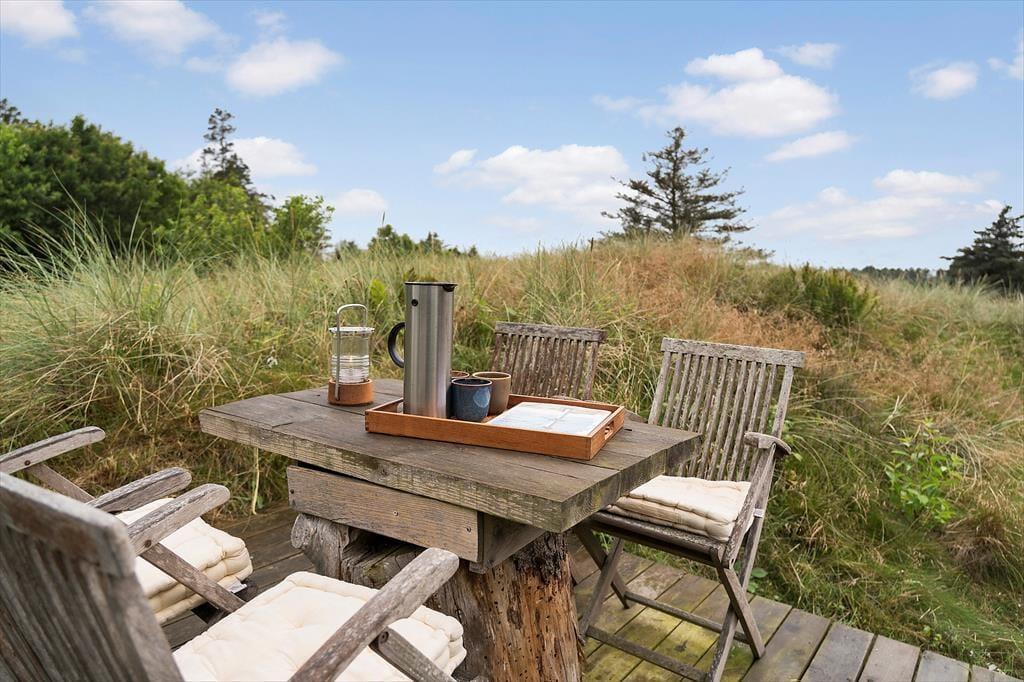 Sommerhuset ligger på en stor naturgrund med både træer og lav bevoksning. Der er en skøn udsigt over de grønne arealer og huset ligger helt ugeneret fra de omkringliggende huse. Sommerhuset er omgivet af terrasser med gode havemøbler og den overdækkede del har udgang direkte fra stuen. Selv på en vindfyldt dag er man sikker på en finde en god læ krog, hvor man kan læse et par kapitler i yndlingsbogen. En lille solterrasse på klittoppen giver jer en sjælden mulighed for at nyde aftenkaffen eller solen med 360 graders udsigt over det smukke klitlandskab.