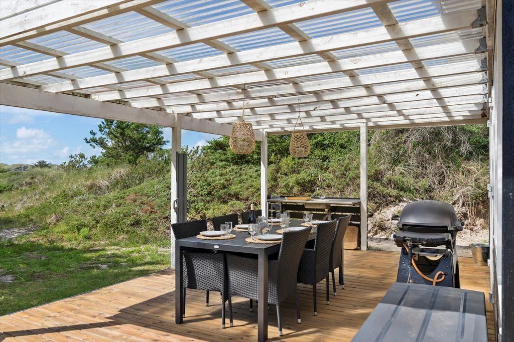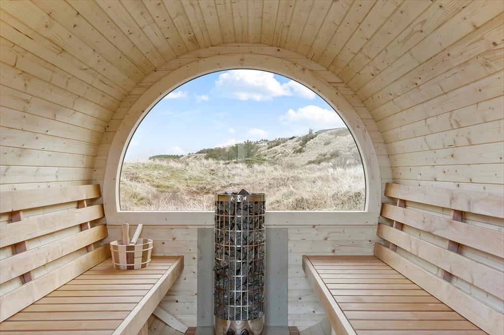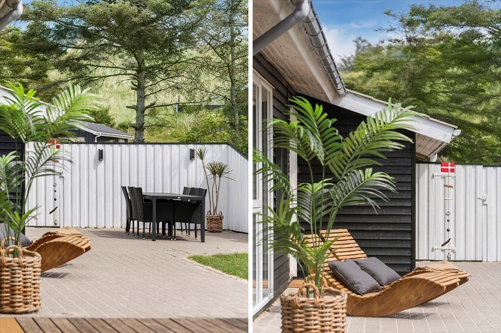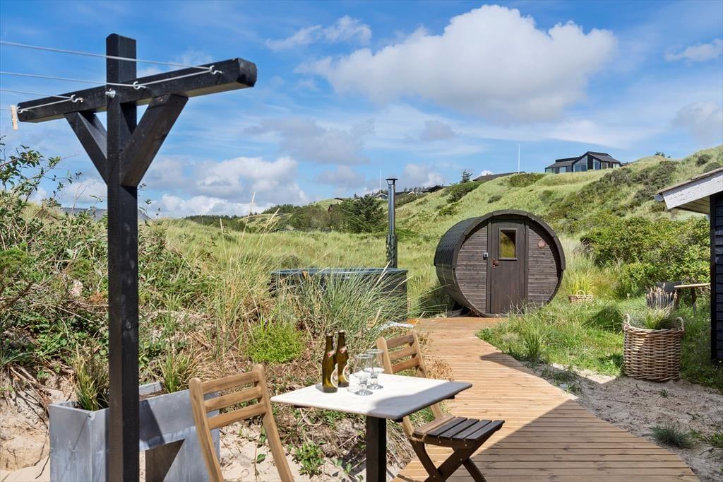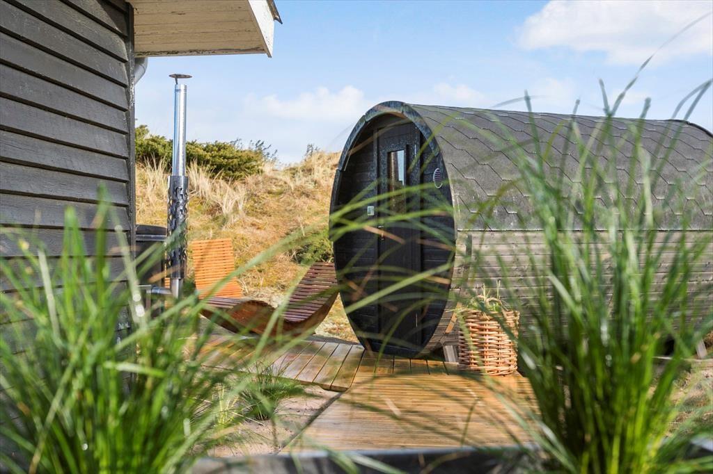 Den store terrasse, der breder sig omkring huset, giver mulighed for at finde et solrigt eller skyggefuldt hjørne alt efter humør. Med både sauna, udebruser og koldtvandskar har du de bedste faciliteter til at forkæle dig selv udendørs. Efter en tur i saunaen kan du køle af i koldtvandskarret og dernæst lade dig forfriske med en bruser under åben himmel. Terrasseområdet er perfekt til at samles om grillen og nyde måltider sammen eller slappe af i en liggestol, mens du nyder solen og den friske luft. Med så mange muligheder for at tilbringe tid udenfor, bliver det nemt at få ferieoplevelsen, du har drømt om.