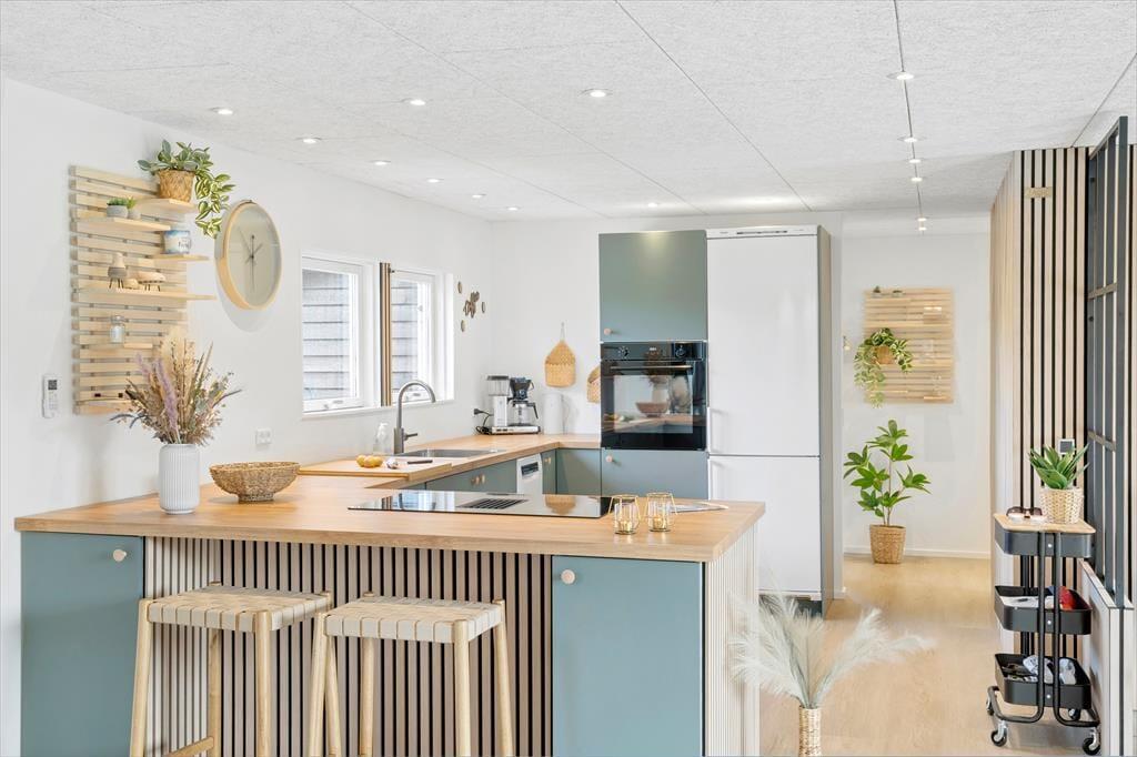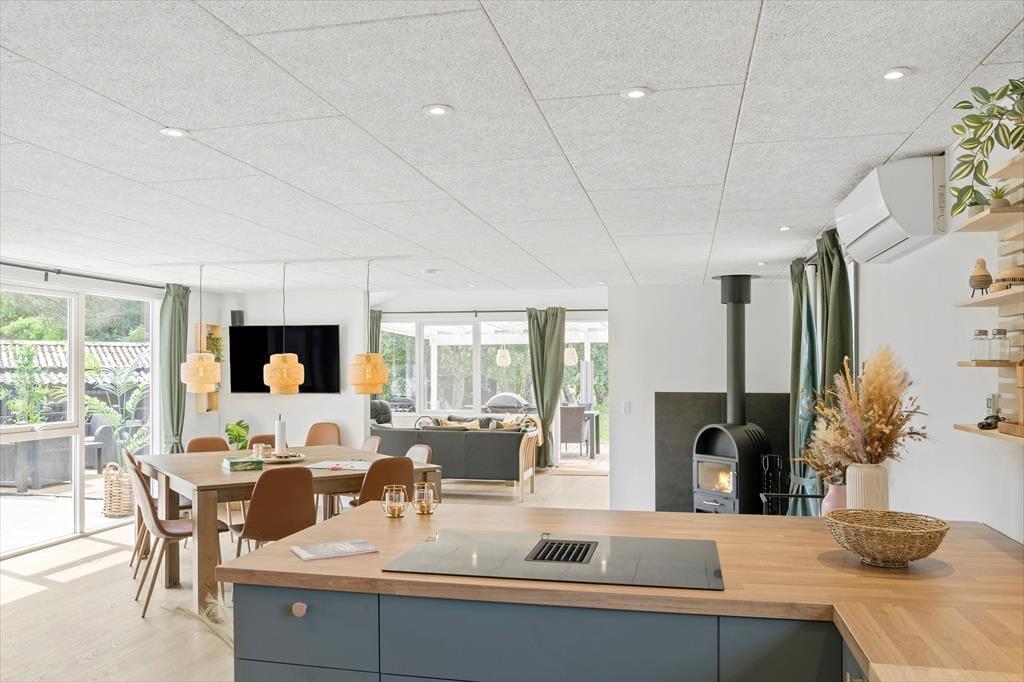 Som du træder ind i sommerhuset, bliver du mødt af et lyst og åbent køkken alrum, som giver plads til hygge og samvær. Det moderne køkken er perfekt til at sammensætte feriens måltider, og den åbne forbindelse til stuen sikrer, at alle kan være sammen på samme tid. Den hyggelige stue indbyder til afslapning med en god bog foran brændeovnen, eller måske en filmaften med familien, hvor I kan nyde den varme atmosfære. I sommerhuset er der også et nyligt renoveret badeværelse, hvor du kan forkæle dig selv med et lækkert bad efter en lang dag med udendørs aktiviteter.