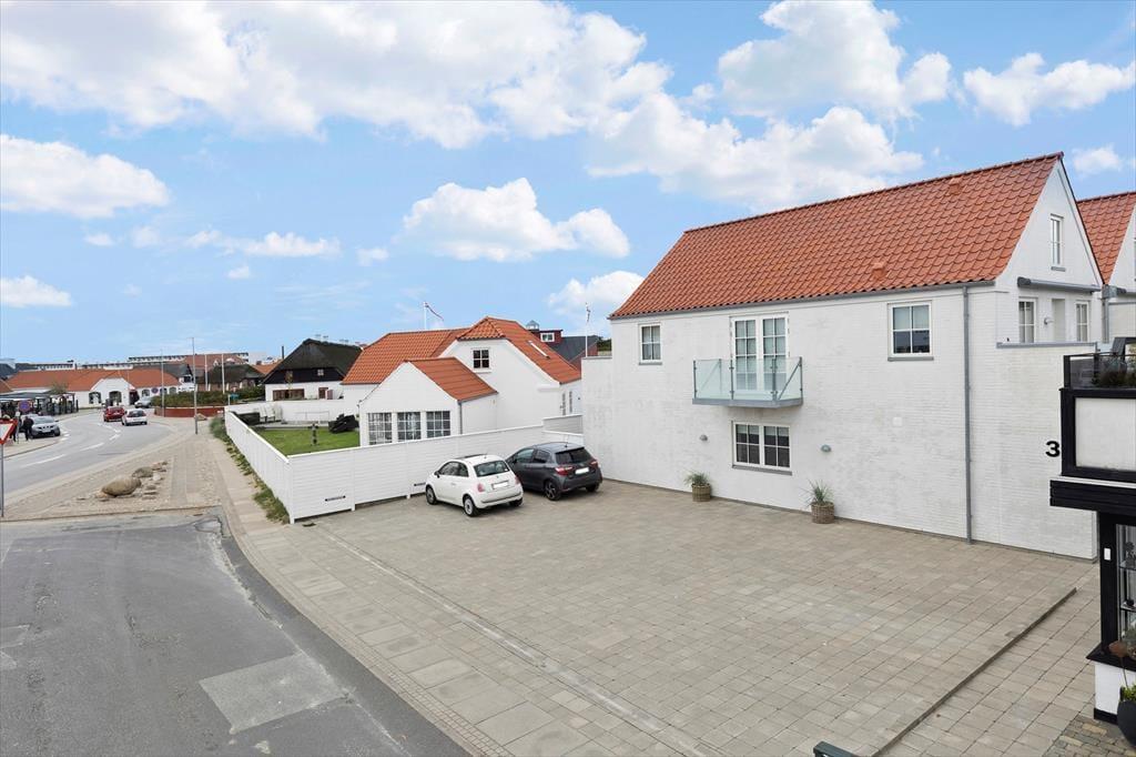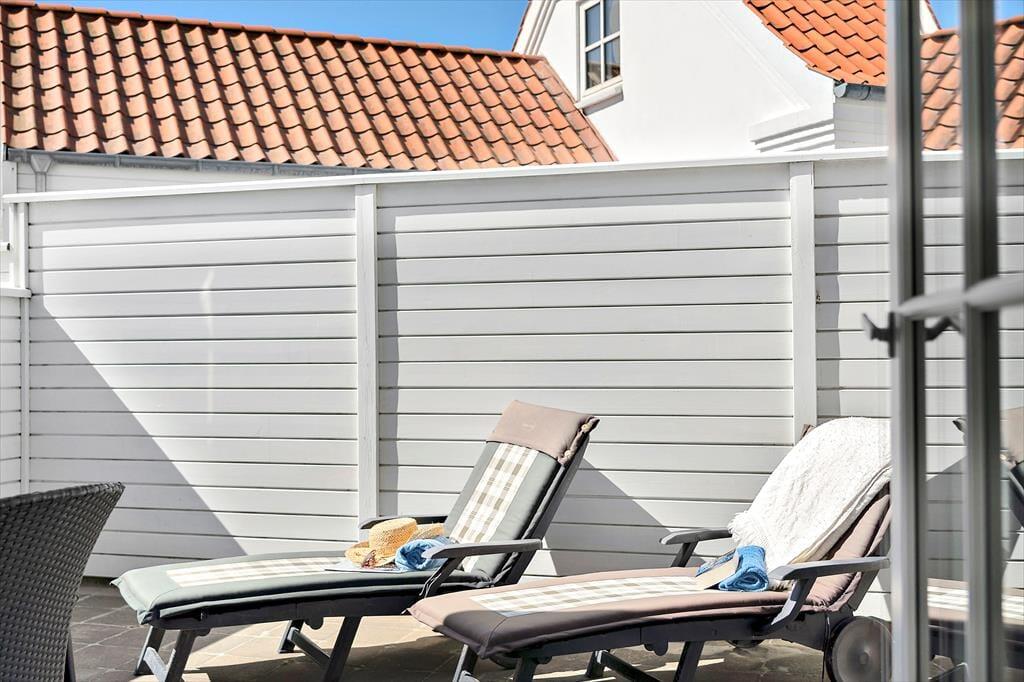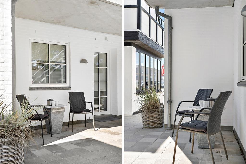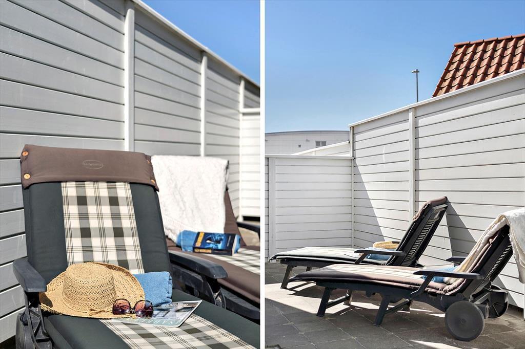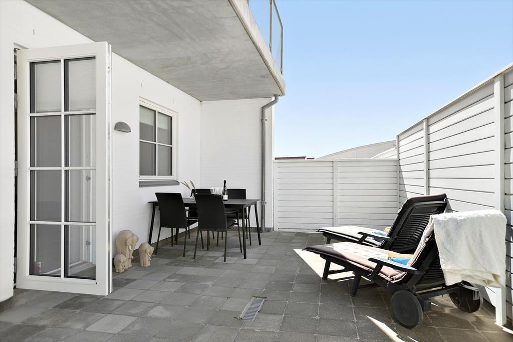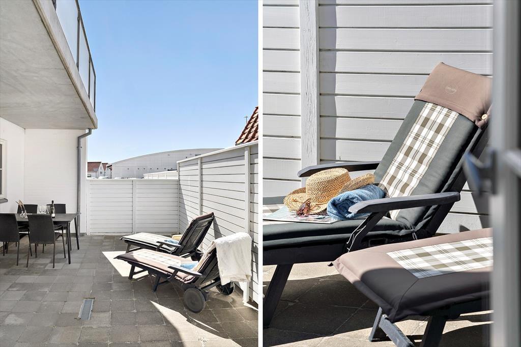 Fra opholdsrummet er der adgang til to terrasser, hvoraf den ene er delvist overdækket og vender mod en lukket gårdhave – en privat oase midt i byen. Her kan I nyde både morgen- og aftensol. Beliggenheden er ideel med kort afstand til både butikker, restauranter og den brede sandstrand ved Vesterhavet.