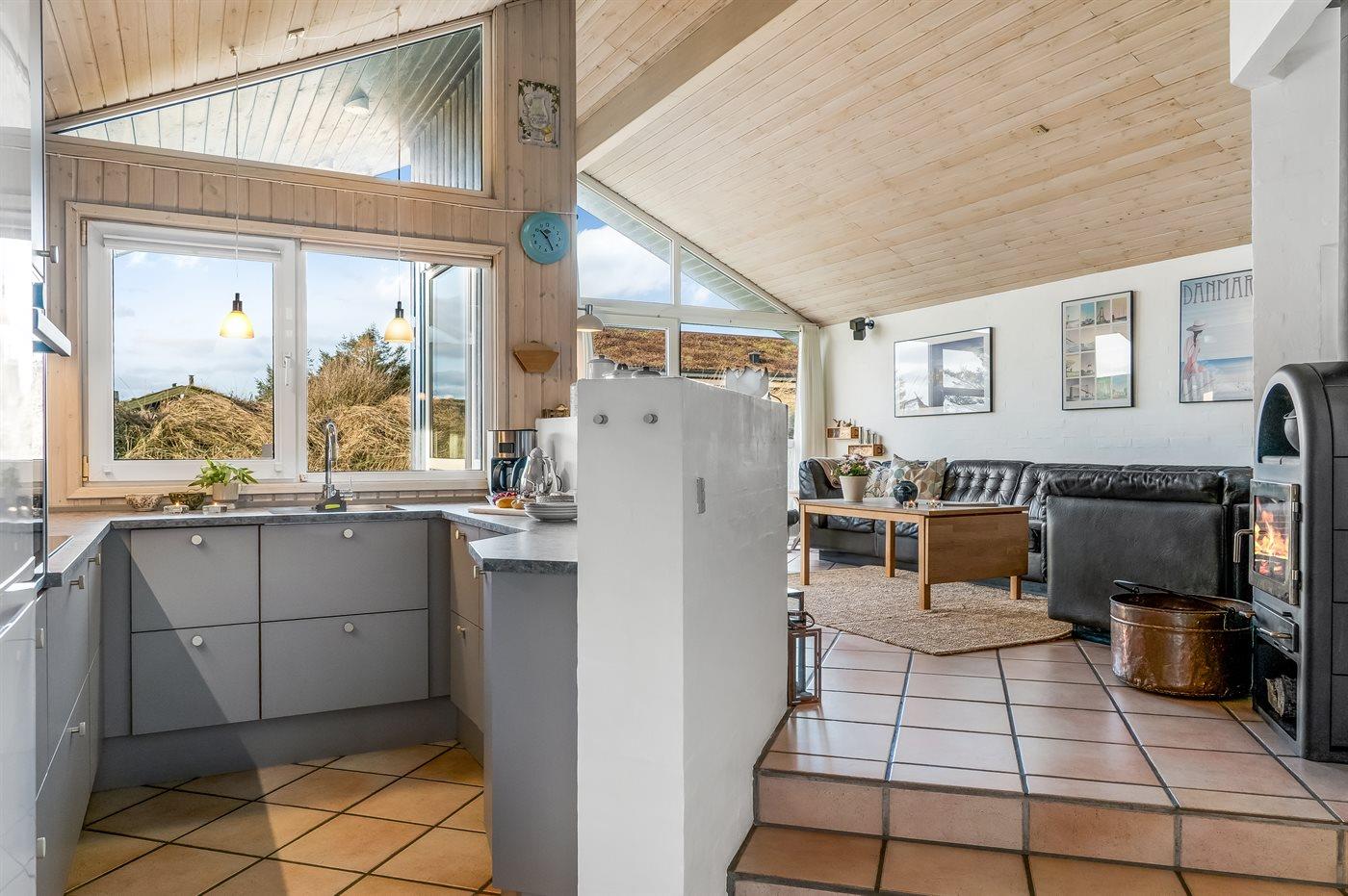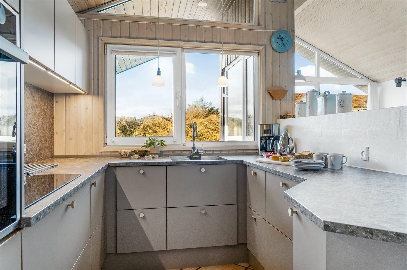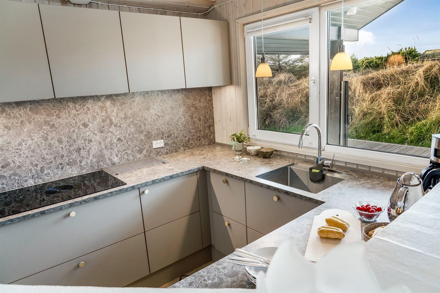 Køkkenet er udstyret med 1 køleskab. Der er 4 keramiske kogeplader, bageovn, mikrobølgeovn samt opvaskemaskine.