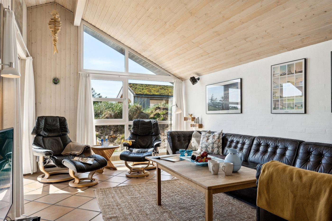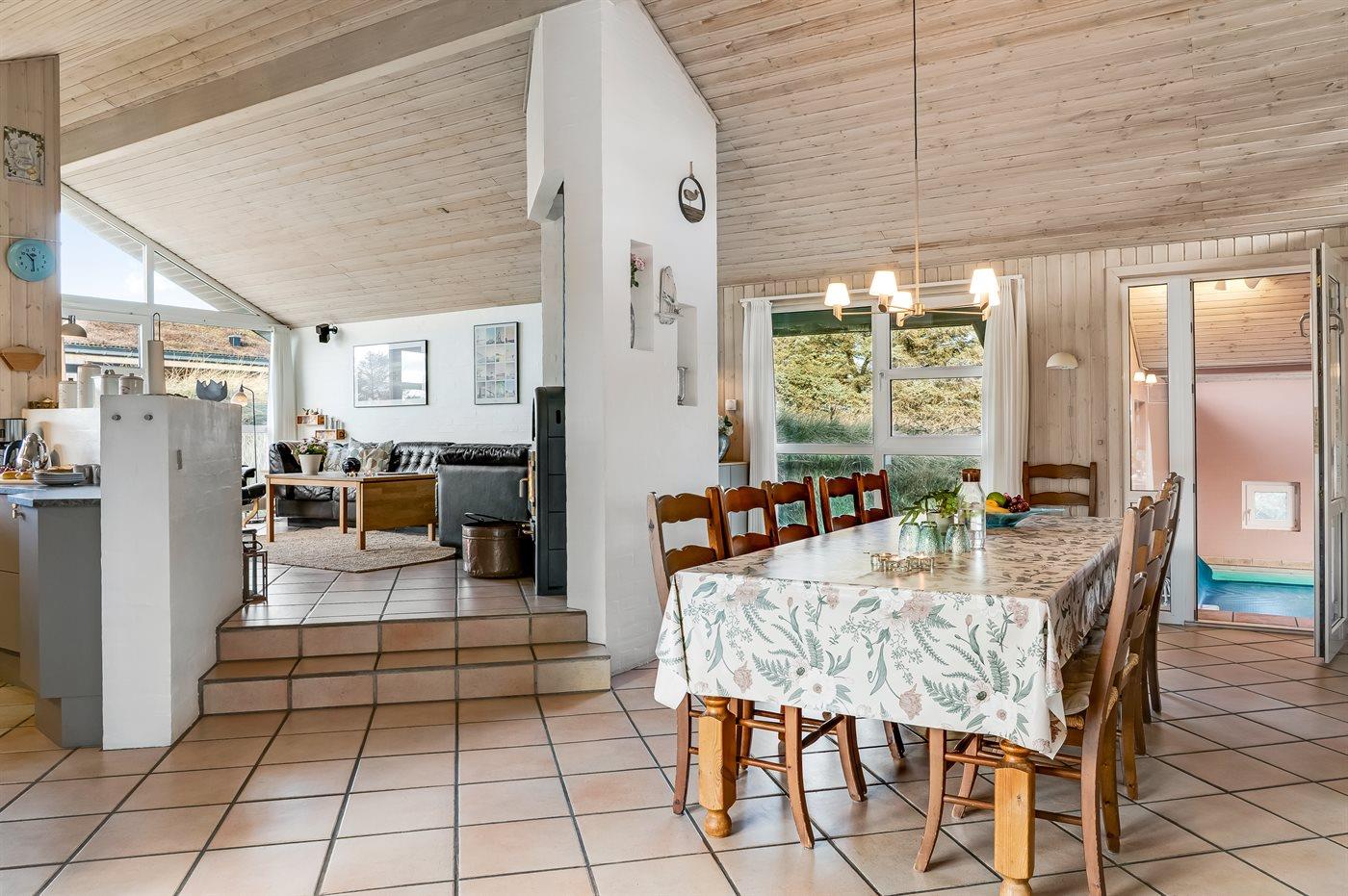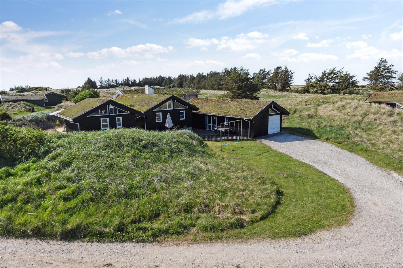 I rolige omgivelser finder I dette attraktive og miljørigtige sommerhus, der er bygget i giftfrie materialer. Huset ligger kun 800 m fra det dejlige Vesterhav og en af Danmarks bedste badestrande, der let nåes via et godt stisystem. Samlingspunktet i huset er poolafdelingen. Dejlig spiseafdeling, hvorfra det er muligt at se ind i poolafdelingen. På husets hems findes TV (ingen antennemodtagelse).