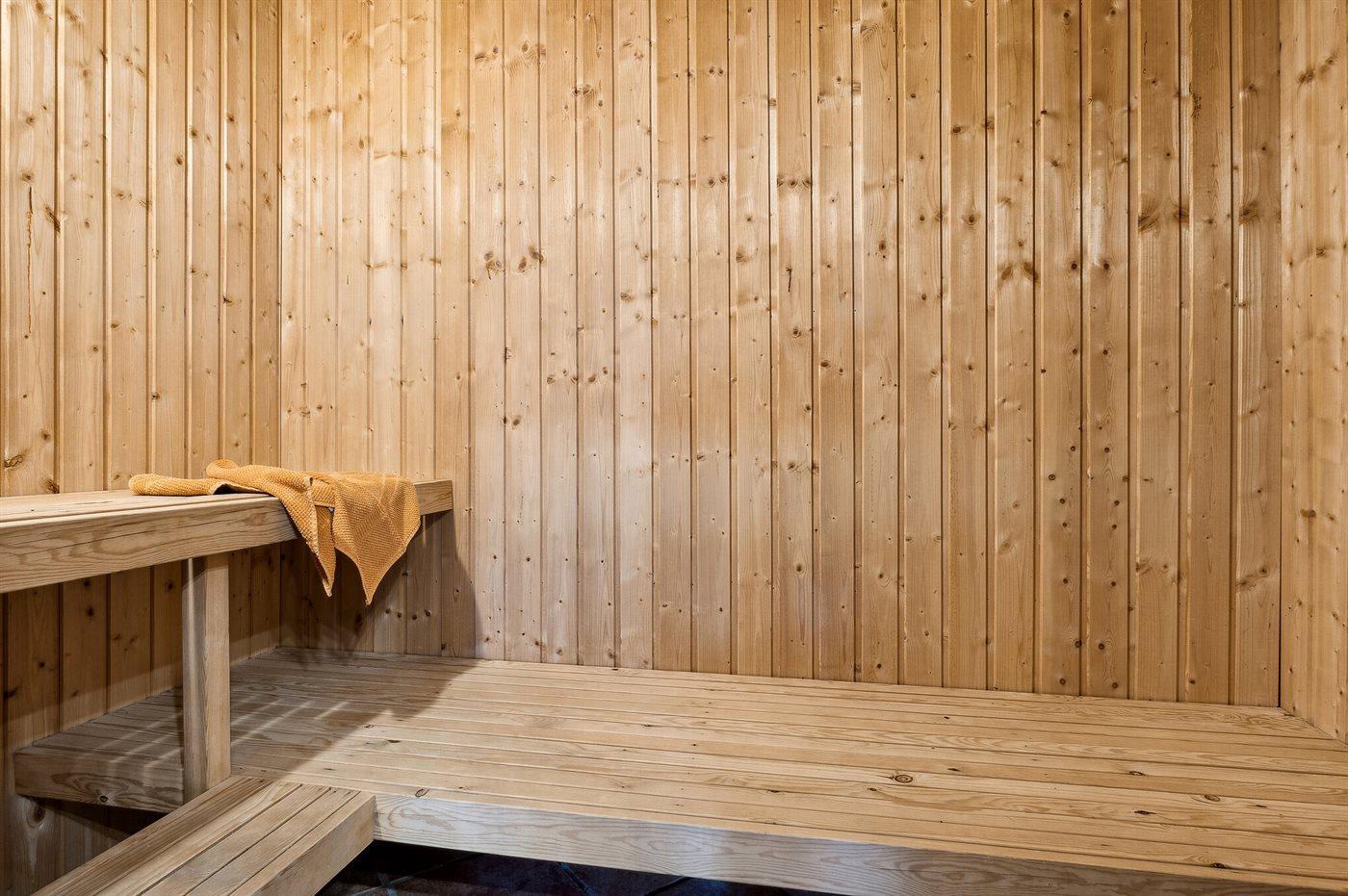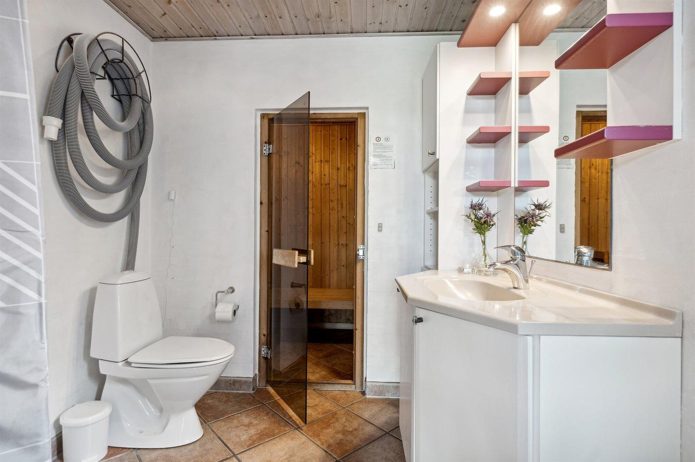 Der er 2 badeværelser med bruseniche og 2 toiletter. Der er gulvvarme på 1 badeværelse. I saunaen er der mulighed for afslapning.