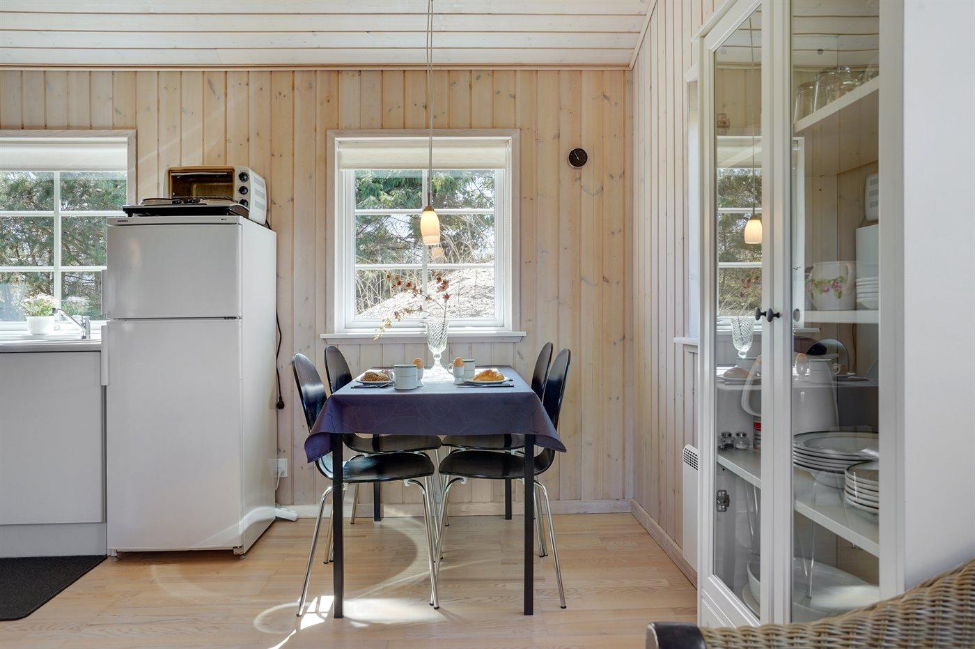 Køkkenet er udstyret med 1 køleskab. Der er 2 elkogeplader, miniovn.