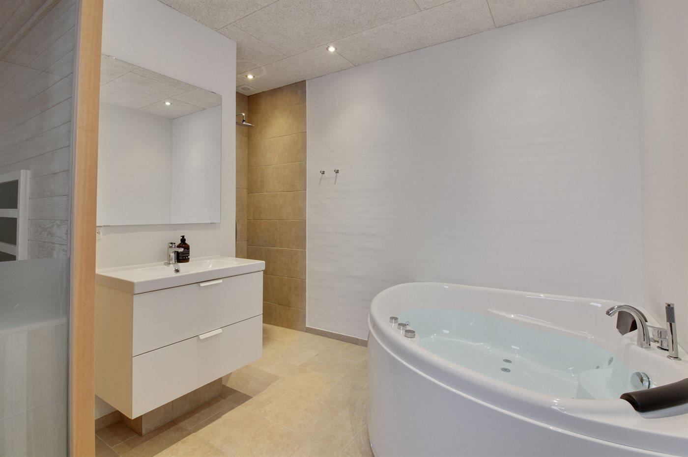 Der er 2 badeværelser med bruseniche og 2 toiletter. Der er gulvvarme på 2 badeværelser. I saunaen er der mulighed for afslapning.