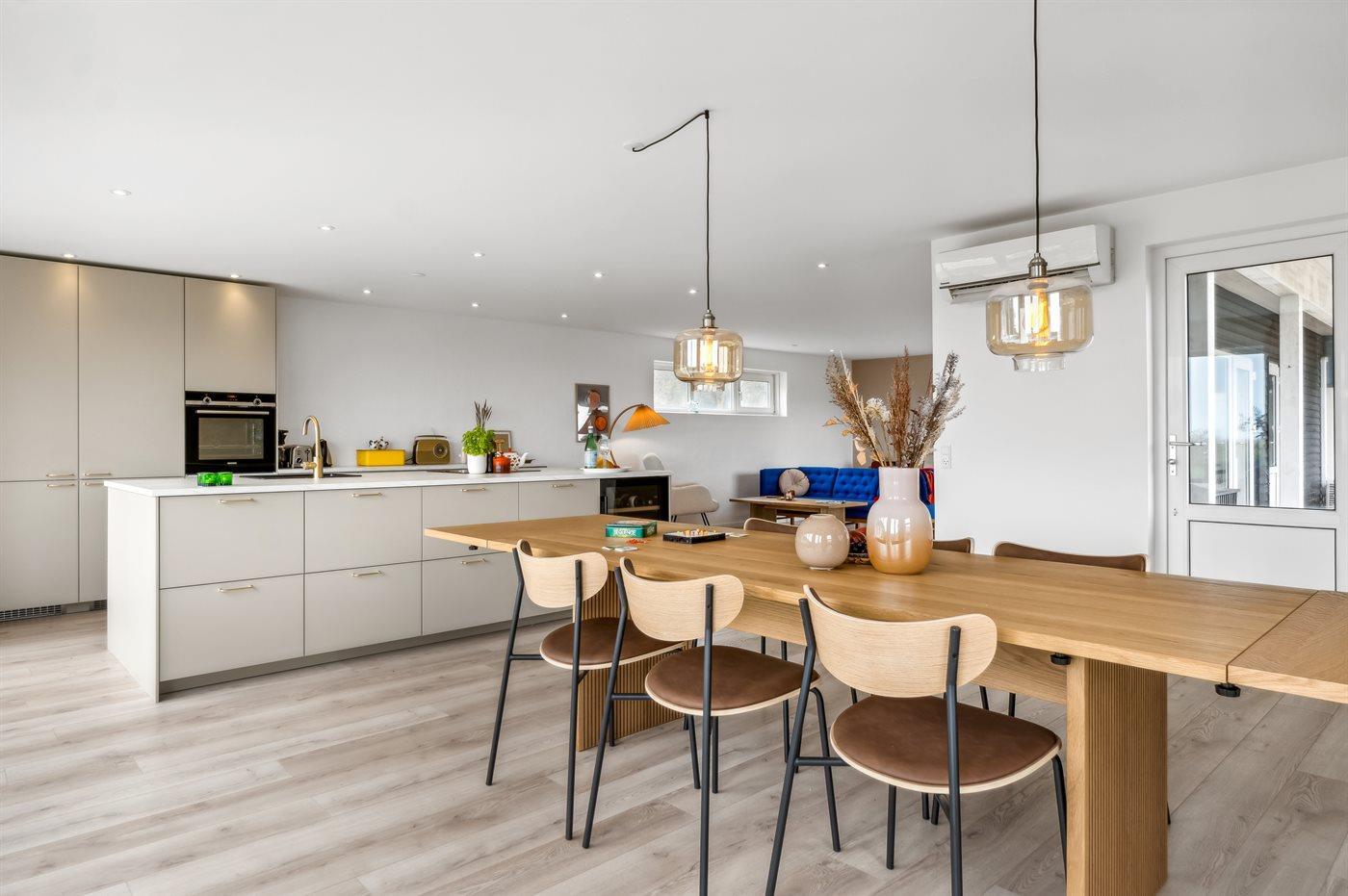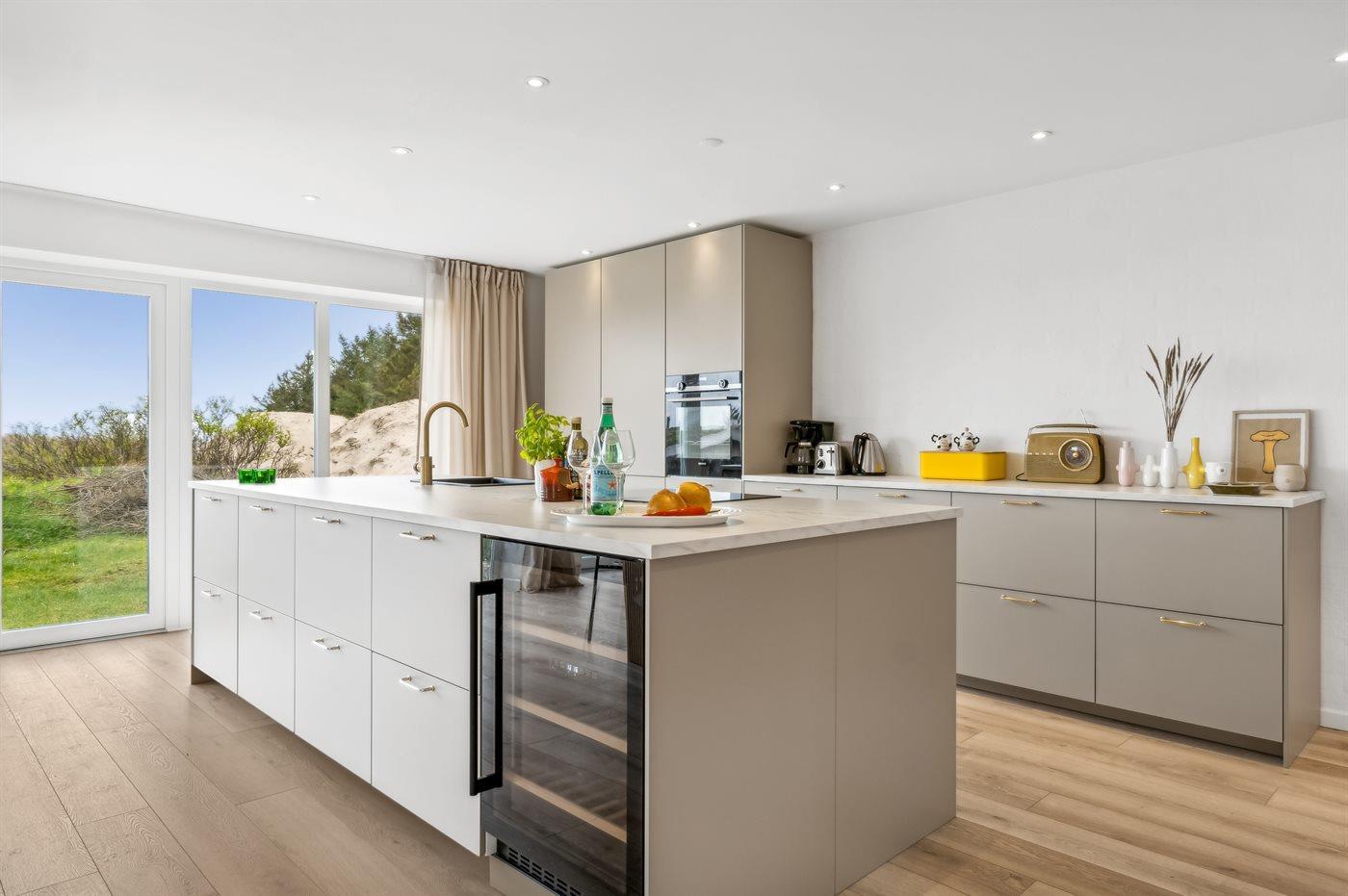 Køkkenet er udstyret med 2 køleskabe. Der er 4 keramiske kogeplader, varmluftovn, mikrobølgeovn samt opvaskemaskine.