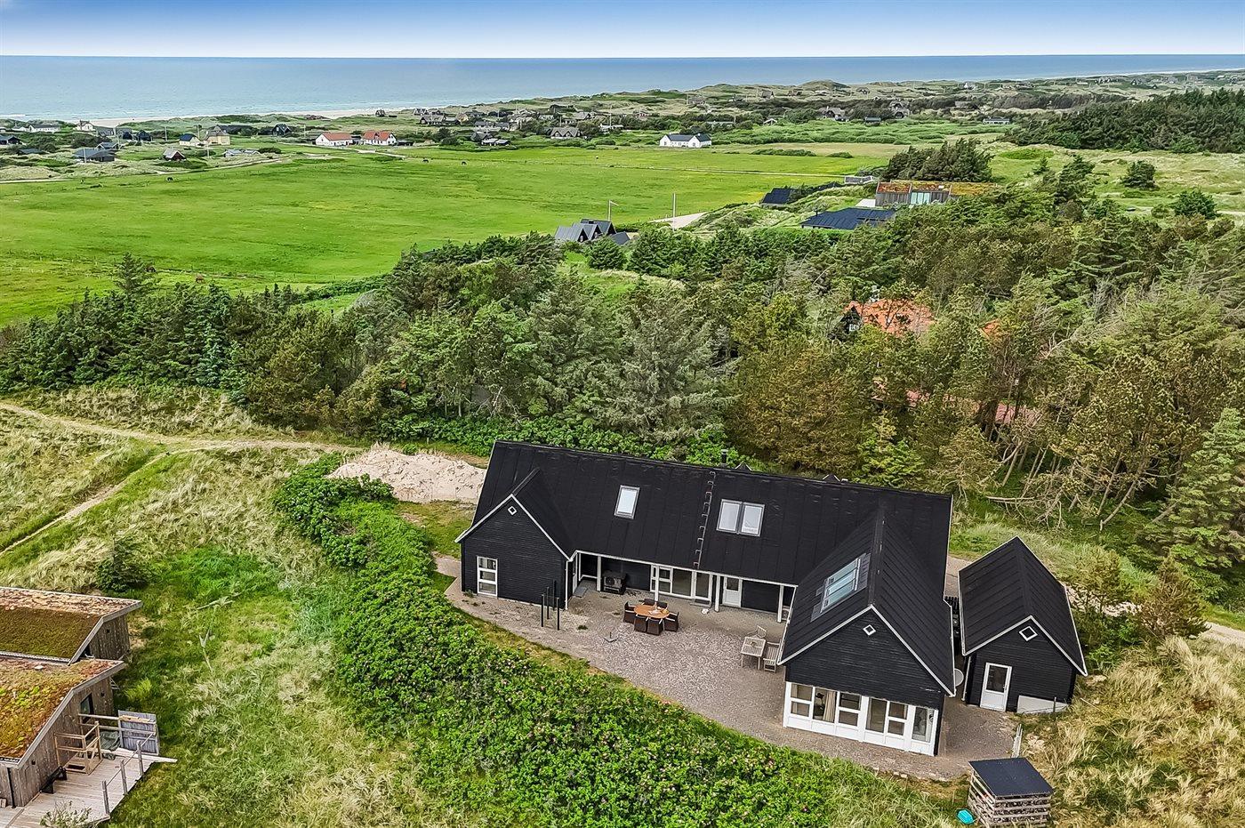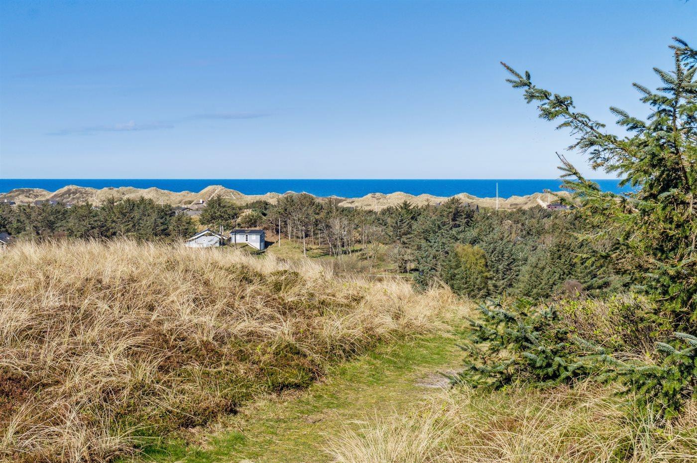 Ferieboligen er beliggende på en 2500 m² stor klitgrund. Der er 900 m til havet. Nærmeste forretning er beliggende i en afstand af 2700 m. Der er en golfbane i en afstand af 6000 m. Til ferieboligen hører 150 m² terrasseareal. Grill til rådighed. Der er installeret stik til opladning af elbil. Type 2 stik. Med 11 kW ladeeffekt. Parkering ved ferieboligen.