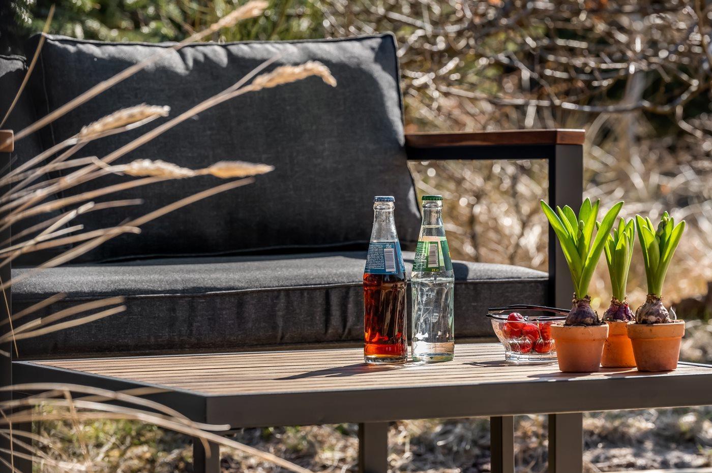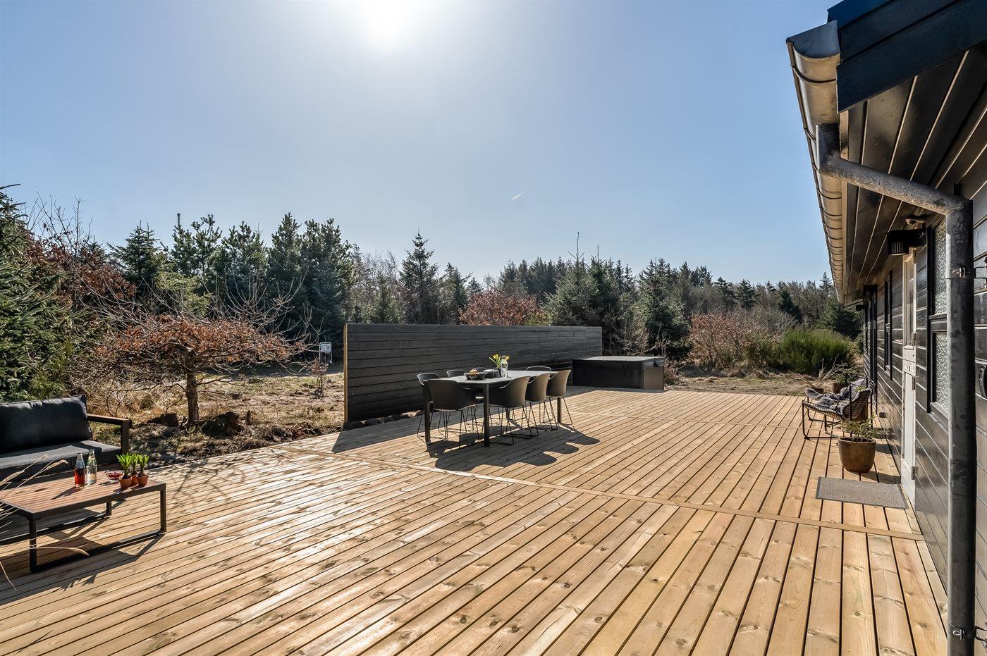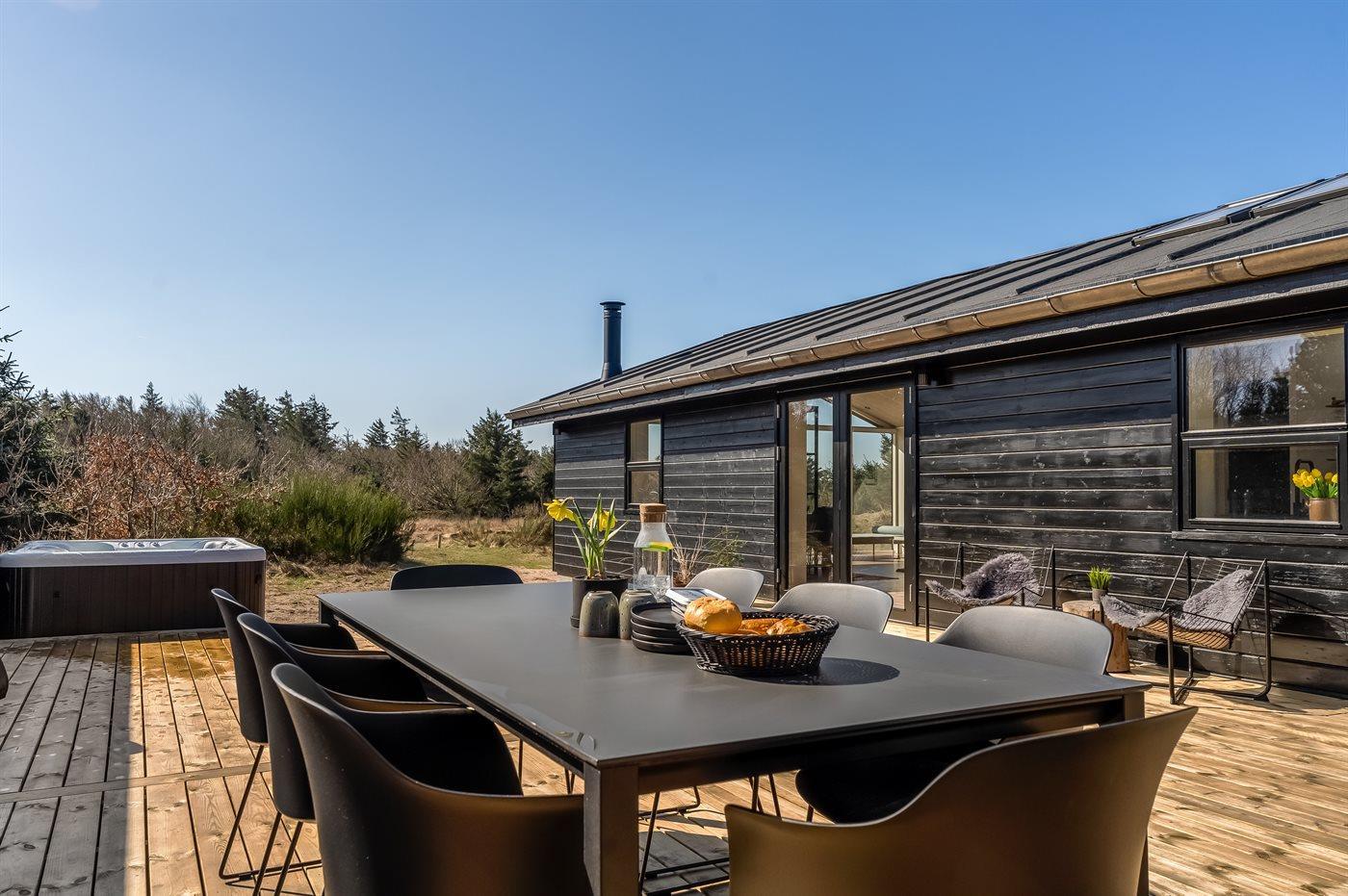Den store terrasse er den perfekte ramme om de lange sommeraftener. Her finder du en lækker udendørs spa – ideel til at slappe af efter en aktiv dag i naturen.