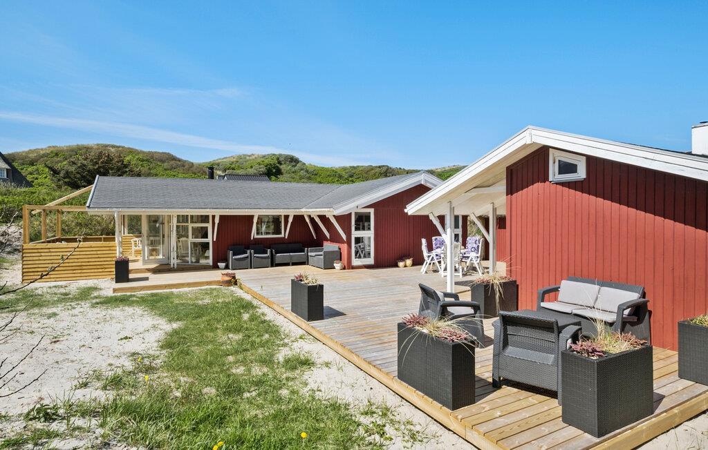 Hold en afslappende ferie i jeres feriehus, som er noget særligt med sit attraktive interiør og rummelige udendørsområde. Den rolige beliggenhed nær Vesterhavet og de beskyttede terrasseområder skaber de bedste betingelser for en vellykket ferie. Den åbne opholdsstue har synlige bjælker i loftet, trægulve og smukke møbler. Find jer godt til rette i sofaen foran brændeovnen eller nyd dagens måltider i den tilstødende spisestue. Køkkenet er funktionelt indrettet og passer hyggelig ind i rummet, oplagt til hyggelige madlavningsaftener.