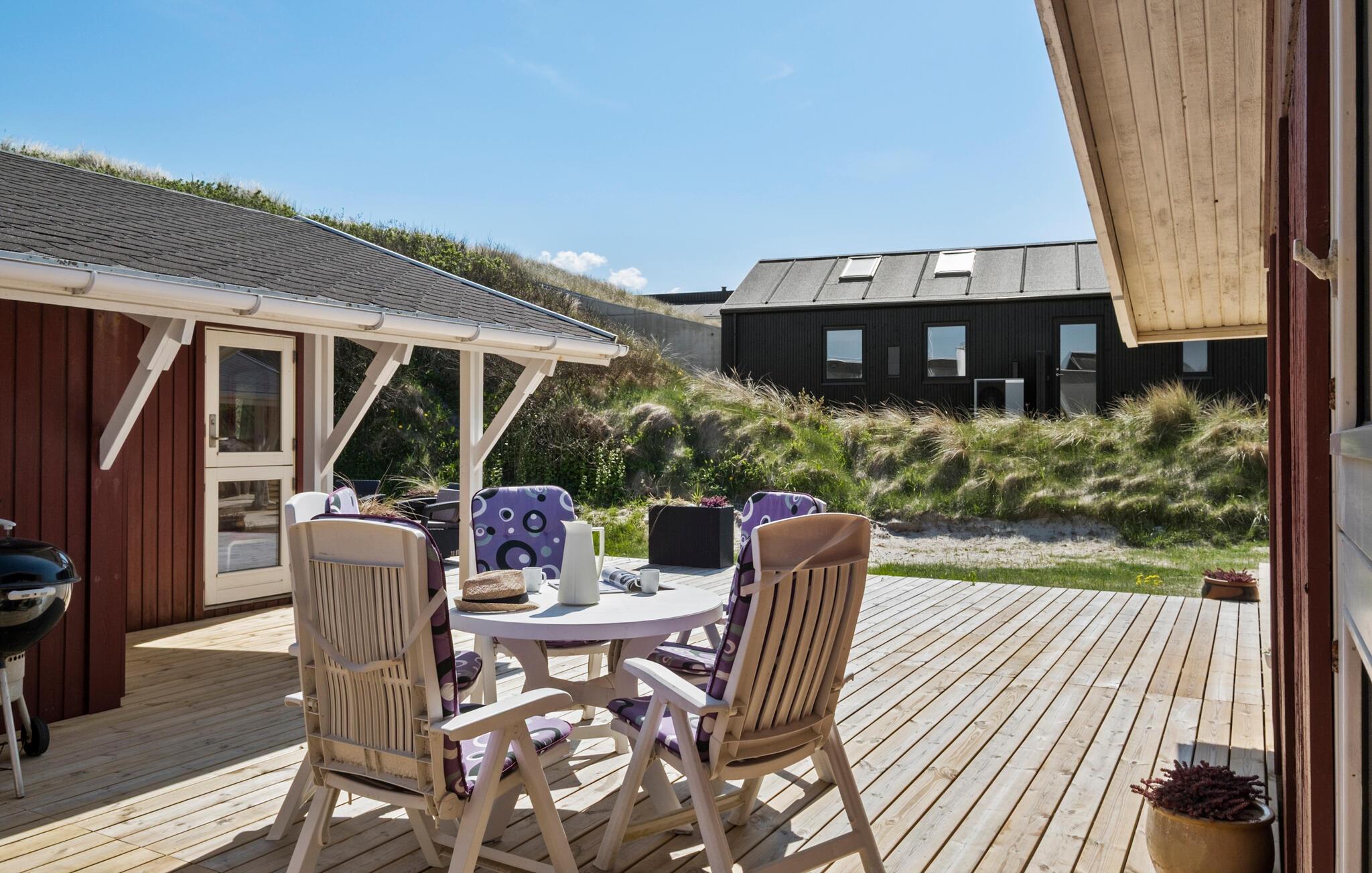 Slap af i det vindbeskyttede udendørsområde med flere terrasseområder, forskellige siddegrupper og masser af plads til solbadning eller grillning. Den rummelige træterrasse forbinder hovedhuset og udhuset og skaber en beskyttet gårdhave. Slap af på den overdækkede veranda og nyd udsigten over klitlandskabet.