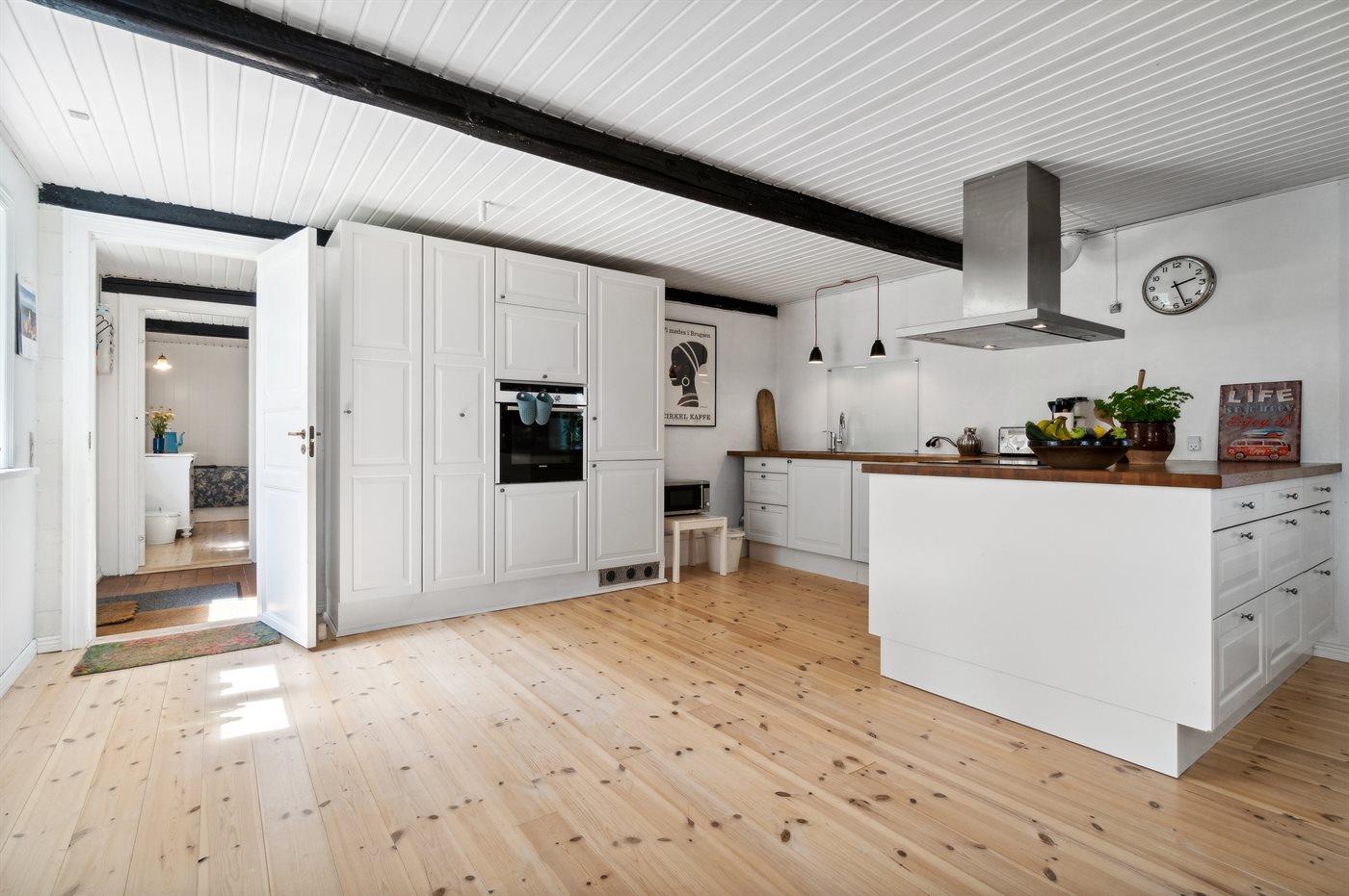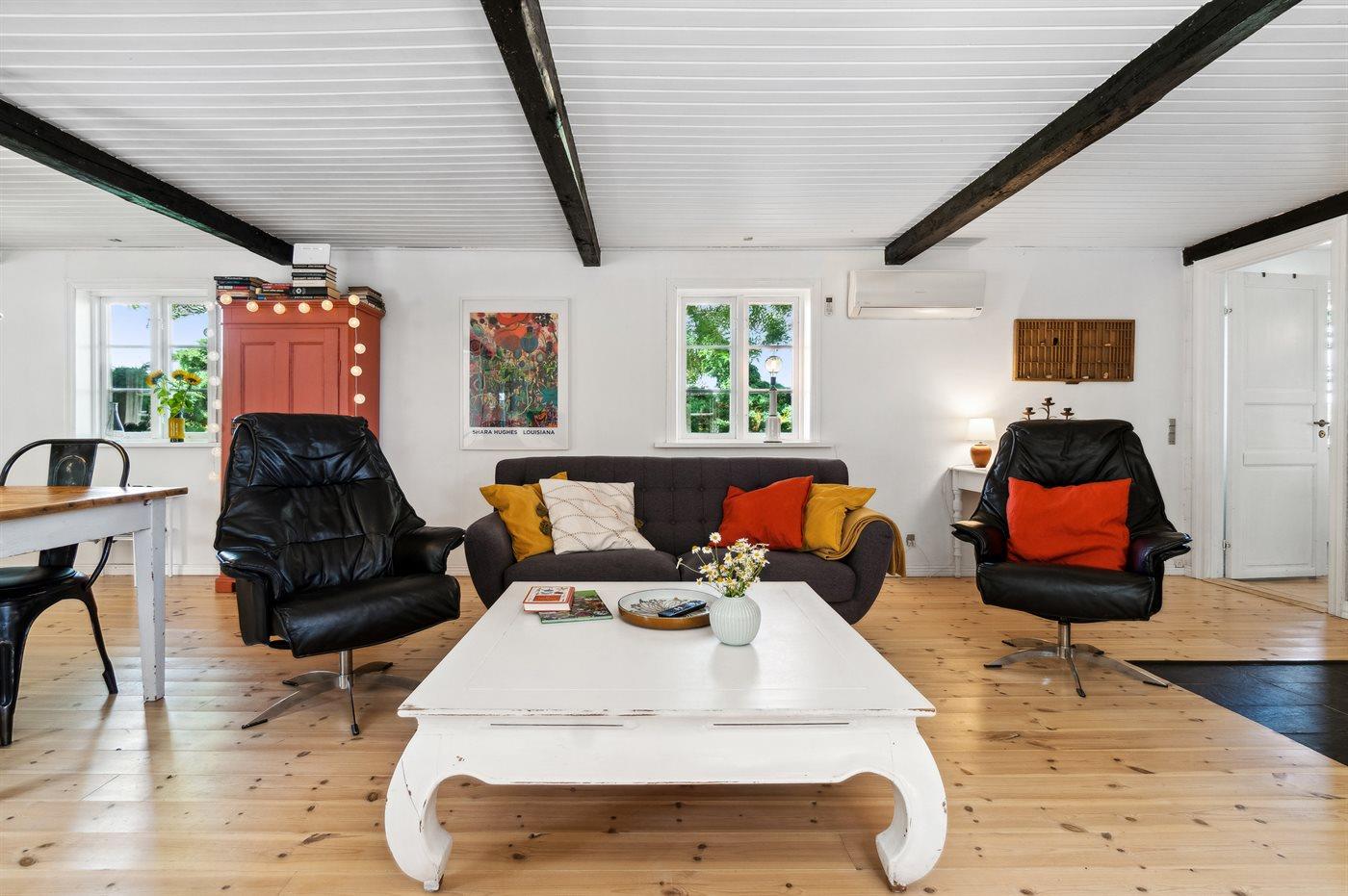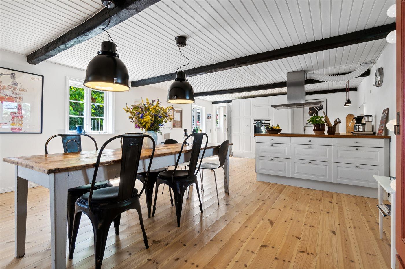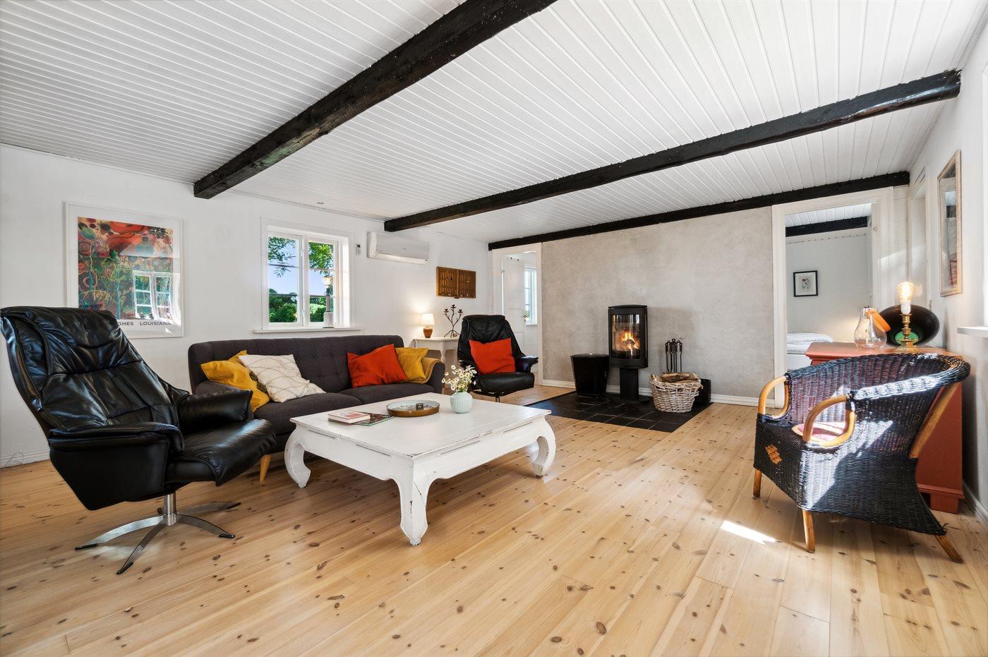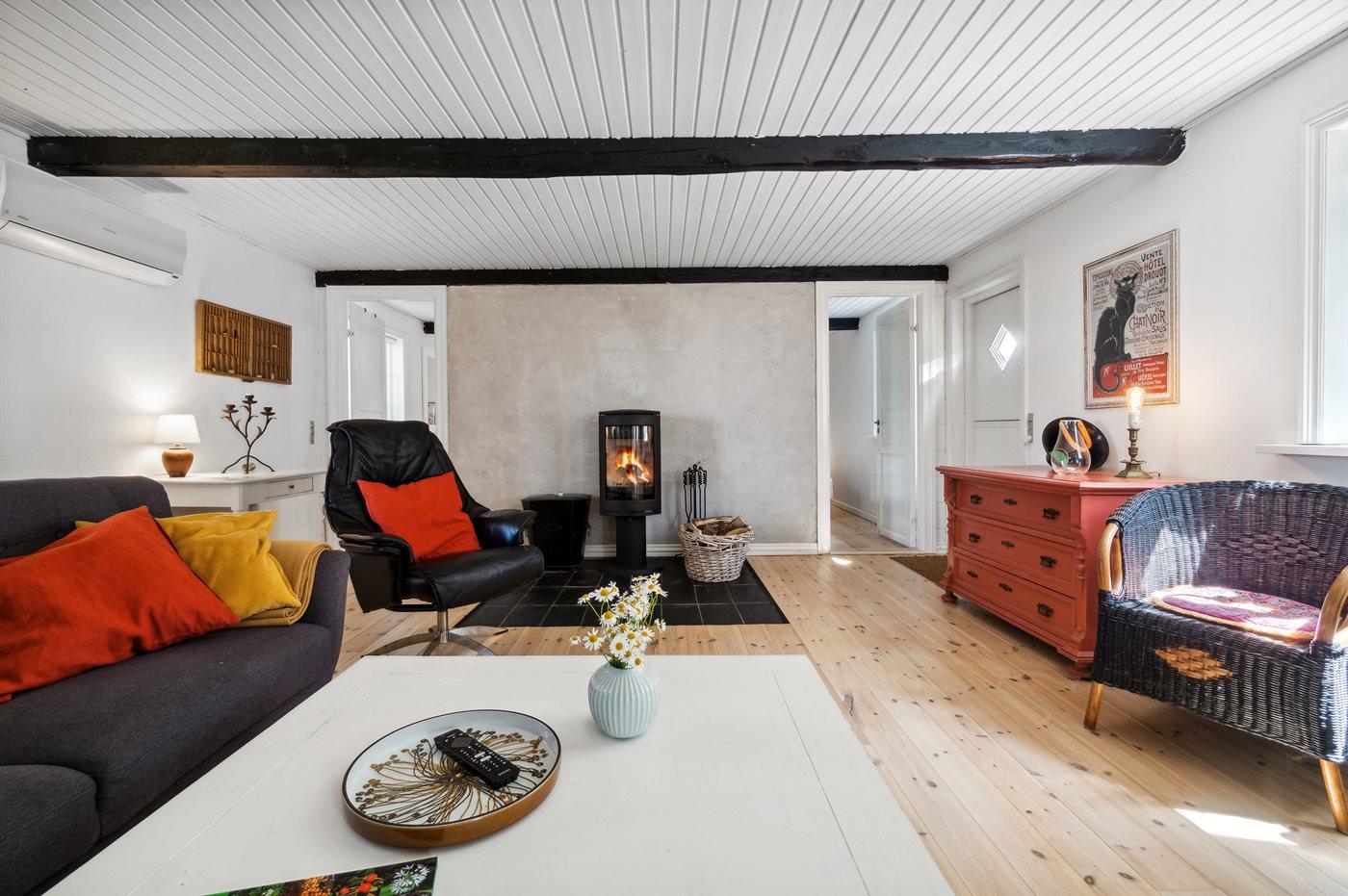 Huset, der ligger idyllisk, rummer tre soveværelser og et pænt badeværelse. Stor stue med køkkenafdeling med masser af plads - hvor man mærker, at huset er gennemrenoveret i 2021 med fritliggende bjælker, så det hele emmer af charme og sjæl.