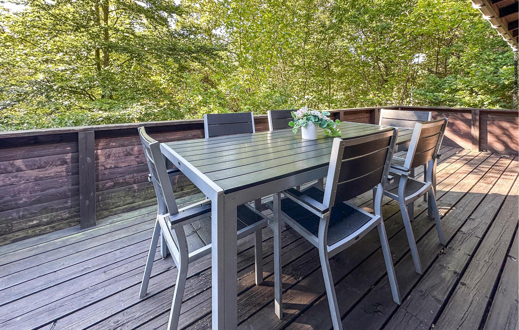 Træd ud på den store, delvist overdækkede træterrasse, og lyt til skovens lyde. Nyd morgenkaffen i den friske luft, eller brug de lune sommeraftener på at grille. Naturgrunden giver jer masser af privatliv og plads til afslapning.