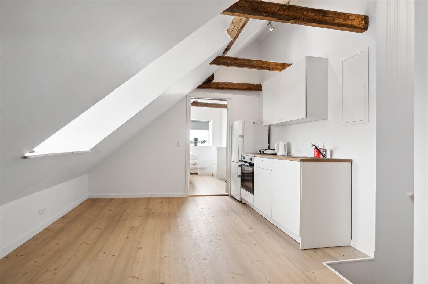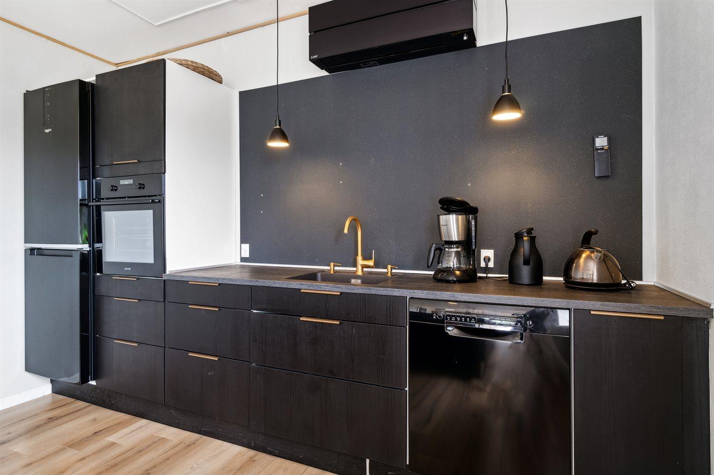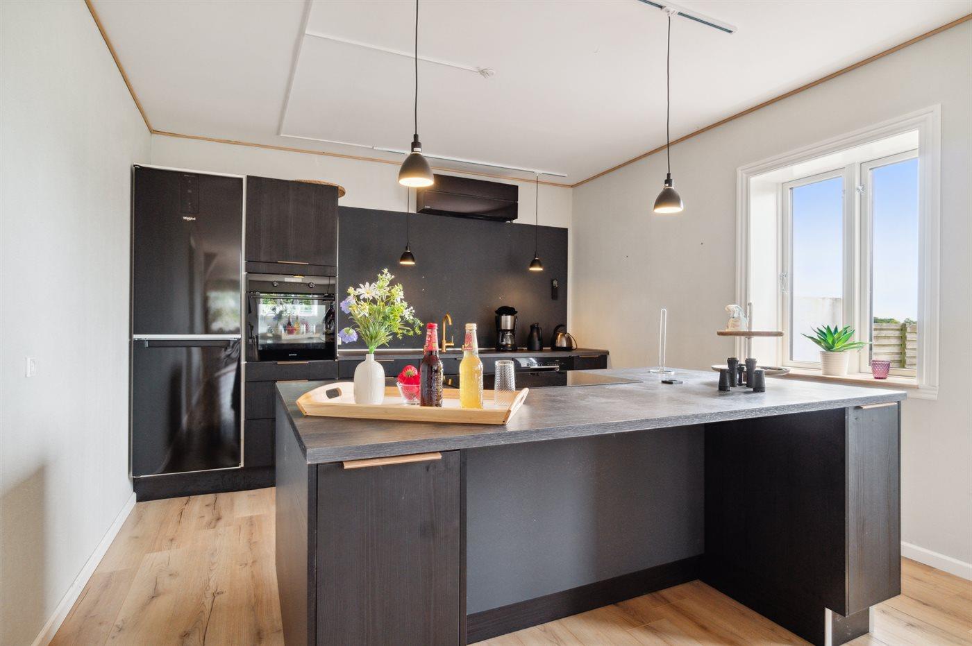 Køkkenet er udstyret med 1 køleskab. Der er 4 keramiske kogeplader, varmluftovn, mikrobølgeovn samt opvaskemaskine.