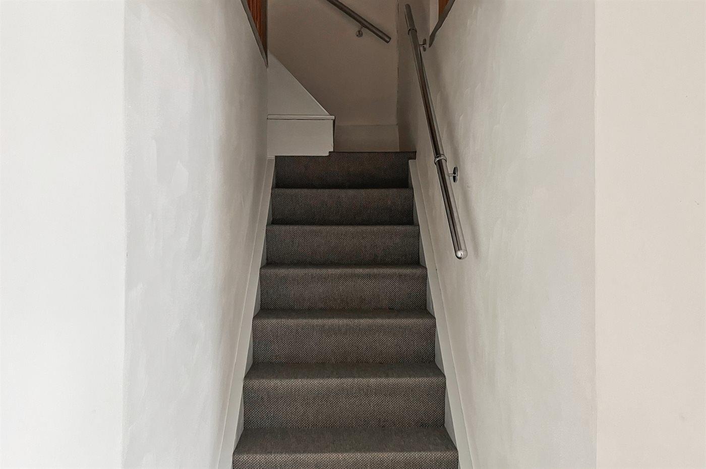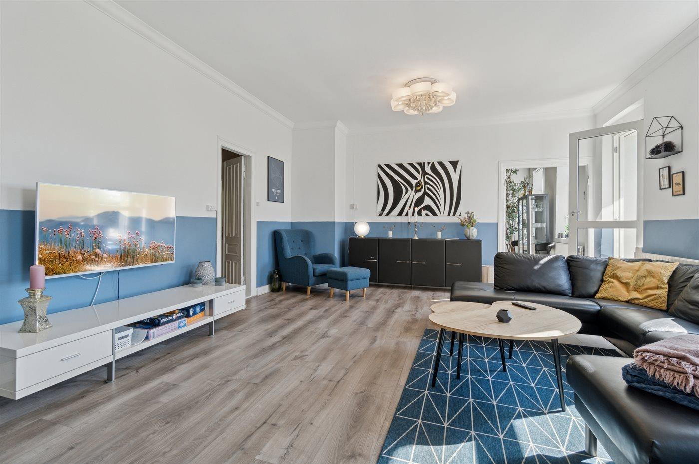 Den store grund har et parkpræg med indkørsel og parkering indenfor den stilmæssige port ud til vejen.