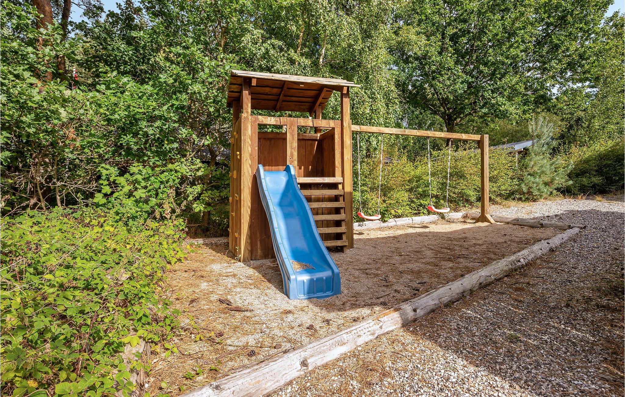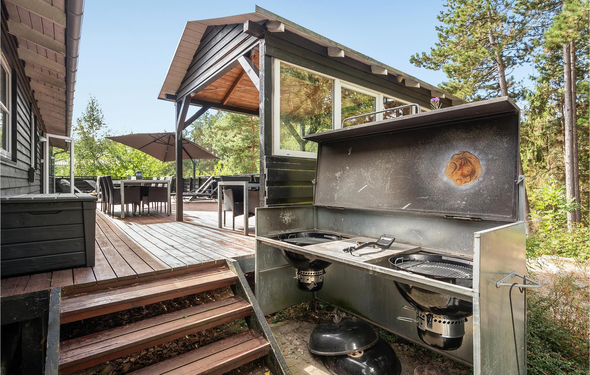Fra det store opholdsrum er der udgang til den store terrasse, hvor den flotte udsigt til skov og natur kan nydes i gode havemøbler og overdækket spiseplads med terassevarmere. På den store naturgrund, der omkranser huset, er der også tænkt på de mindste gæster med legetårn med klatrevæg, rutsjebane gynger og sandkasse