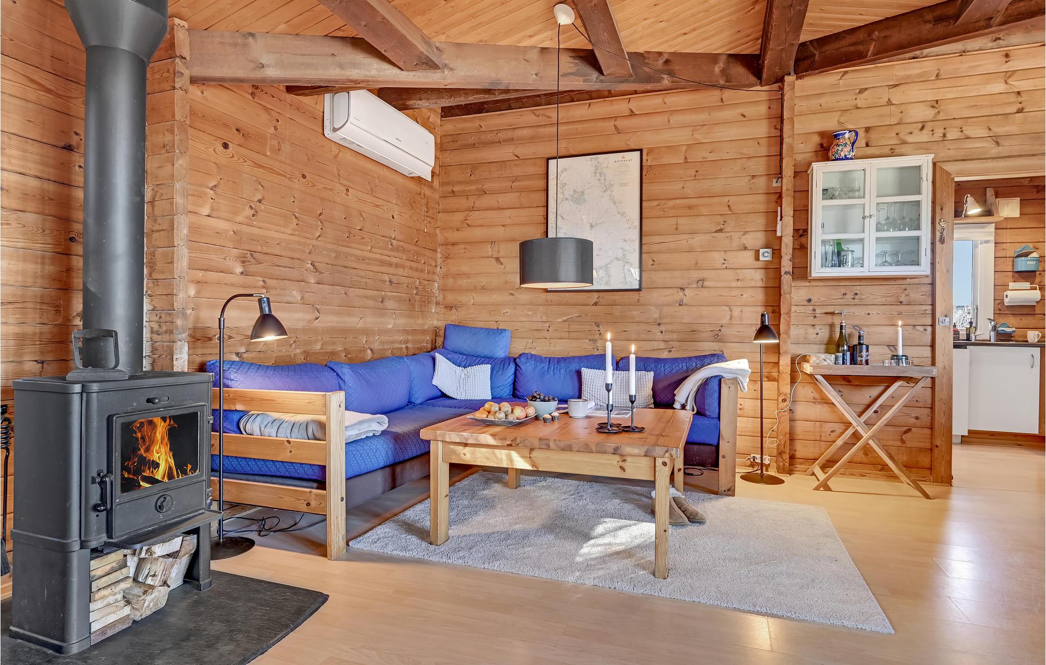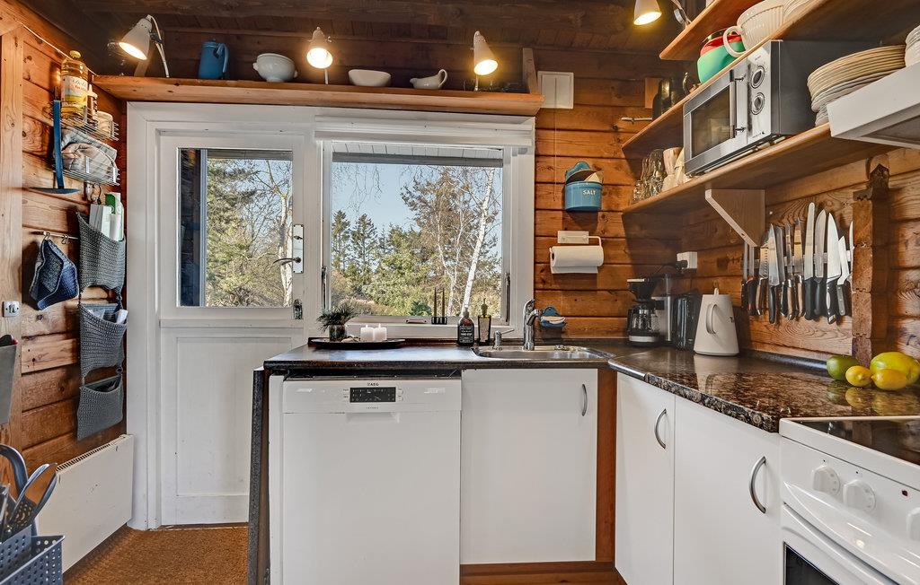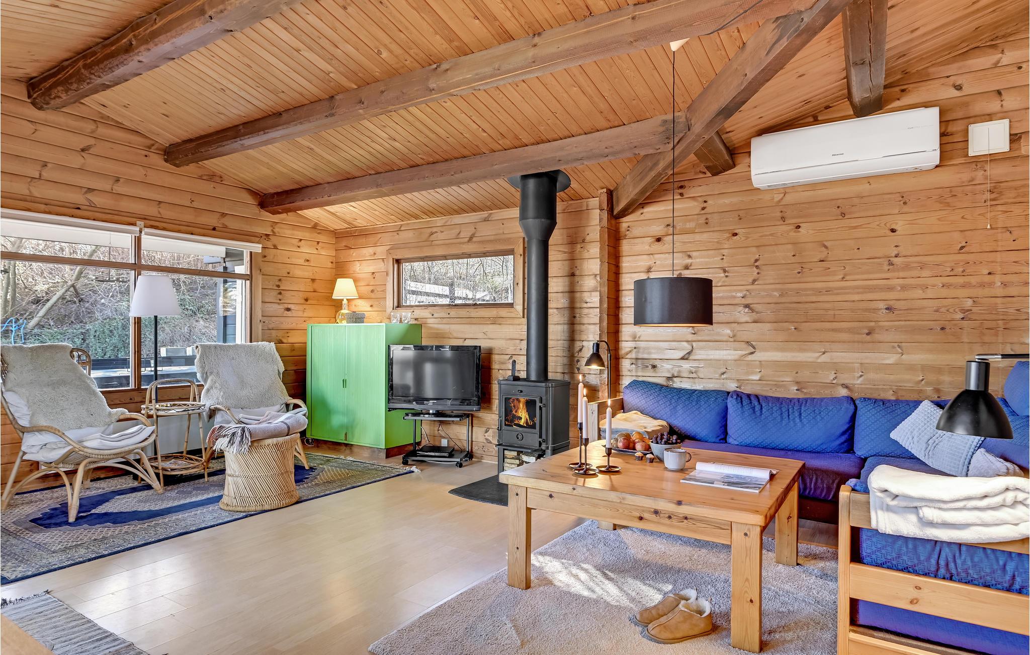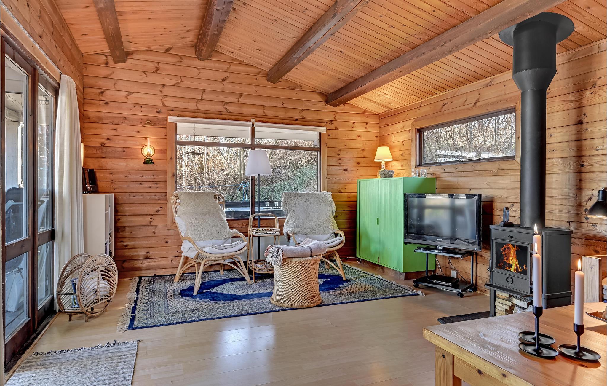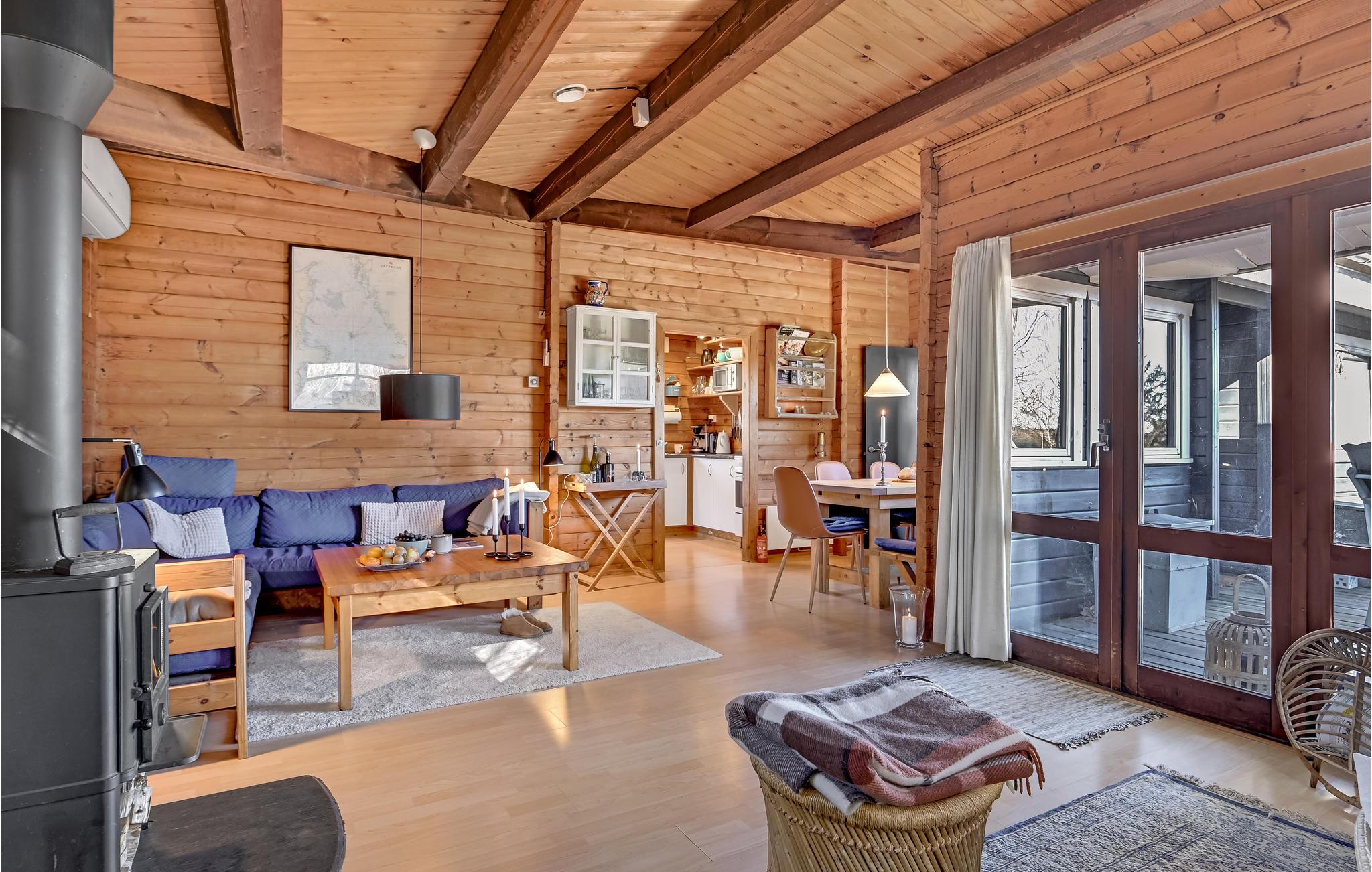 I dette dejlige træhus venter til en hjemling og varm indretning, hvor I kan se frem til en skøn ferie i rolige omgivelser. Køkkenet er veludstyret, og her kan I smide nogle lækre retter sammen, som I kan nyde i den rummelige stue eller i grønne omgivelser på terrassen. I stuen kan I slappe helt af efter en begivenhedsrig dag, mens ilden gnitrer i brændeovnen.